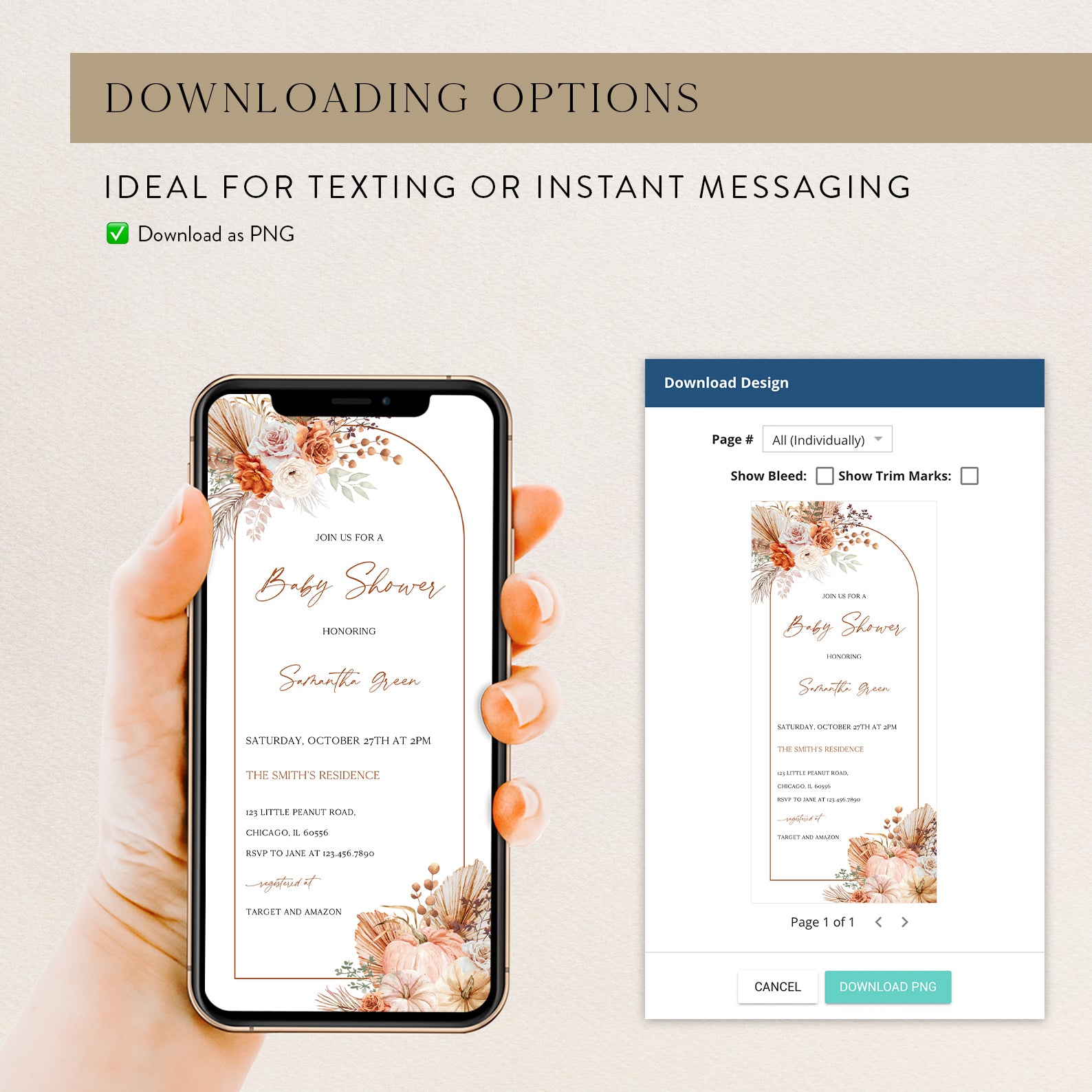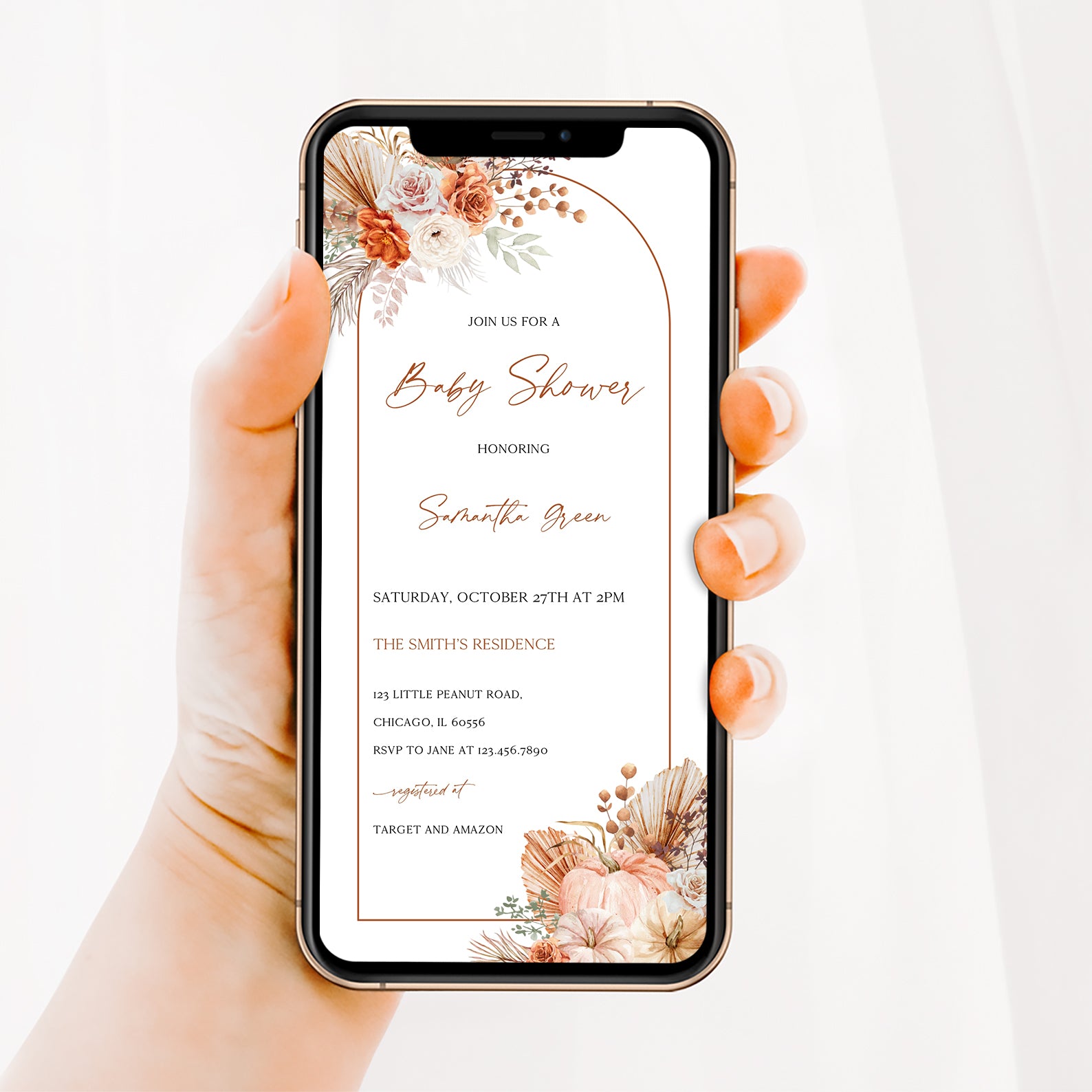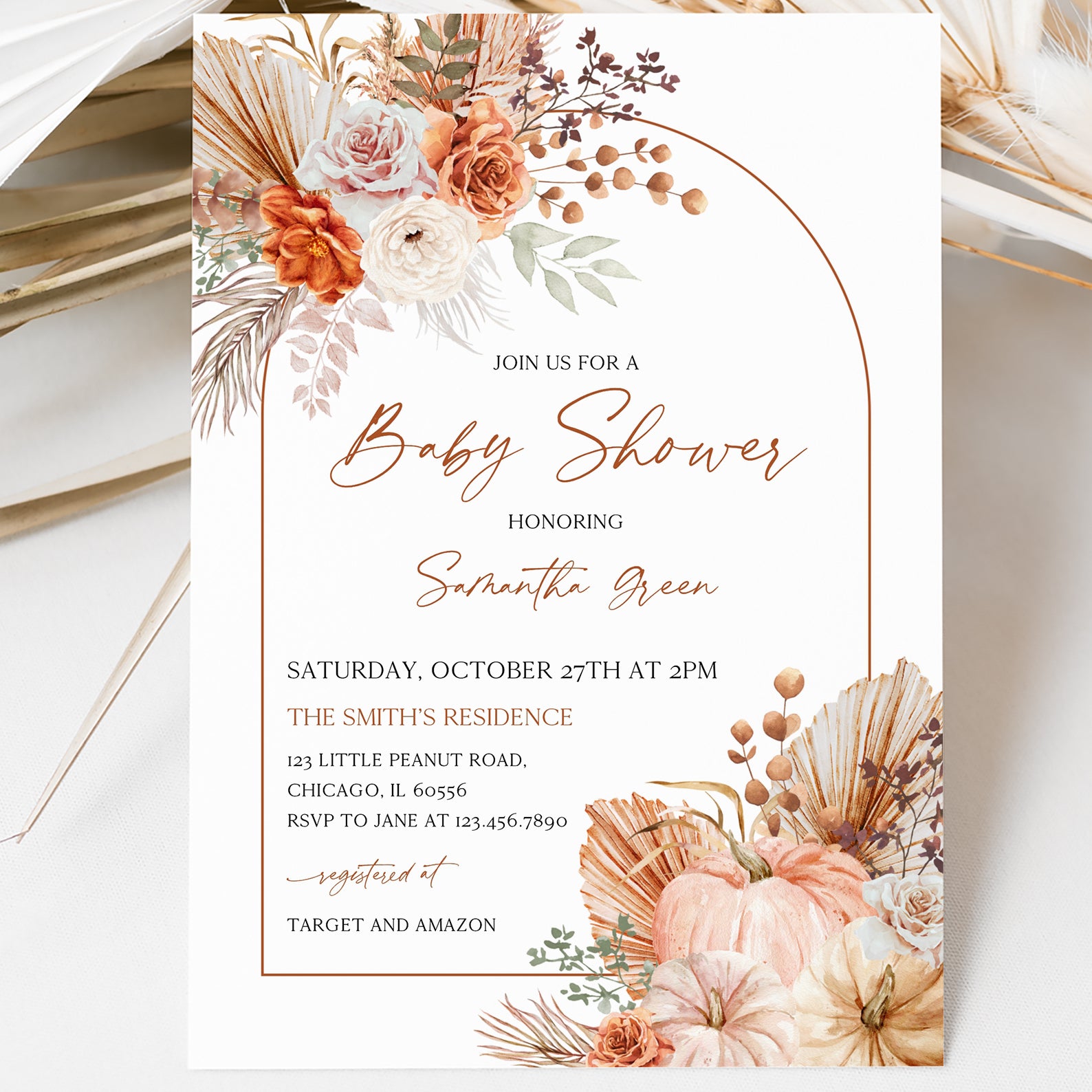 Welcome your little one with our elegant baby shower digital invitation, featuring a boho bouquet in the top left corner. The soft watercolor pumpkins in pink and desert sand, paired with delicate autumn leaves in the bottom right, set a warm and inviting tone for your celebration. This design combines modern simplicity with seasonal charm, making it a perfect choice for your joyful occasion.