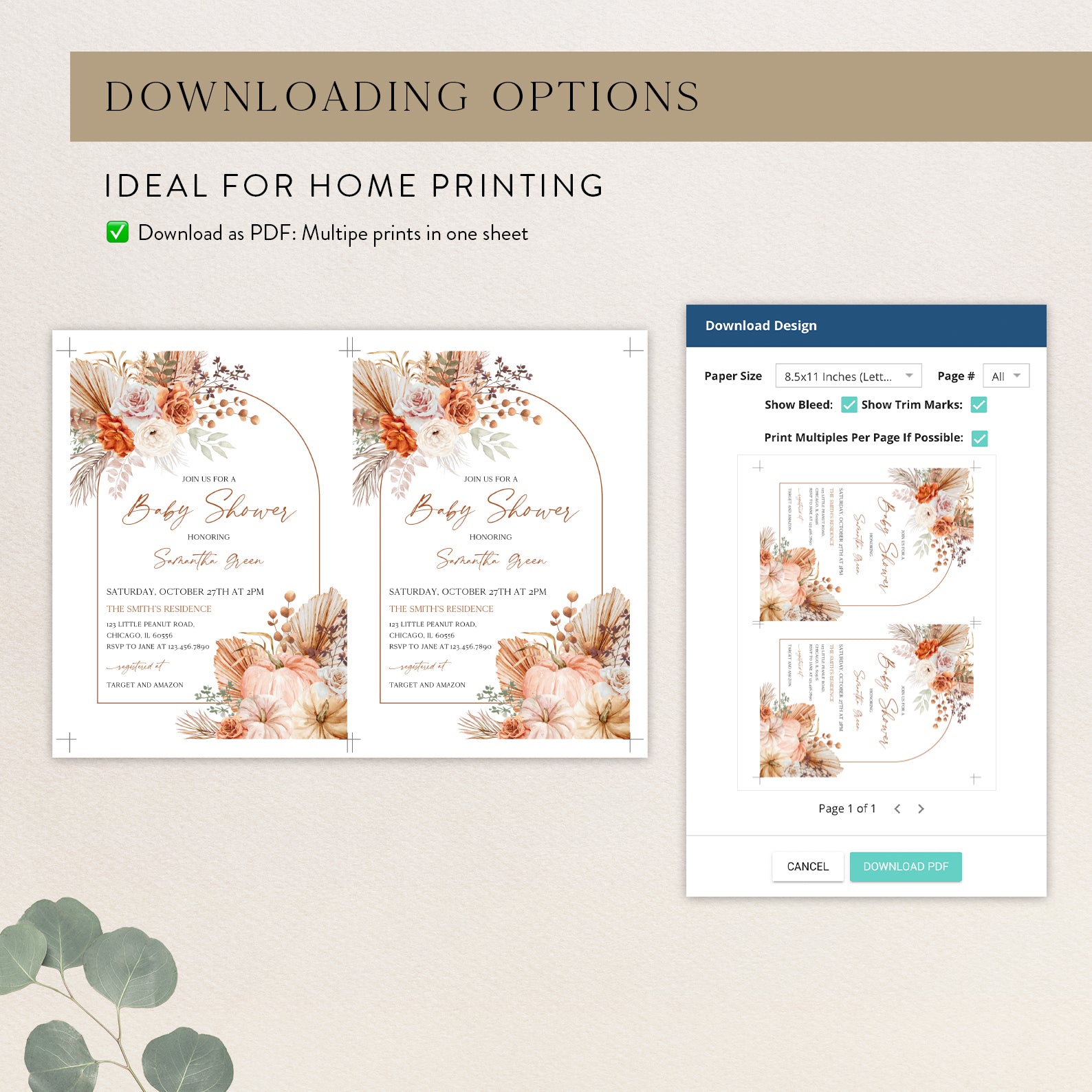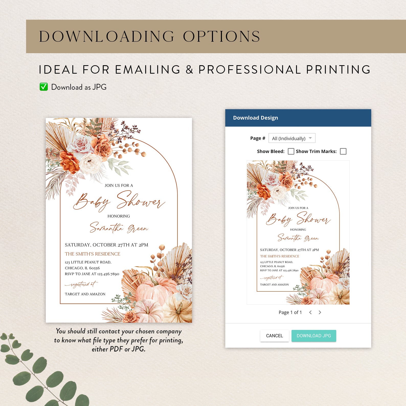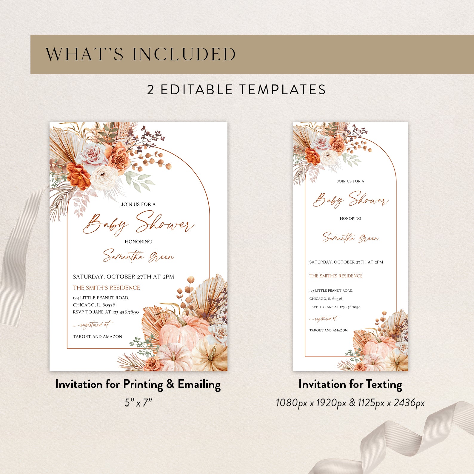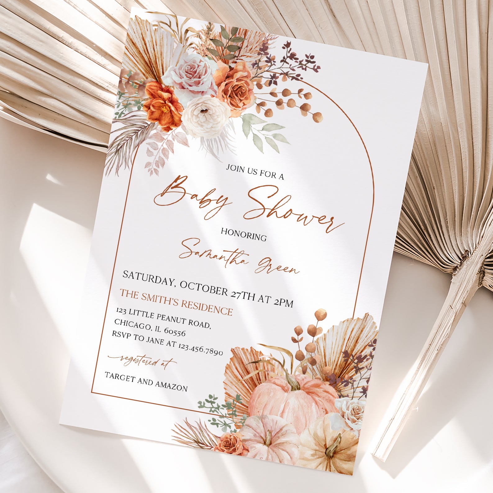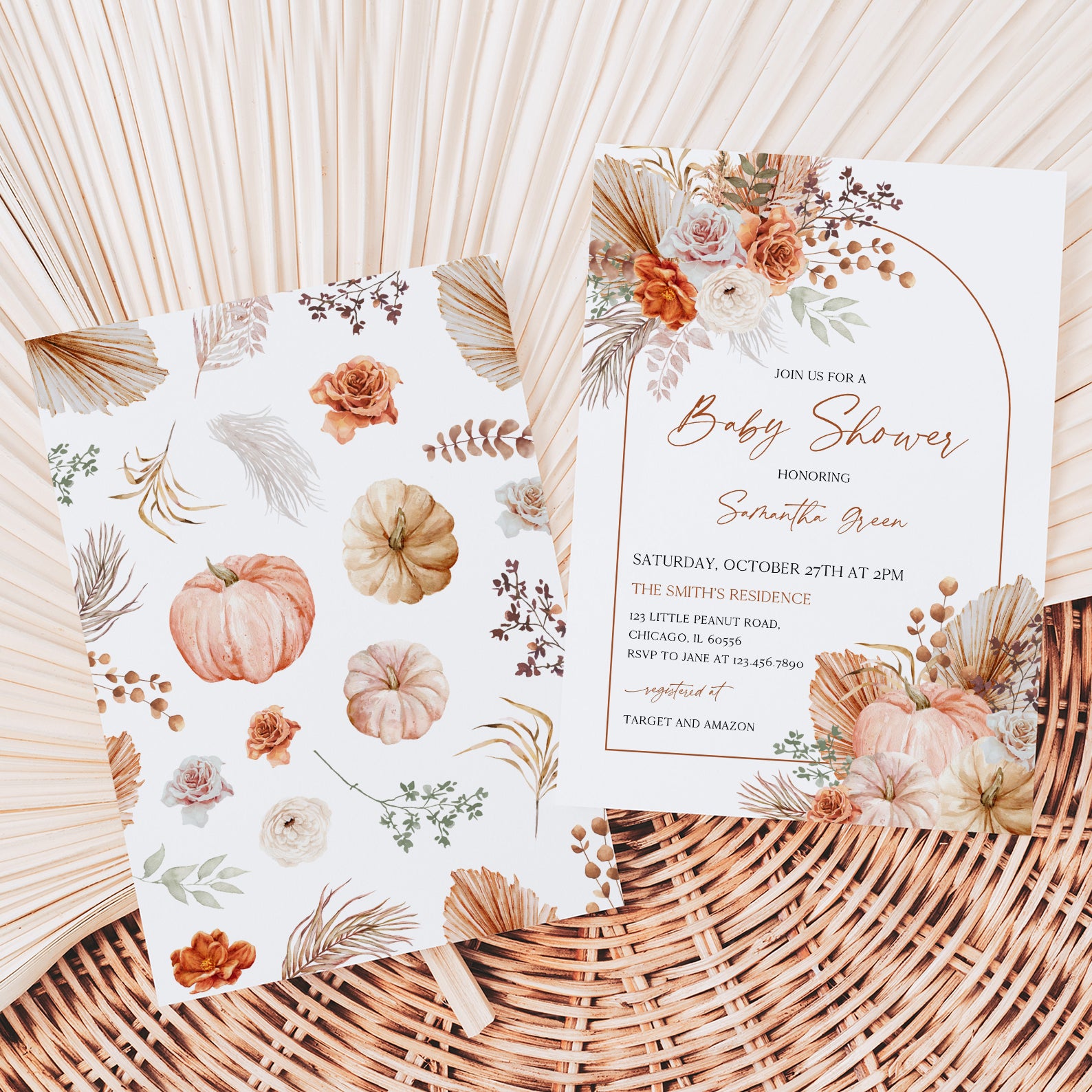 - Purchase this Boho Watercolor Pumpkin Baby Shower Invite with Autumn Leaves template