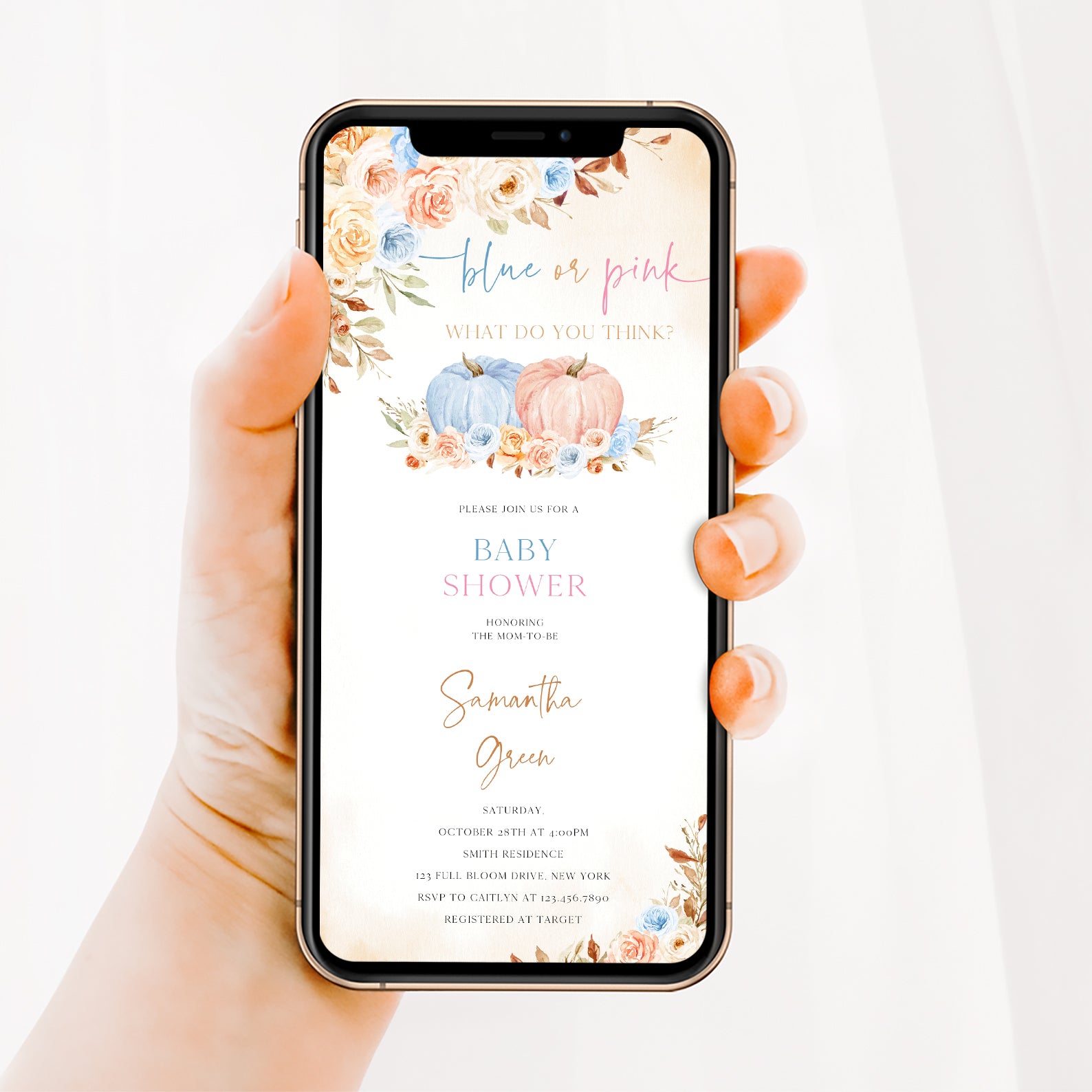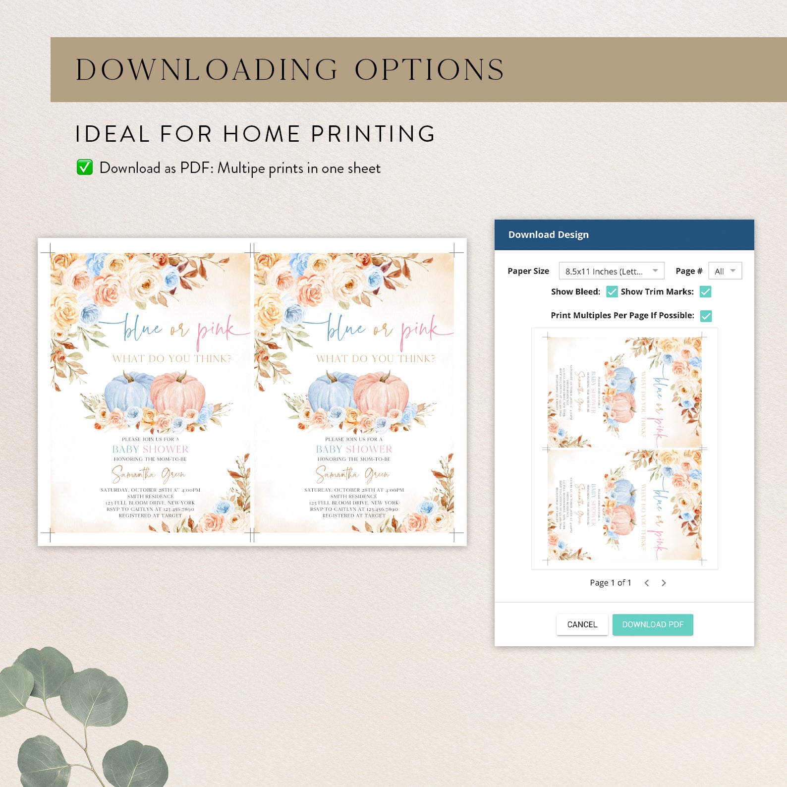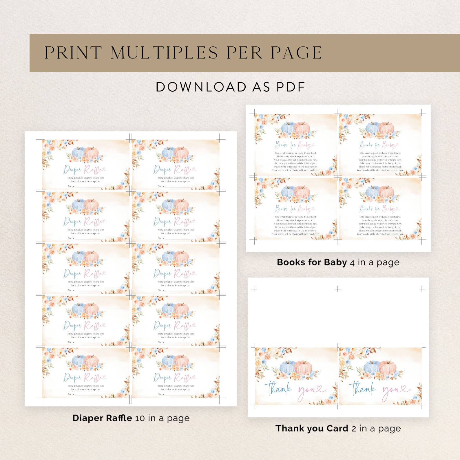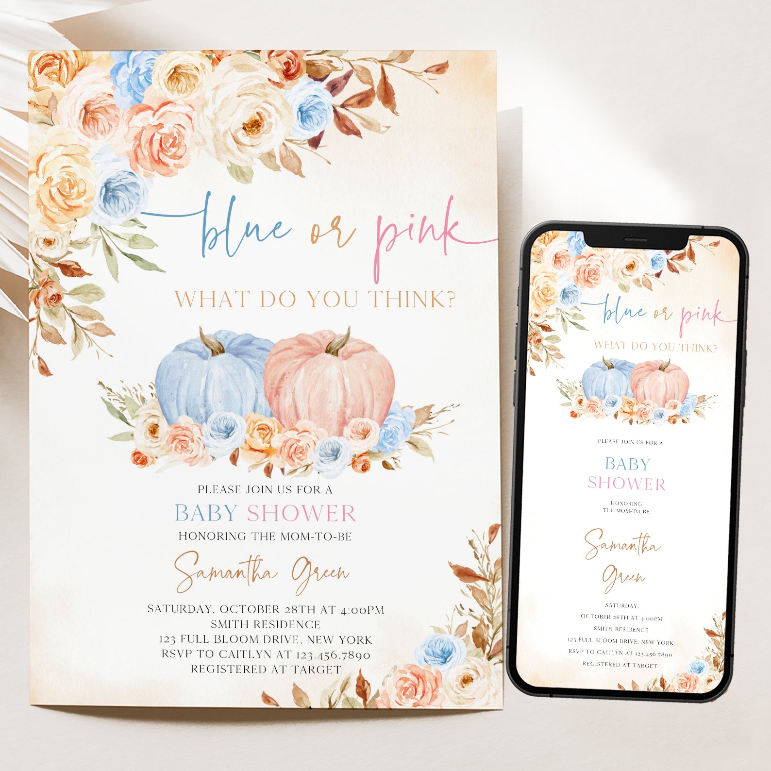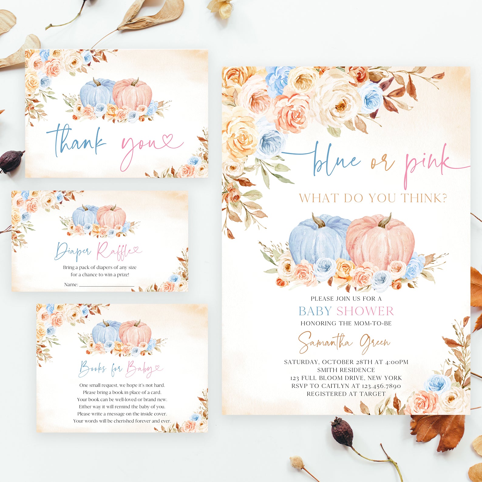 Welcome your little one with our charming Fall Baby Shower Bundle. Featuring an invitation, mobile invite, diaper raffle, books for baby card, and thank you card, this set is available in blue or pink for gender reveals or a vibrant solo theme. With watercolor roses, lush leaves, and pumpkins adorned with roses, this design creates a warm and inviting touch for your celebration. Perfect for a cozy gathering, this bundle ensures every detail of your event is covered.