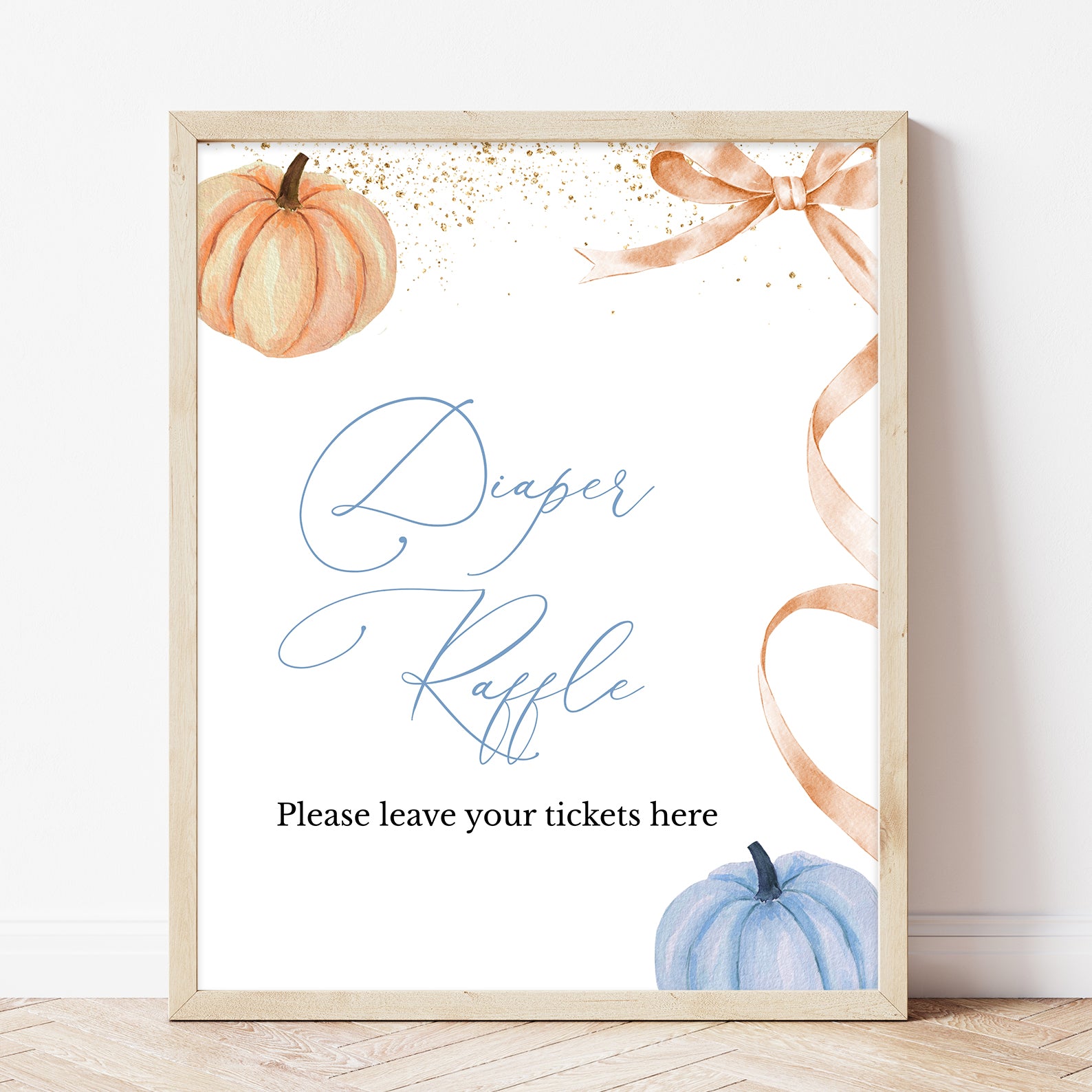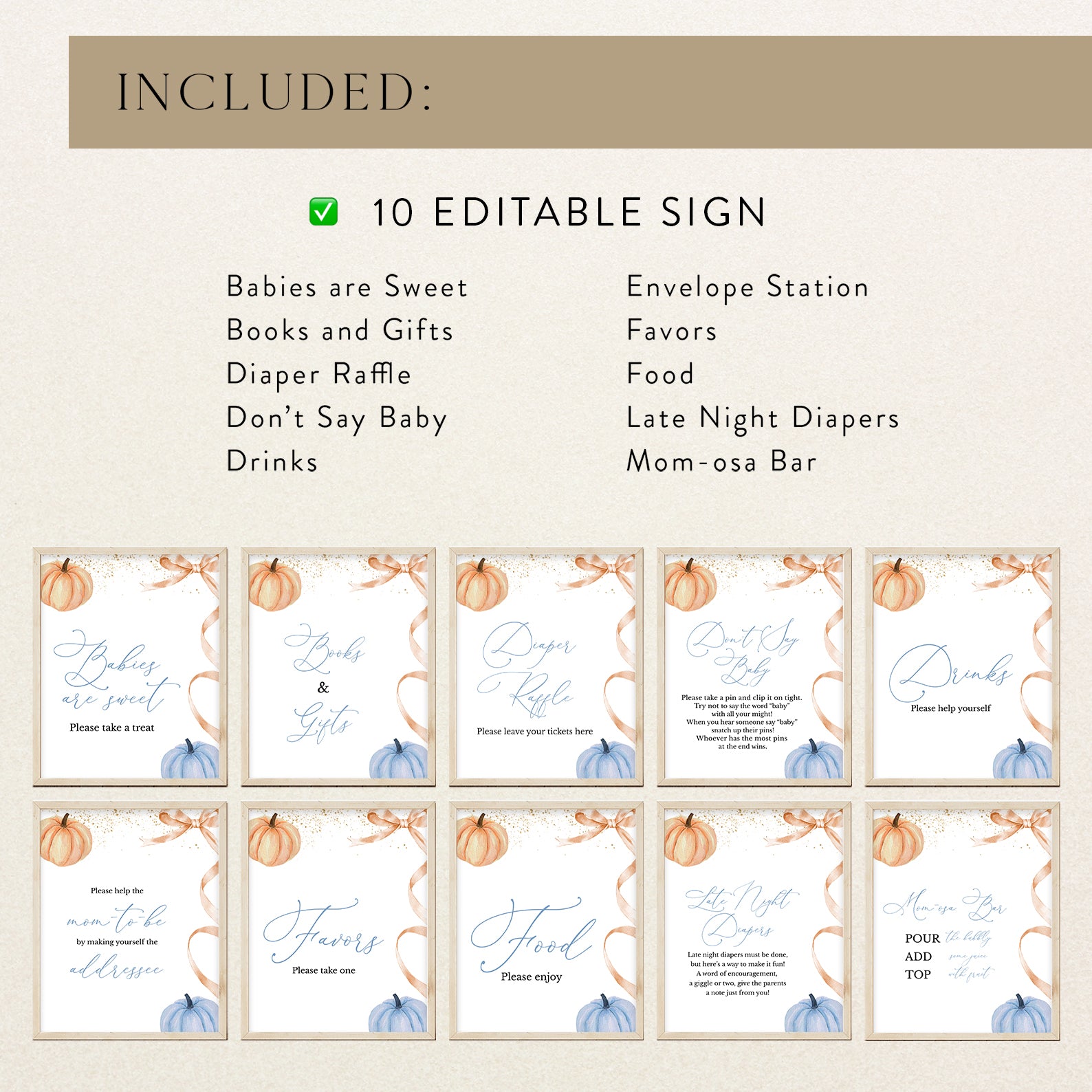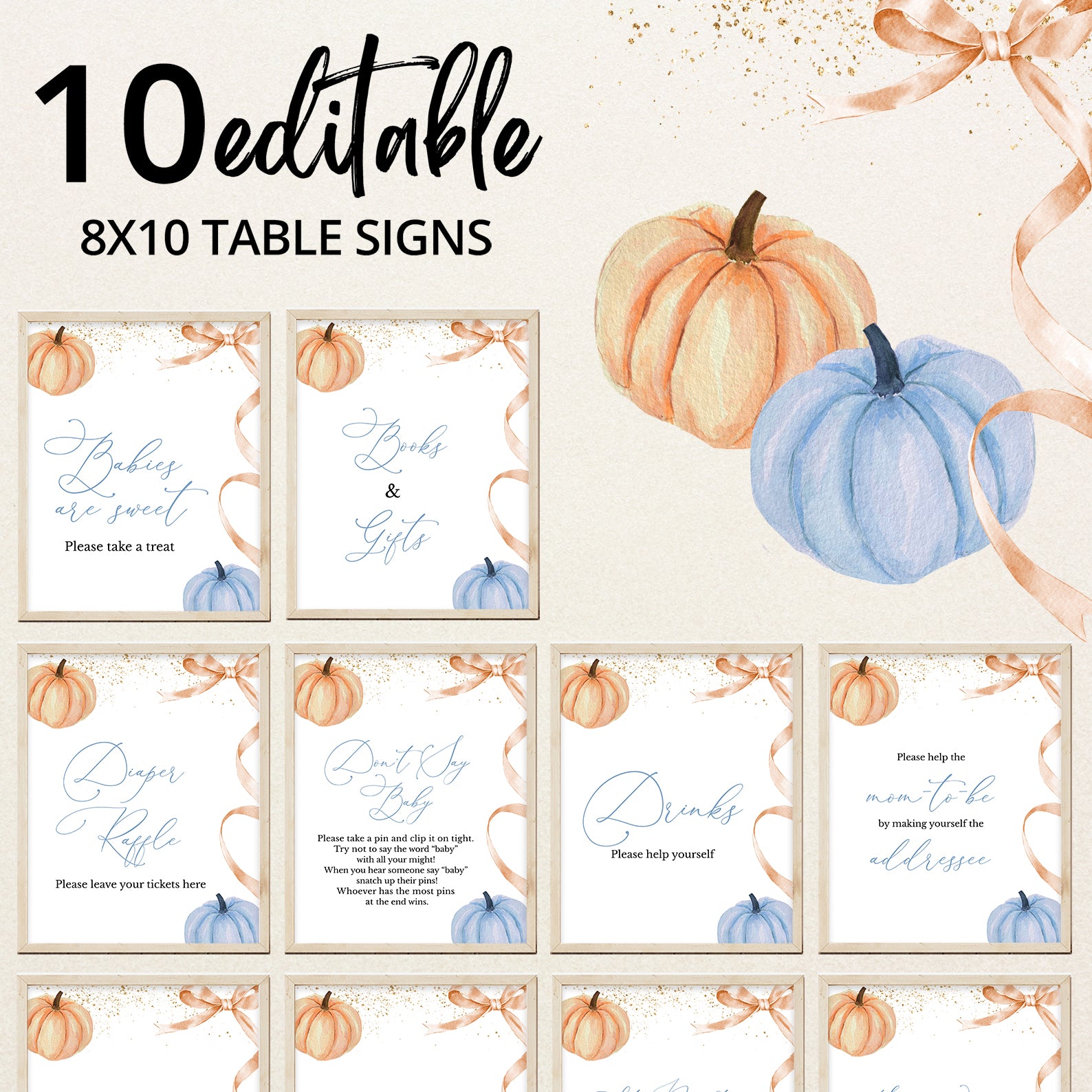Elevate your autumn baby shower with this set of ten editable table signs, beautifully designed with soft watercolor pumpkins in warm orange and blue tones. Each sign features elegant gold accents and playful script on a clean white background, creating a cozy yet stylish fall theme. Includes signs for Babies Are Sweet, Books and Gifts, Diaper Raffle, Drinks, Favors, Mom-osa Bar, and more perfect for guiding guests and adding charm to every table.