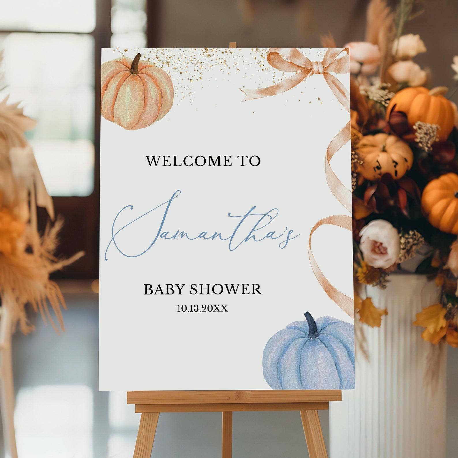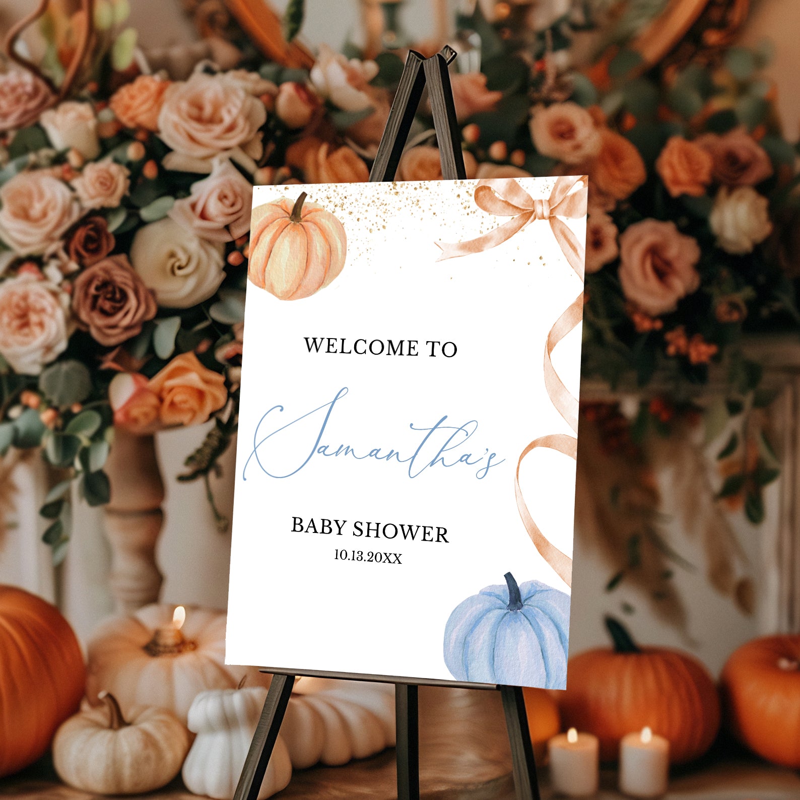 - Purchase this Cozy Fall Baby Shower Digital Welcome Sign: Pumpkin & Ribbon template