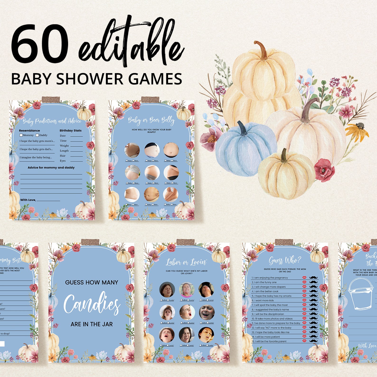 Make your fall baby shower unforgettable with this 60-game editable baby shower bundle, designed to match your cozy seasonal celebration. Each game features charming watercolor pumpkins, floral accents, and soft arches in green, orange, blue, or pink. From classics like Baby Bingo and Who Knows Mommy Best to fun icebreakers and guessing games, this bundle is perfect for entertaining guests and creating lasting memories. Easy to customize and print!