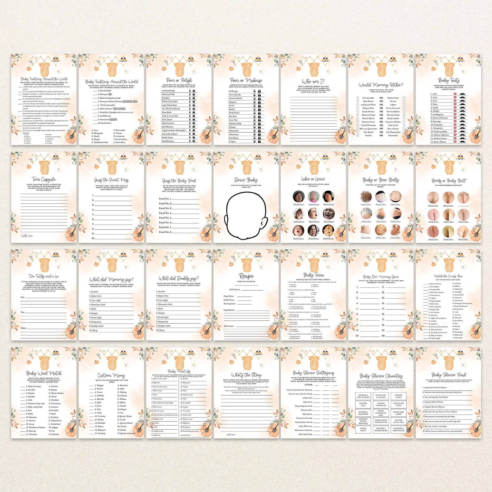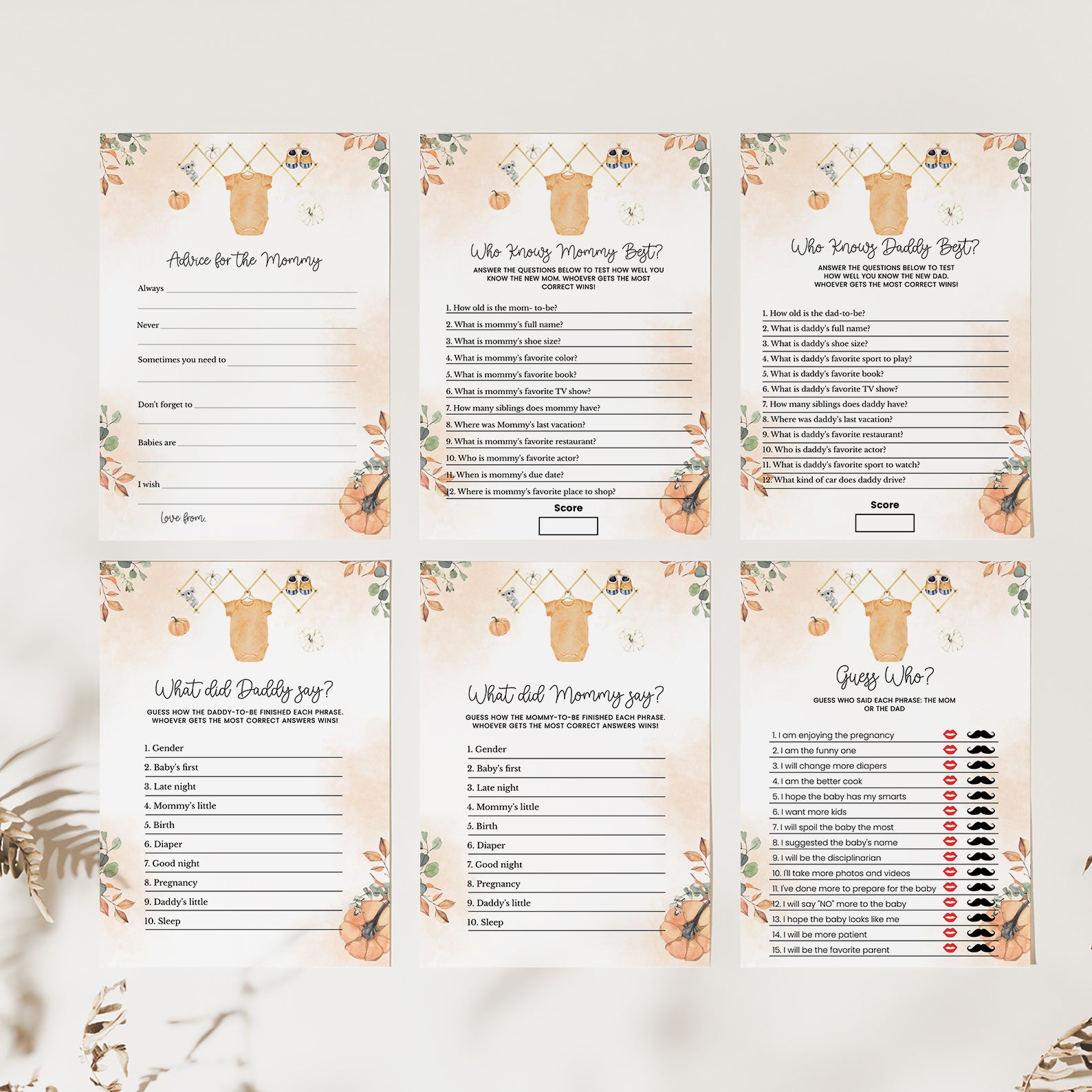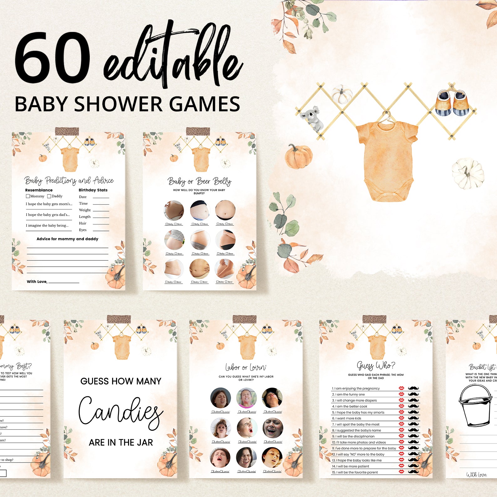 Keep your guests entertained with this cozy Fall Baby Shower Game Bundle! Featuring 60 editable games, this collection is designed to match your autumn celebration with playful touches like pumpkins, fall leaves, and baby-themed accents. From Baby Bingo to Who Knows Mommy Best, each game is easy to personalize and print. A fun and festive way to add laughter and bonding to your sweet seasonal baby shower.