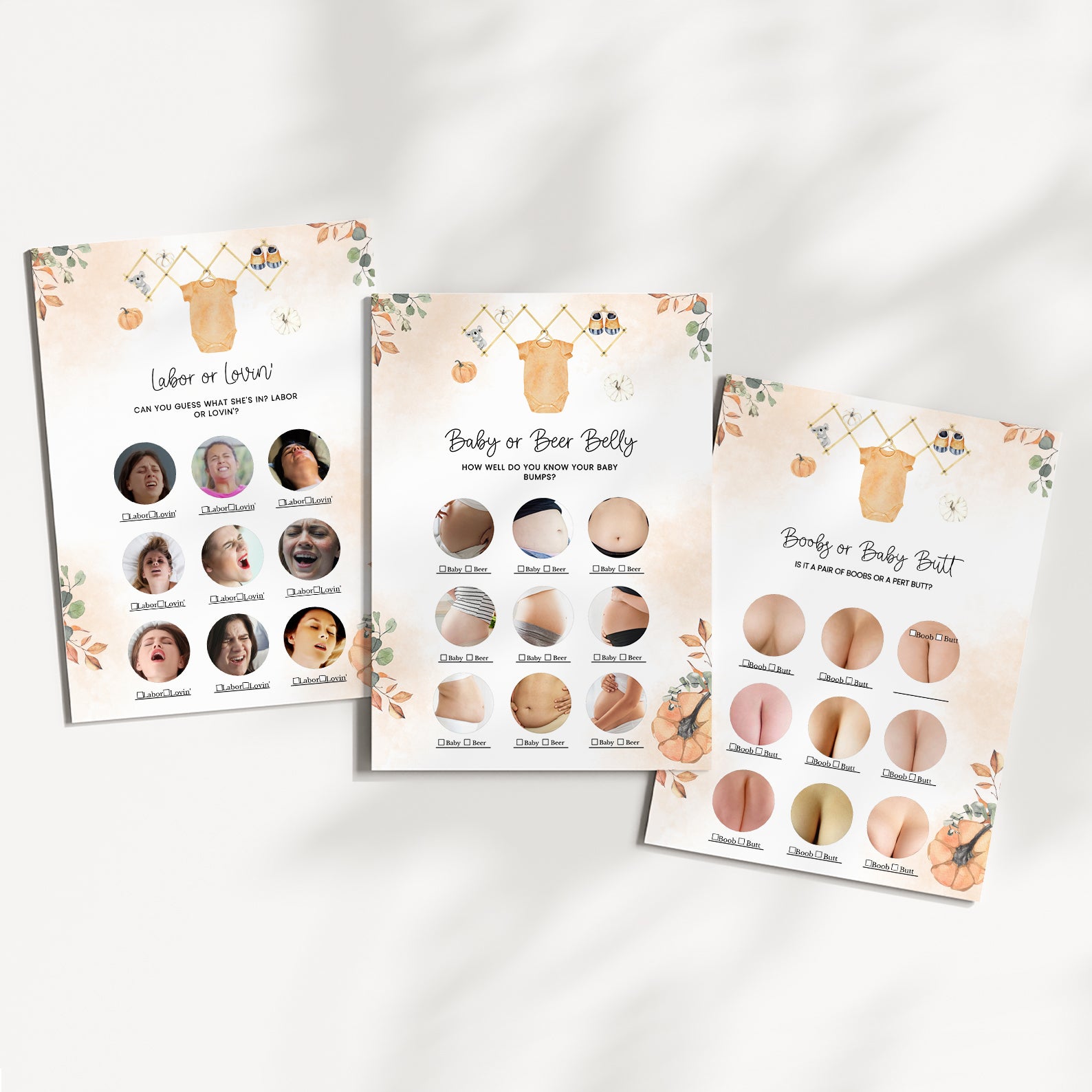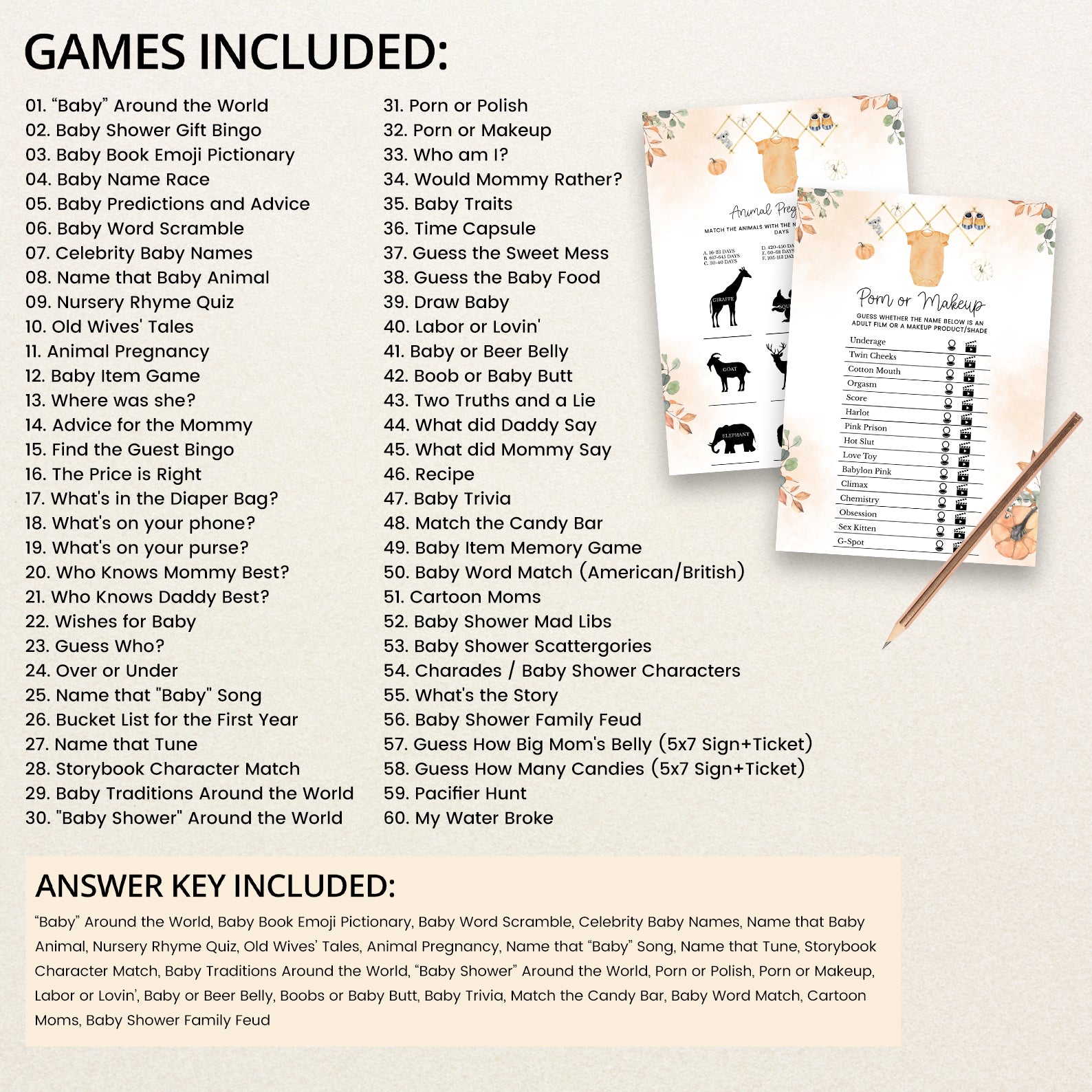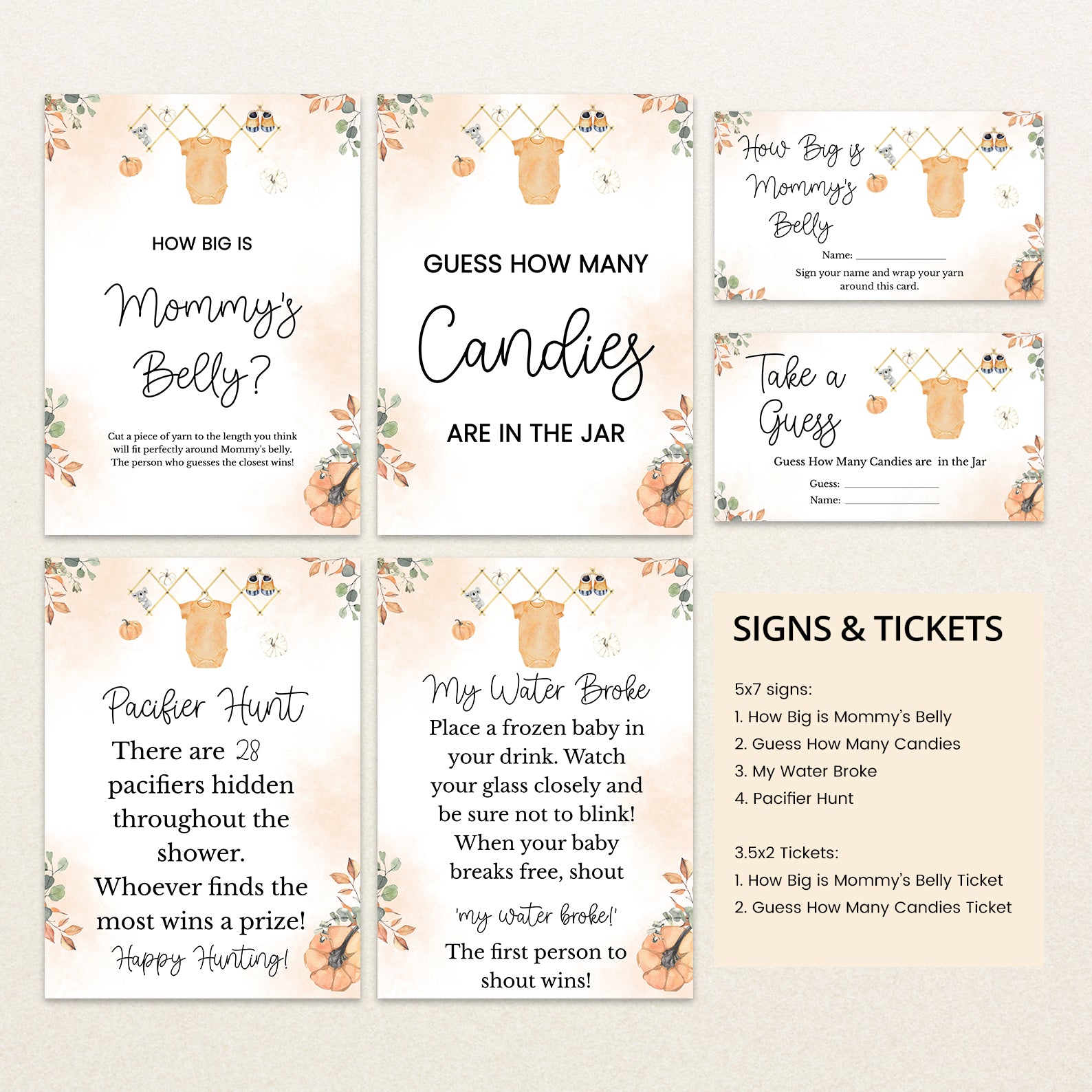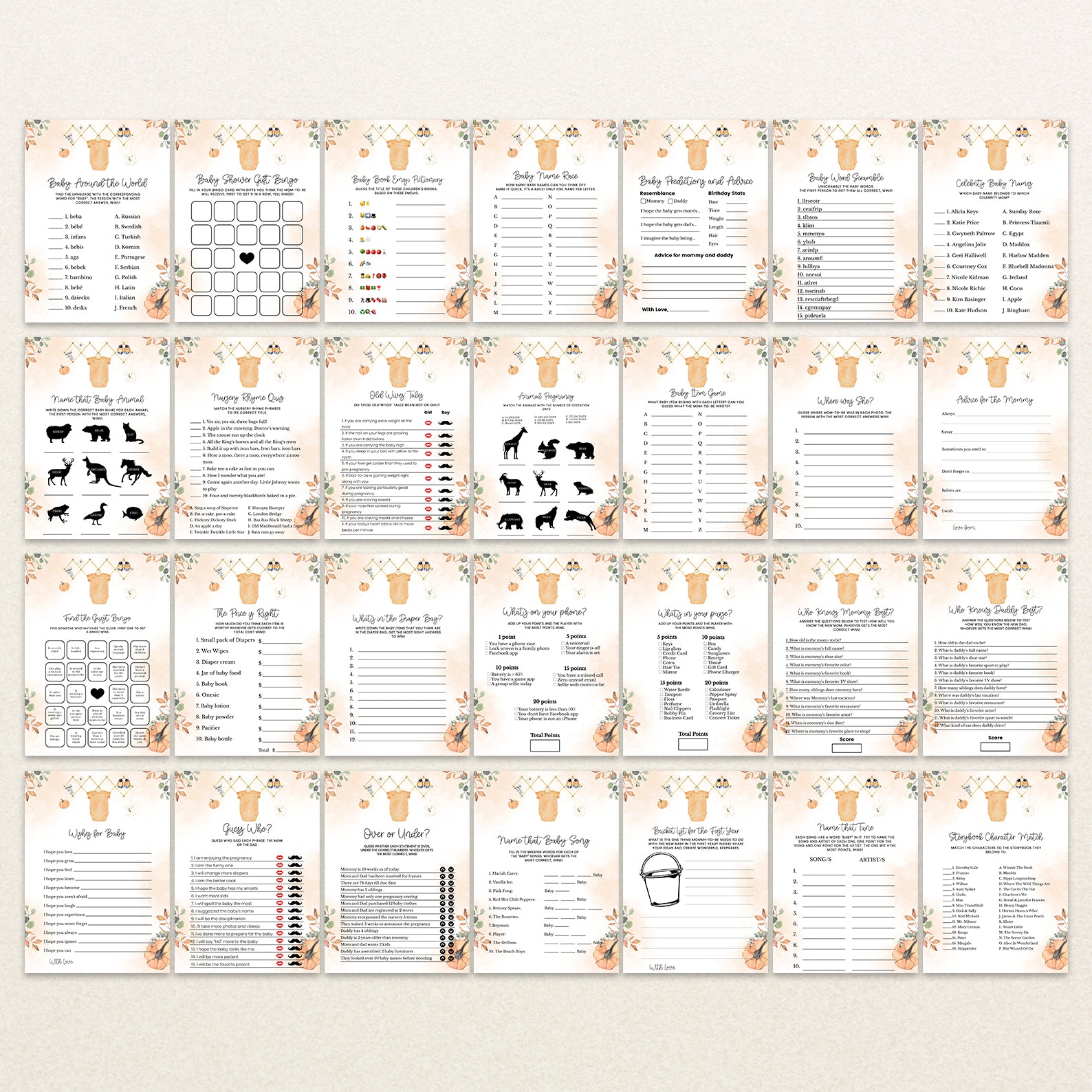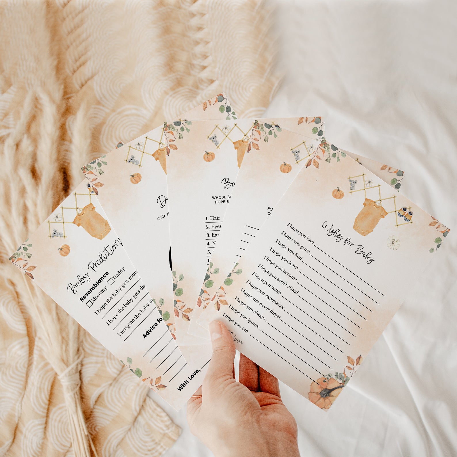 - Purchase this Fall Baby Shower Digital Game Bundle: Pumpkin, Leaves & Koala template