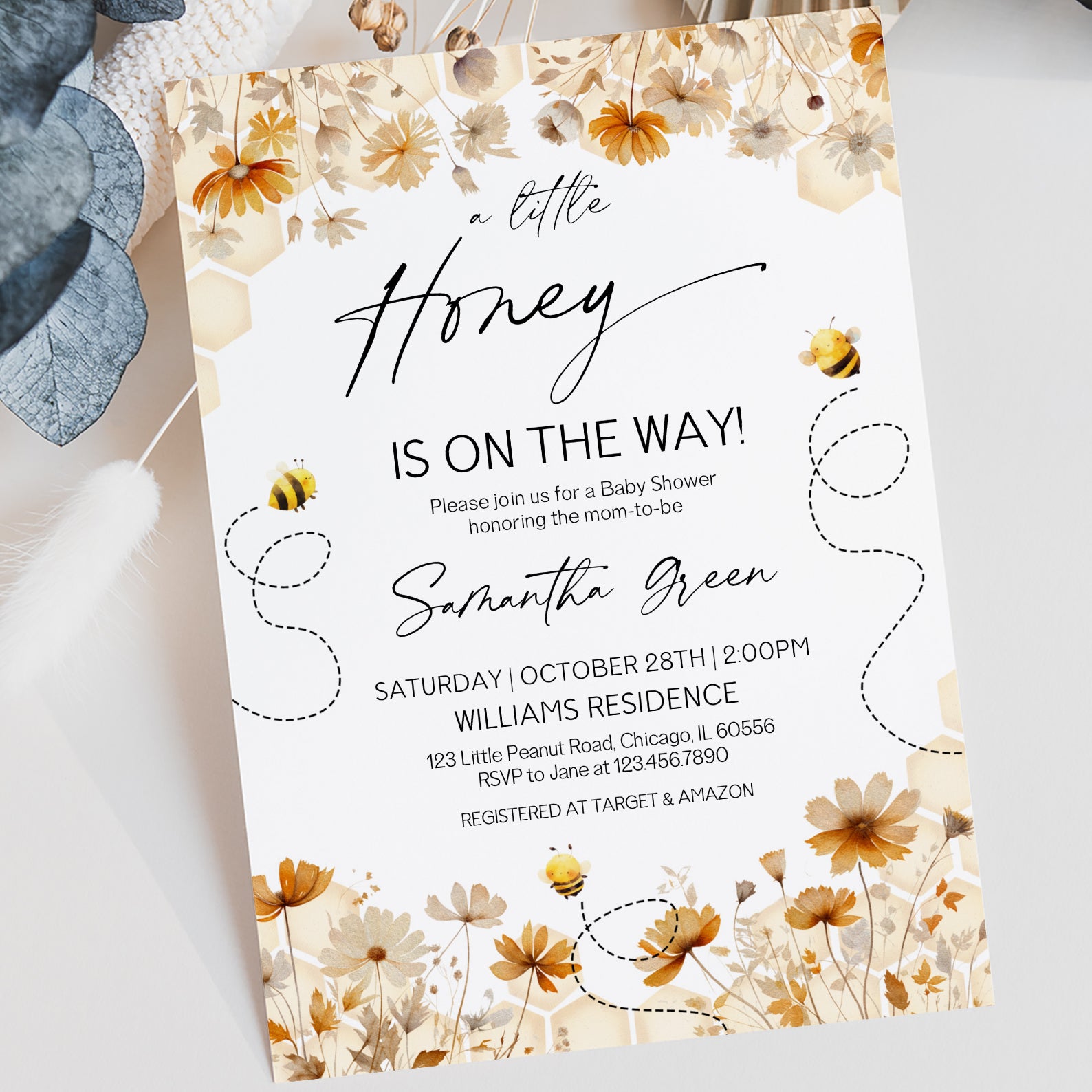 - Purchase this Fall Baby Shower Digital Invitation with Honeycombs & Bees template