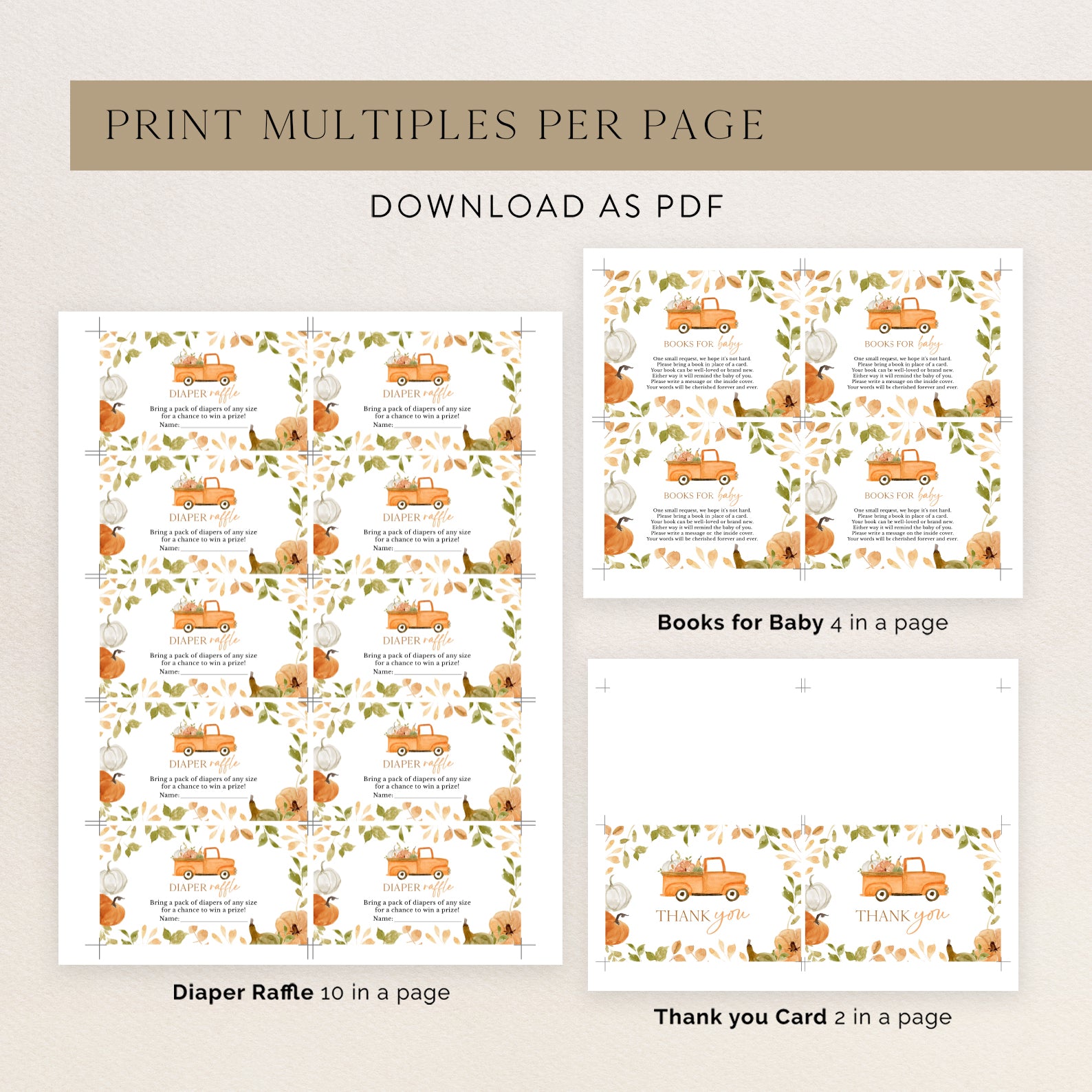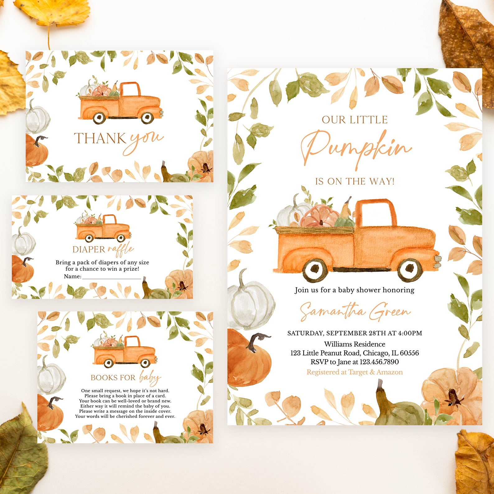 Celebrate your little pumpkin with our fall-themed invitation bundle! This set includes an invitation, mobile invite, diaper raffle, books for baby card, and thank you card, all adorned with watercolor leaves, white and orange pumpkins, and a cute orange pickup truck filled with pumpkins. Perfect for creating a warm, autumnal vibe for your baby shower.