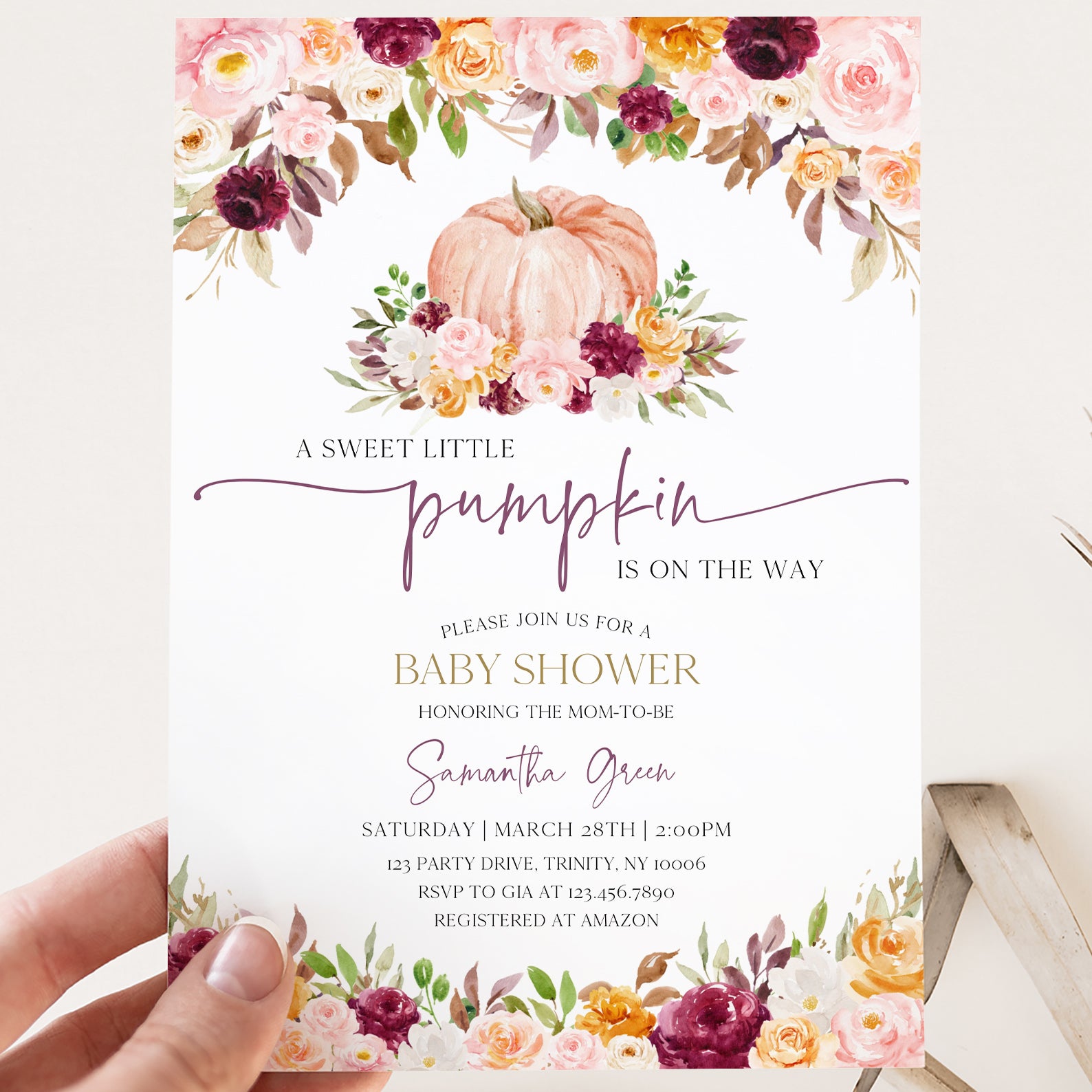 - Purchase this Fall Baby Shower Digital Invite: Sweet Pumpkin with Rose Border template