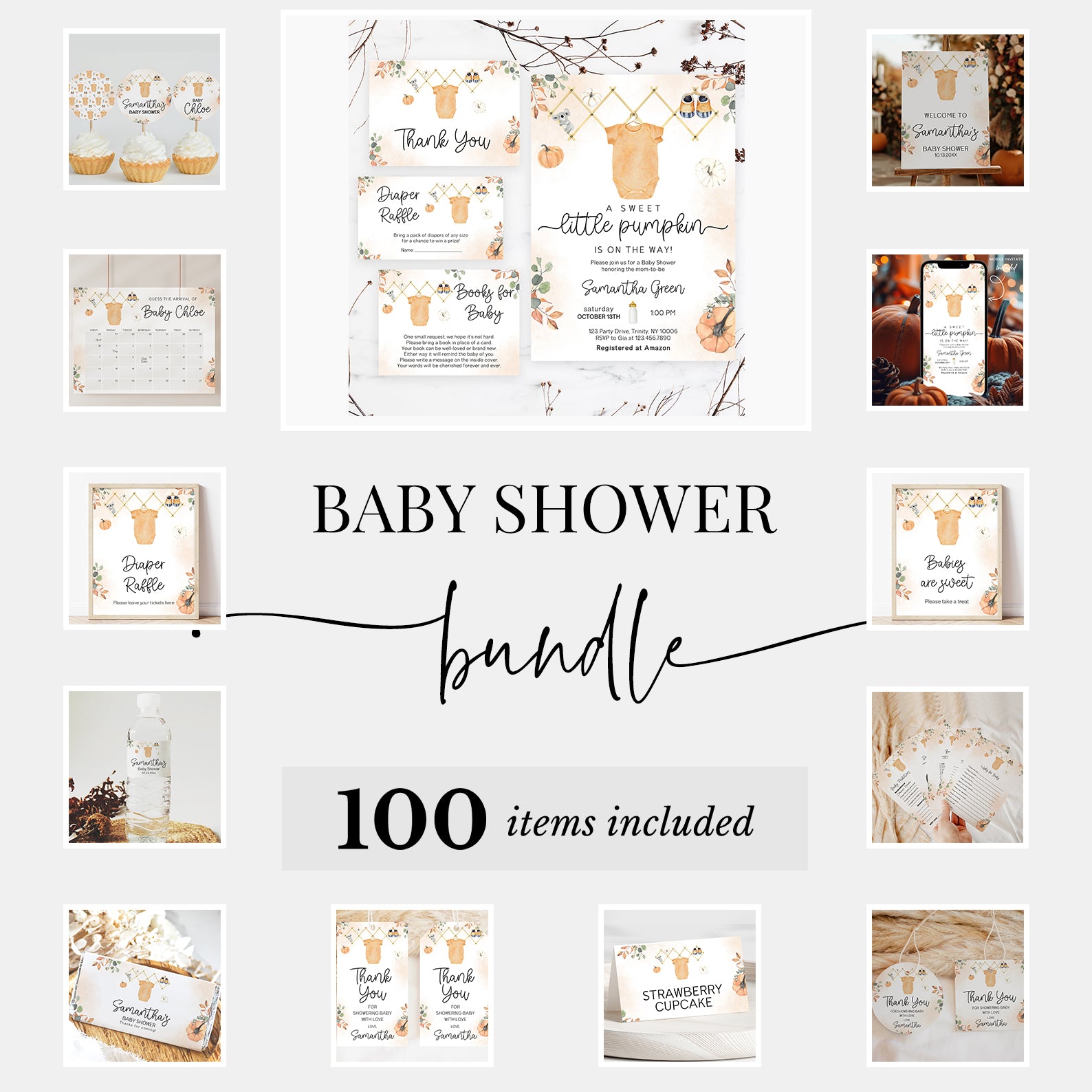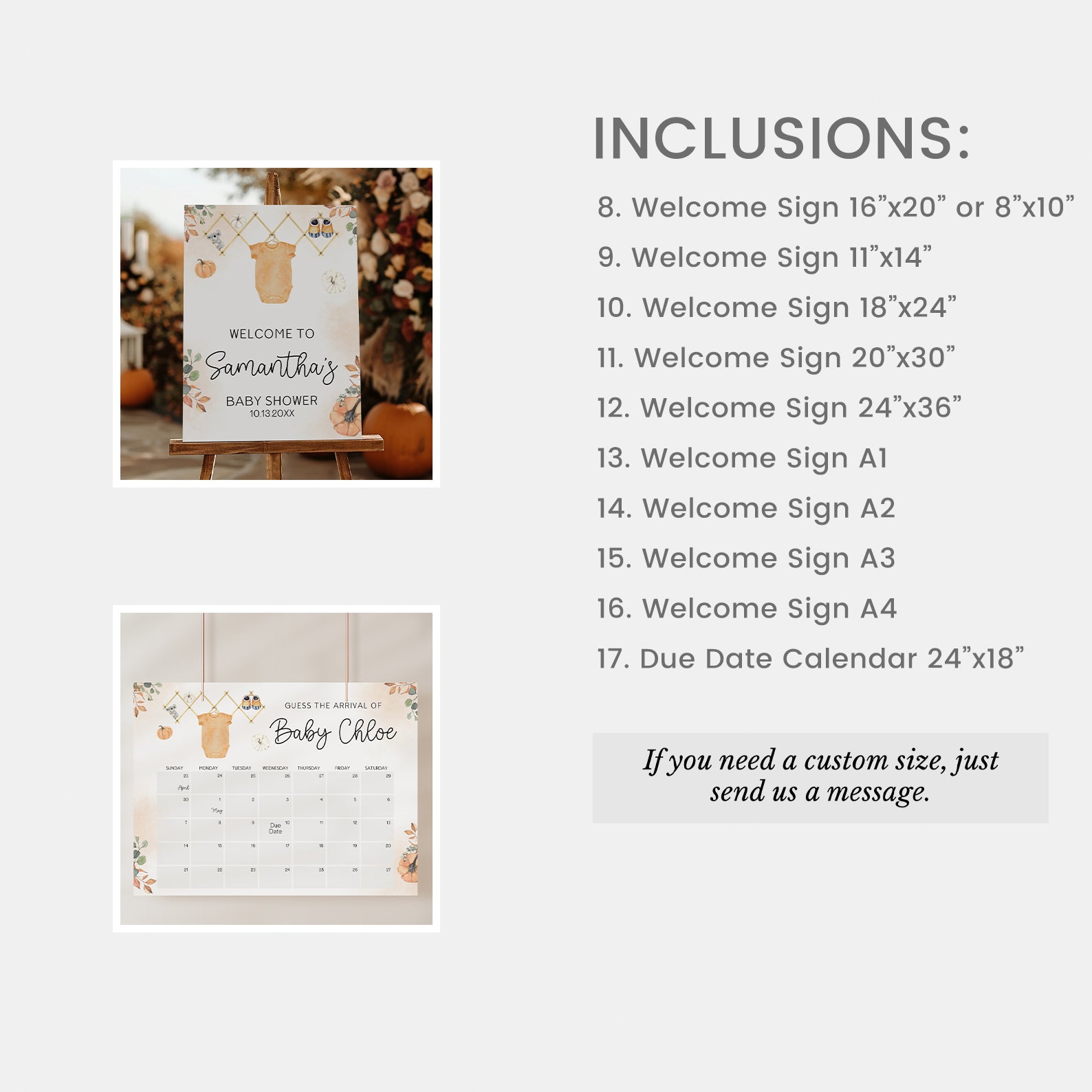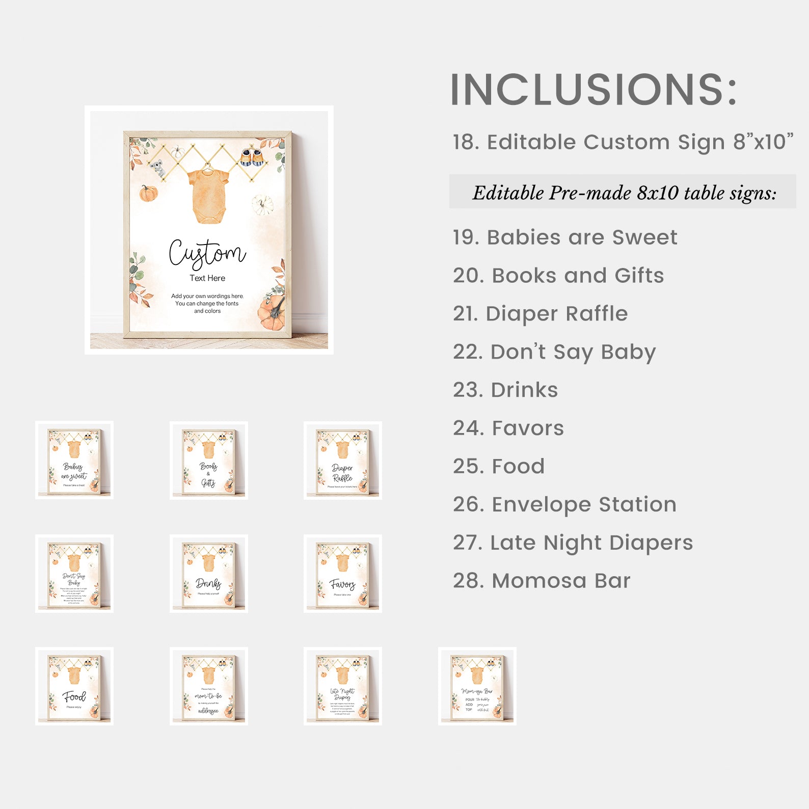 Host a beautifully coordinated autumn celebration with this Fall Baby Shower Mega Bundle! This editable set includes 100 matching items from invitations and thank you cards to welcome signs, table signs, favor tags, food labels, cupcake toppers, games, and more. Designed with warm fall leaves, a sweet pumpkin, and baby elements like an orange onesie and sleeping koala, it brings charming seasonal style to every detail of your baby shower.