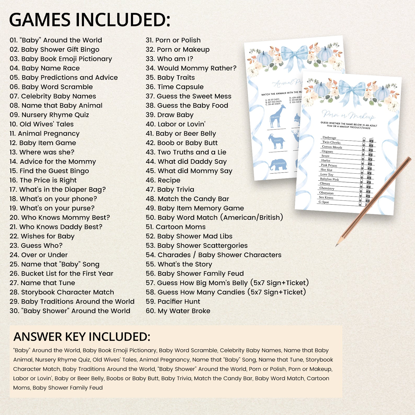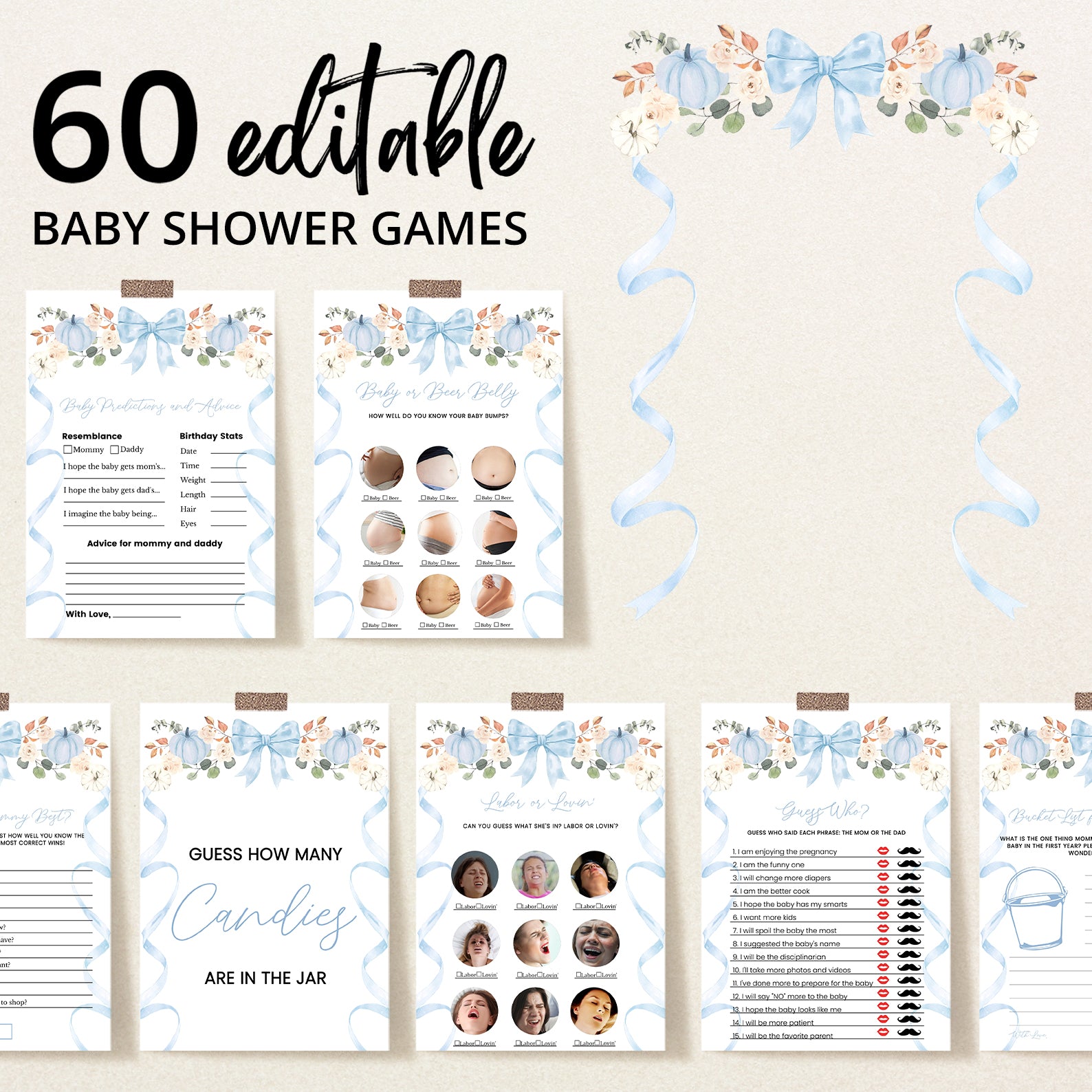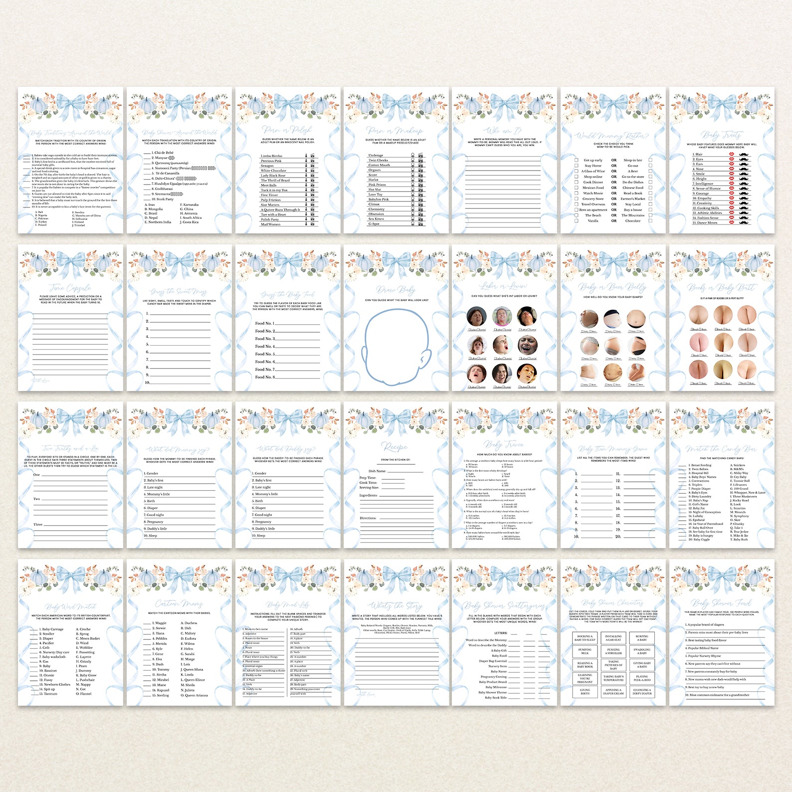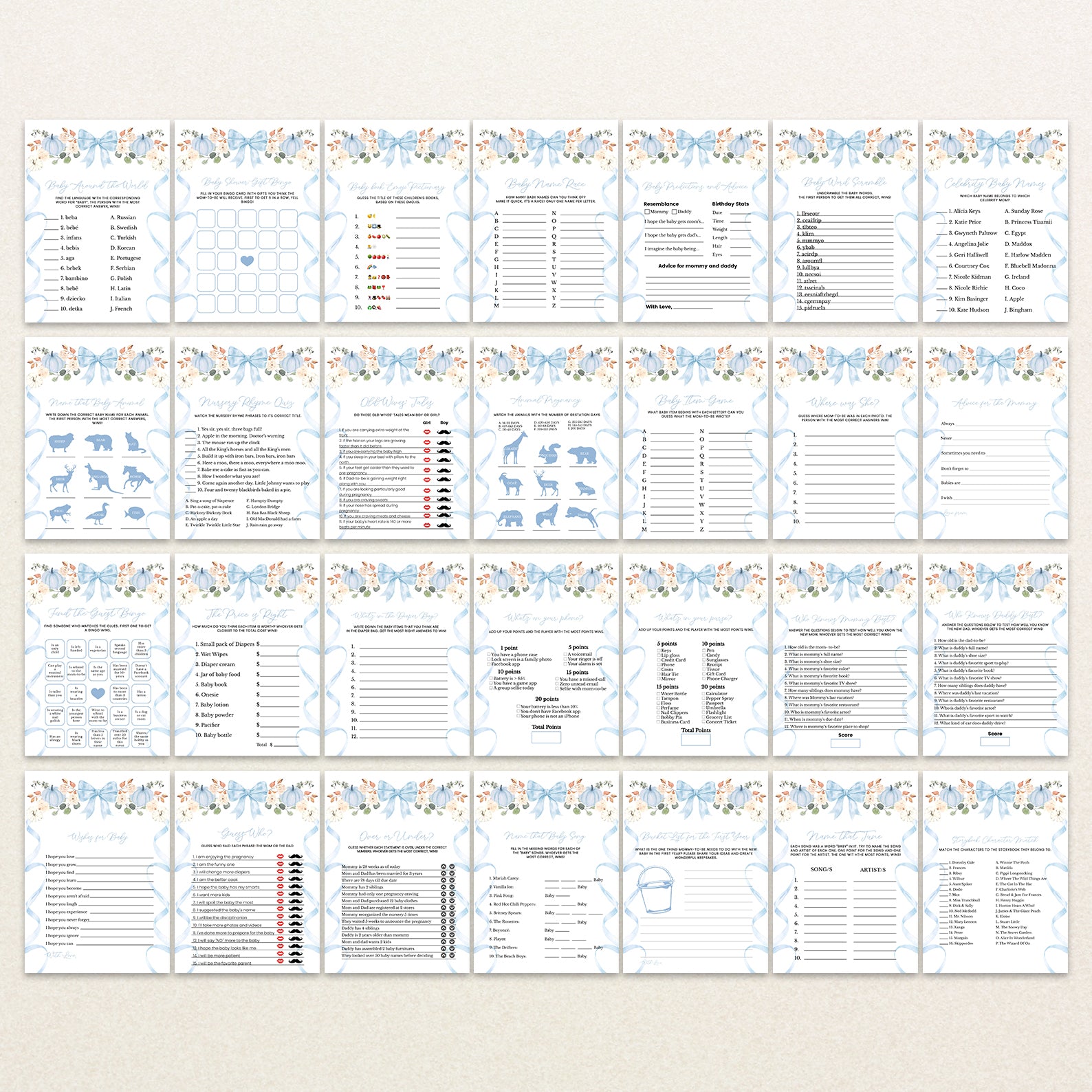 Keep your guests entertained with this fun-filled Fall Baby Shower Game Bundle! Featuring 60 editable games, this set includes a delightful mix of classics and modern favorites, all beautifully designed with a playful wavy ribbon border and a charming pumpkin with floral accents. Available in green, orange, pink, or blue themes, it's perfect for matching your decor while making your celebration interactive, memorable, and full of laughter.