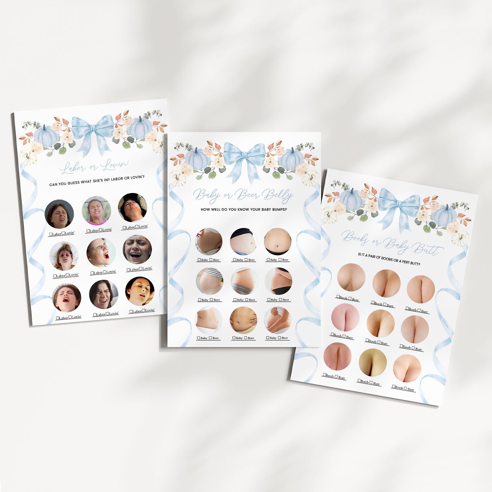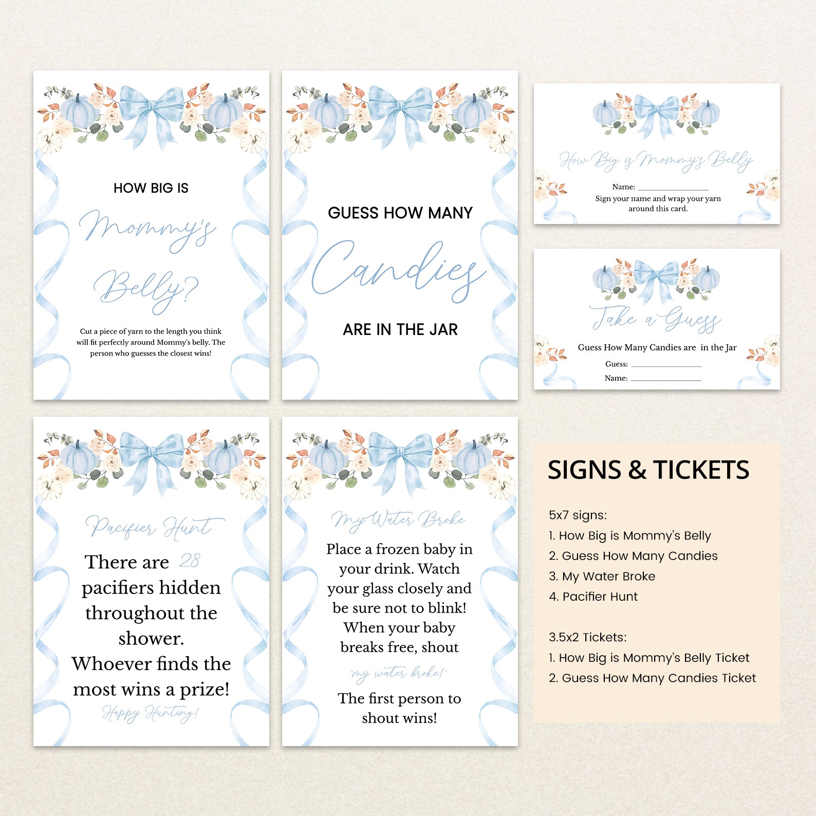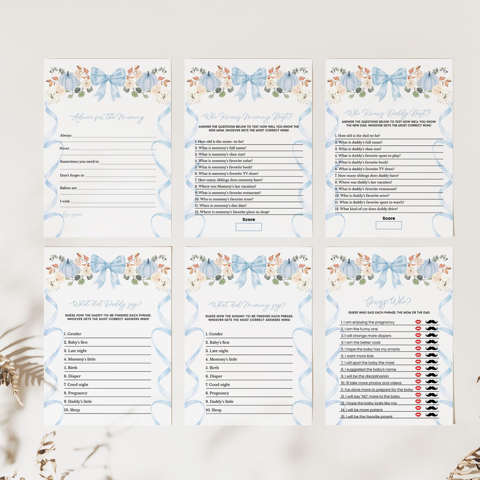 - Purchase this Fall Baby Shower Game Bundle: Blue Ribbon Frame with Pumpkin & Florals template