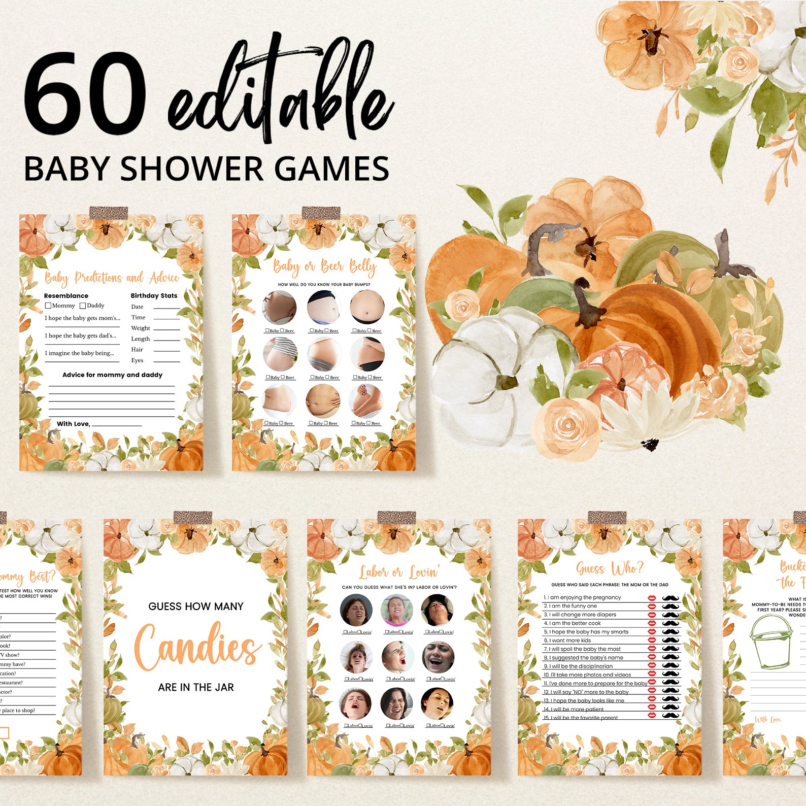 Keep guests entertained with this fall-themed baby shower game bundle featuring 60 editable activities. Each page is decorated with watercolor pumpkins, greenery, and warm autumn tones, perfect for a cozy celebration. Whether you're playing baby trivia, word games, or guessing games, this bundle adds fun and flair to your gathering all while maintaining a cohesive and charming fall aesthetic.
