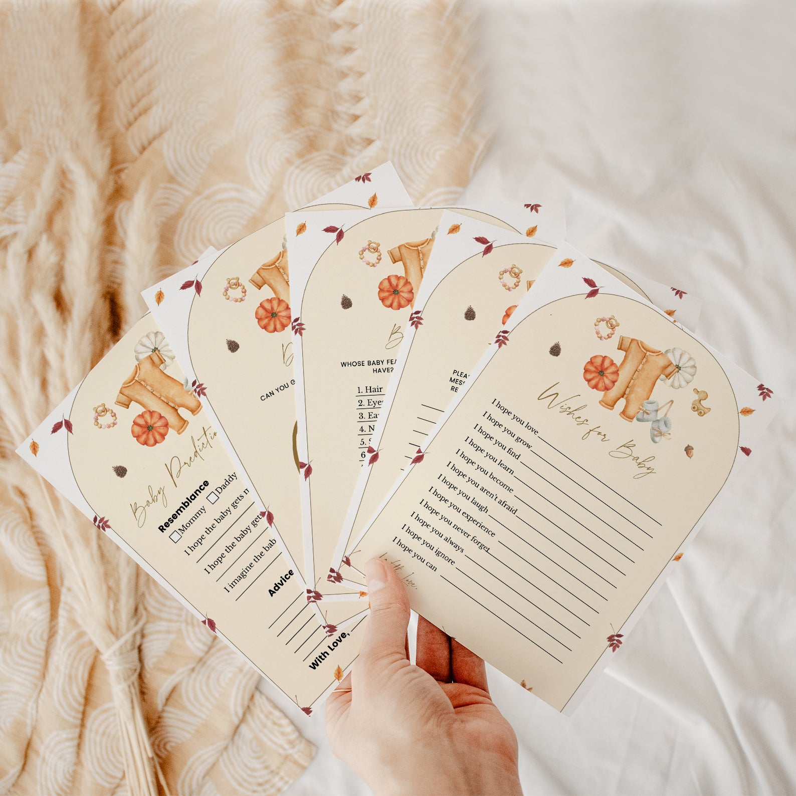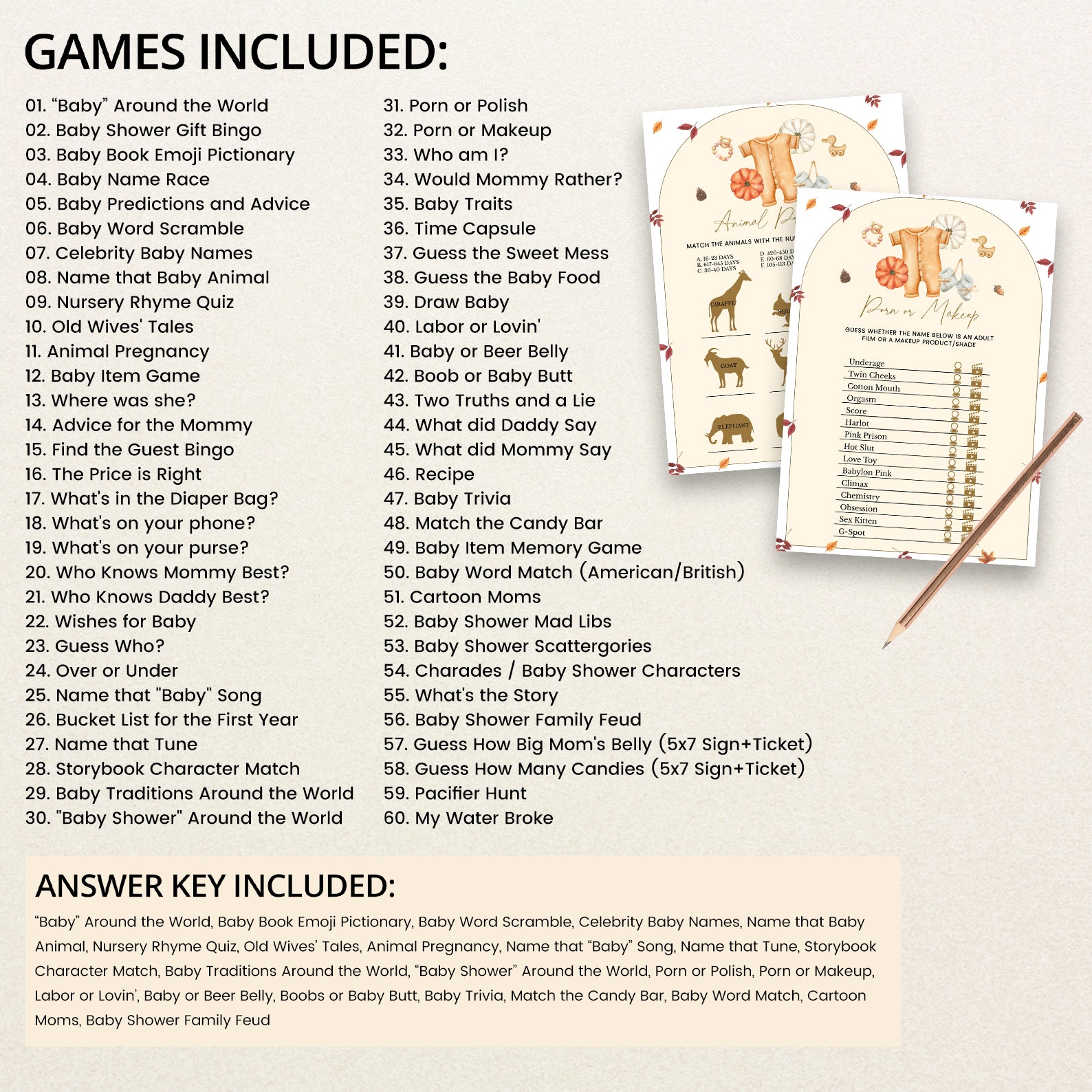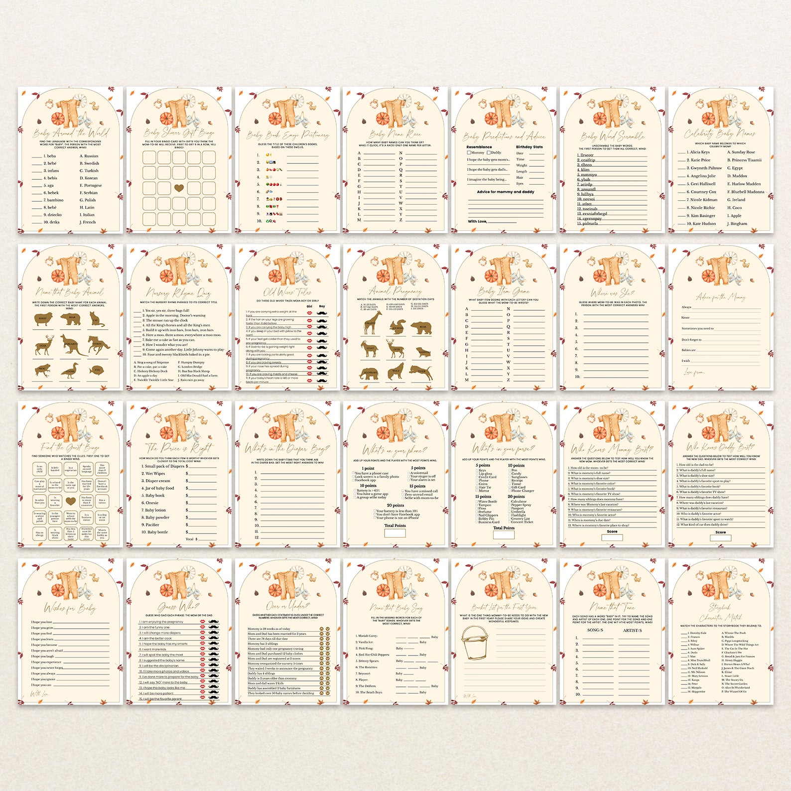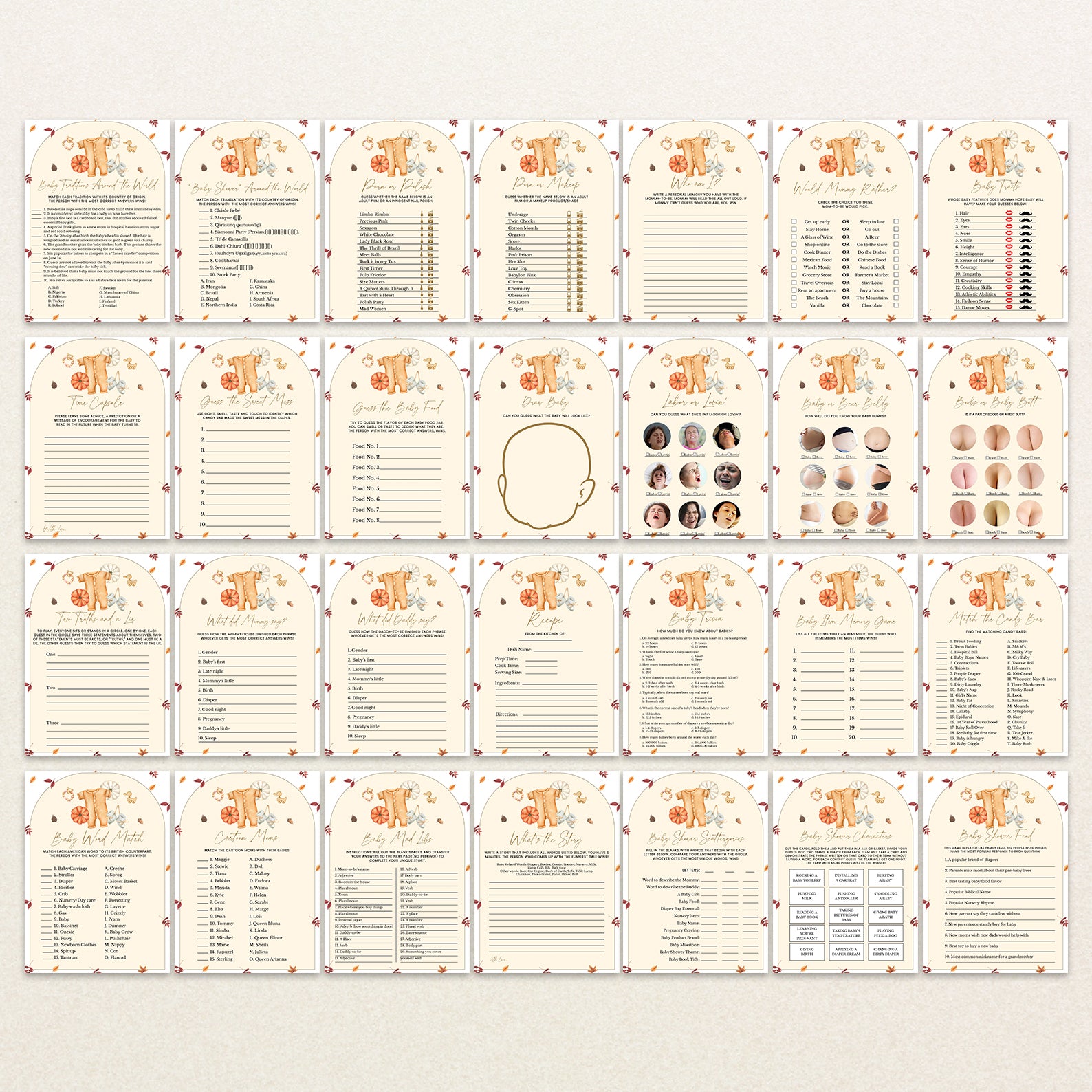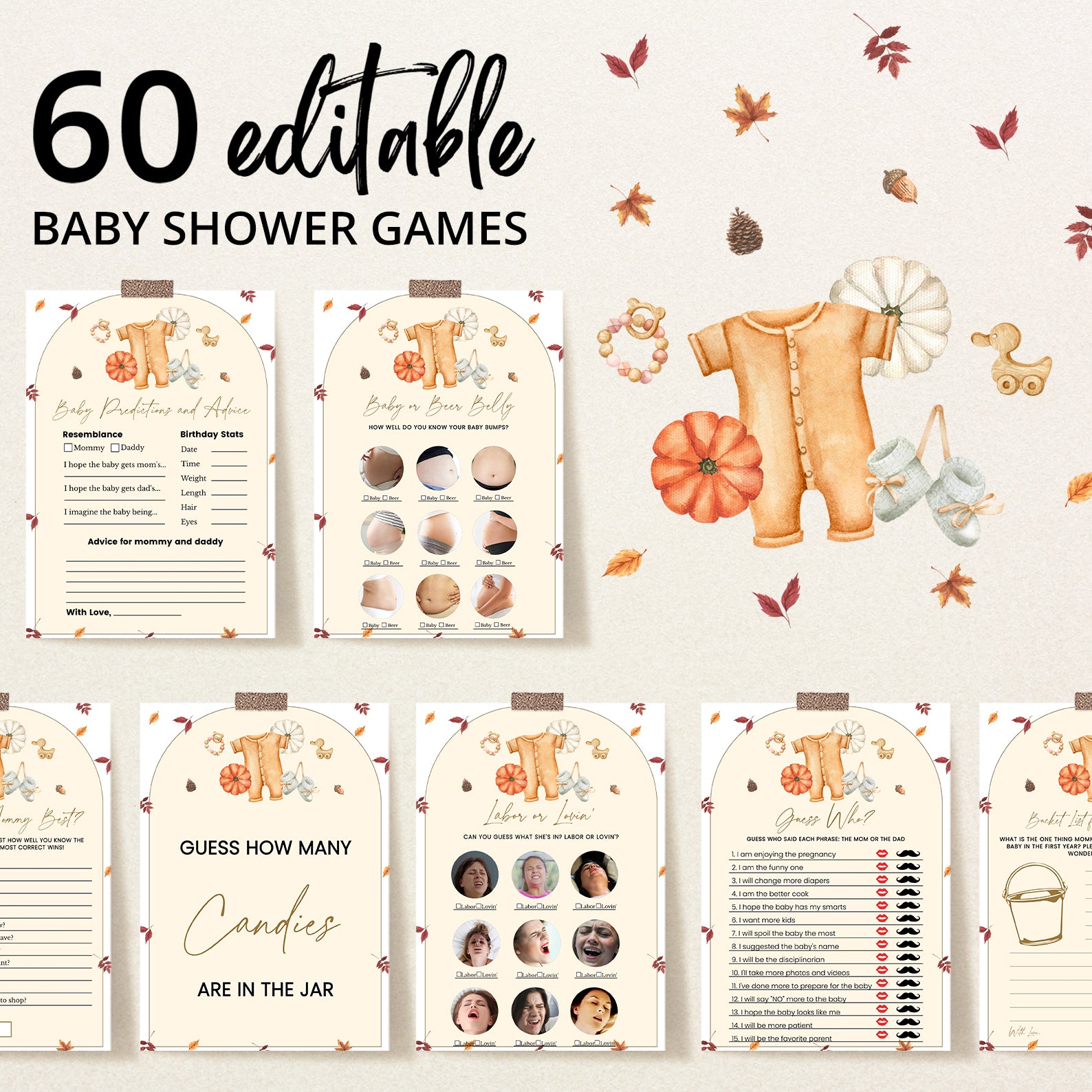 Keep your guests entertained with this cozy fall-themed baby shower game bundle! Featuring 60 editable games, each sheet is designed to match your autumn celebration with warm pastel orange tones, falling leaves, and sweet baby elements like an orange onesie, pumpkin accents, and playful toys. From baby bingo to mommy trivia, this set offers hours of fun and is fully customizable to suit your “little pumpkin on the way” celebration.