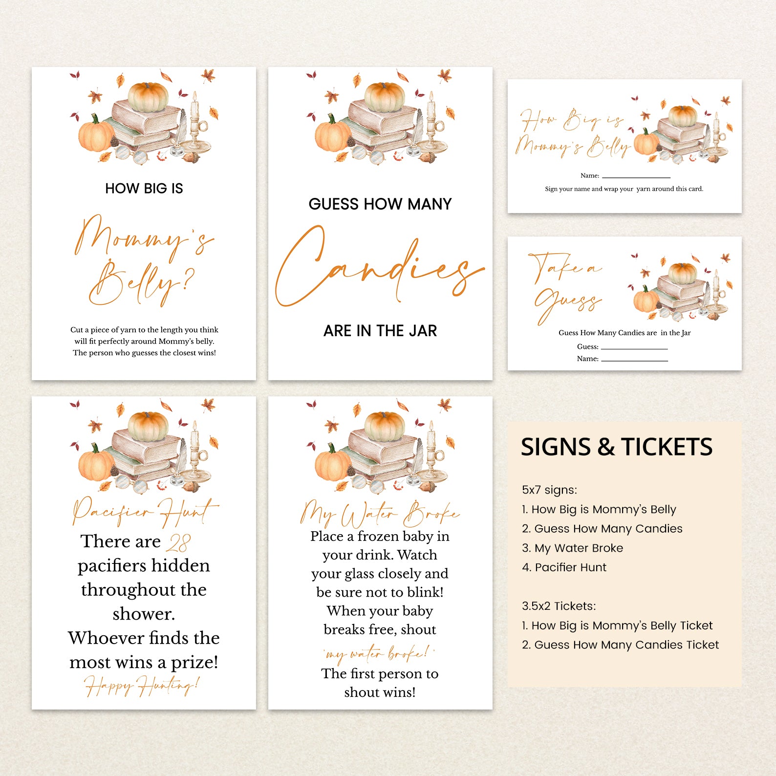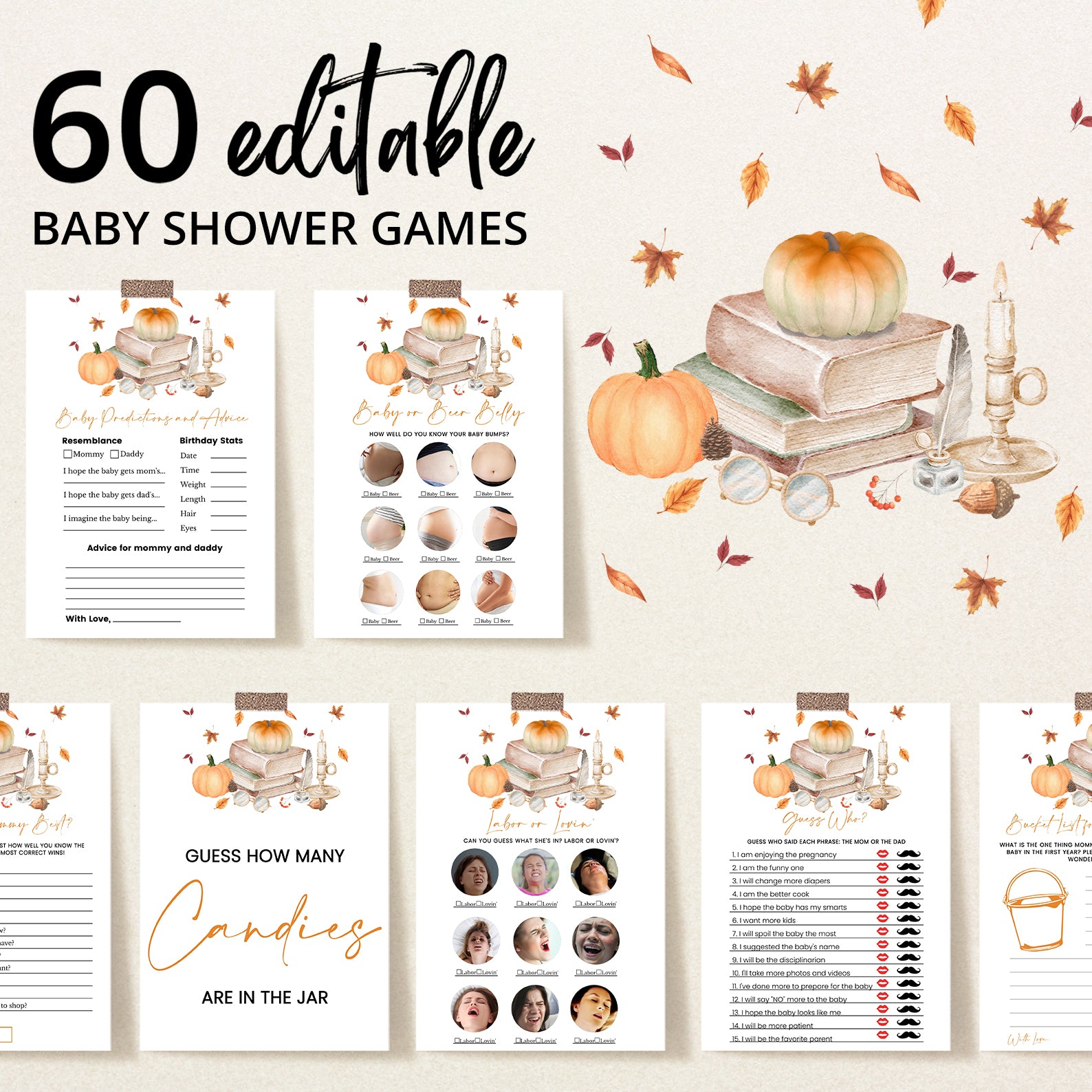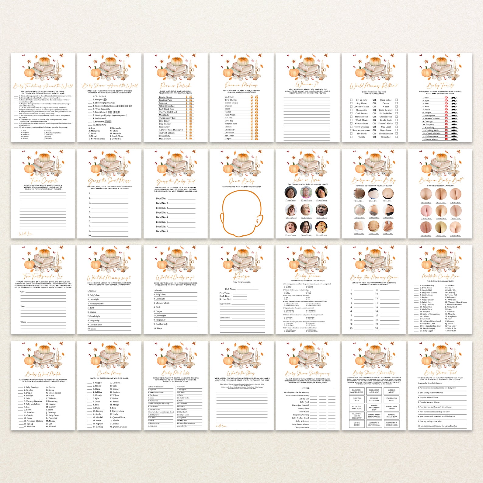 - Purchase this Fall Baby Shower Game Bundle: Pumpkin & Books Autumn Theme template