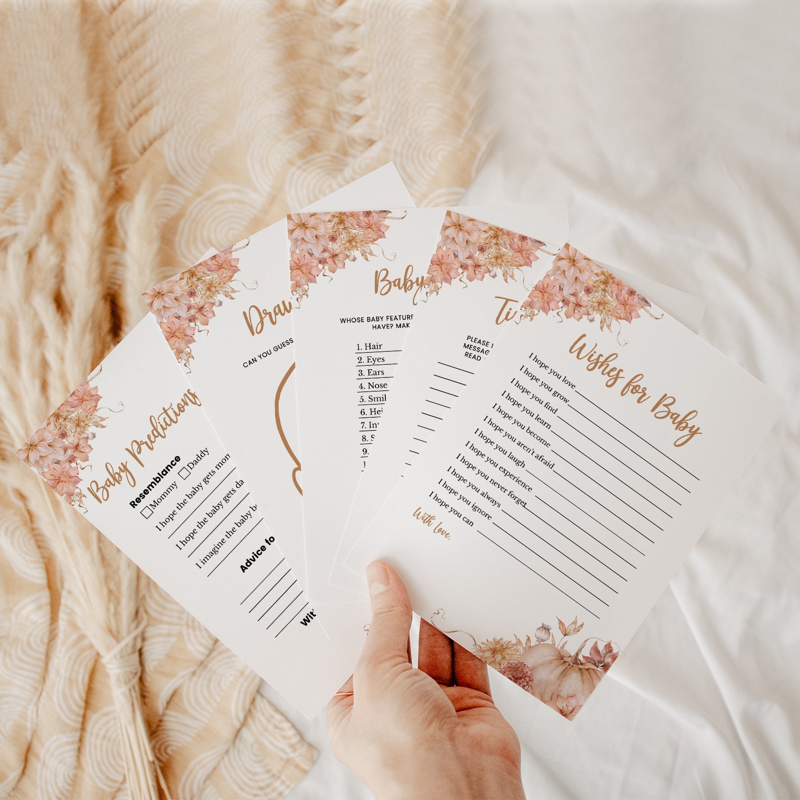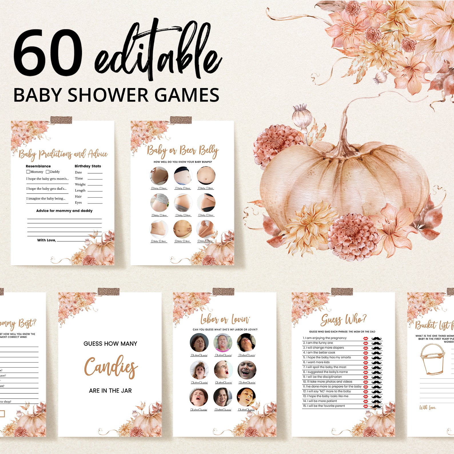 Bring fun and flair to your fall baby shower with 60 editable baby shower games, all styled with seasonal florals and a playful pumpkin theme. Each game features soft watercolor accents and elegant layouts, perfect for keeping guests entertained while matching your celebration’s cozy, autumnal vibe. From classic favorites to modern twists, this set blends entertainment with timeless seasonal style.