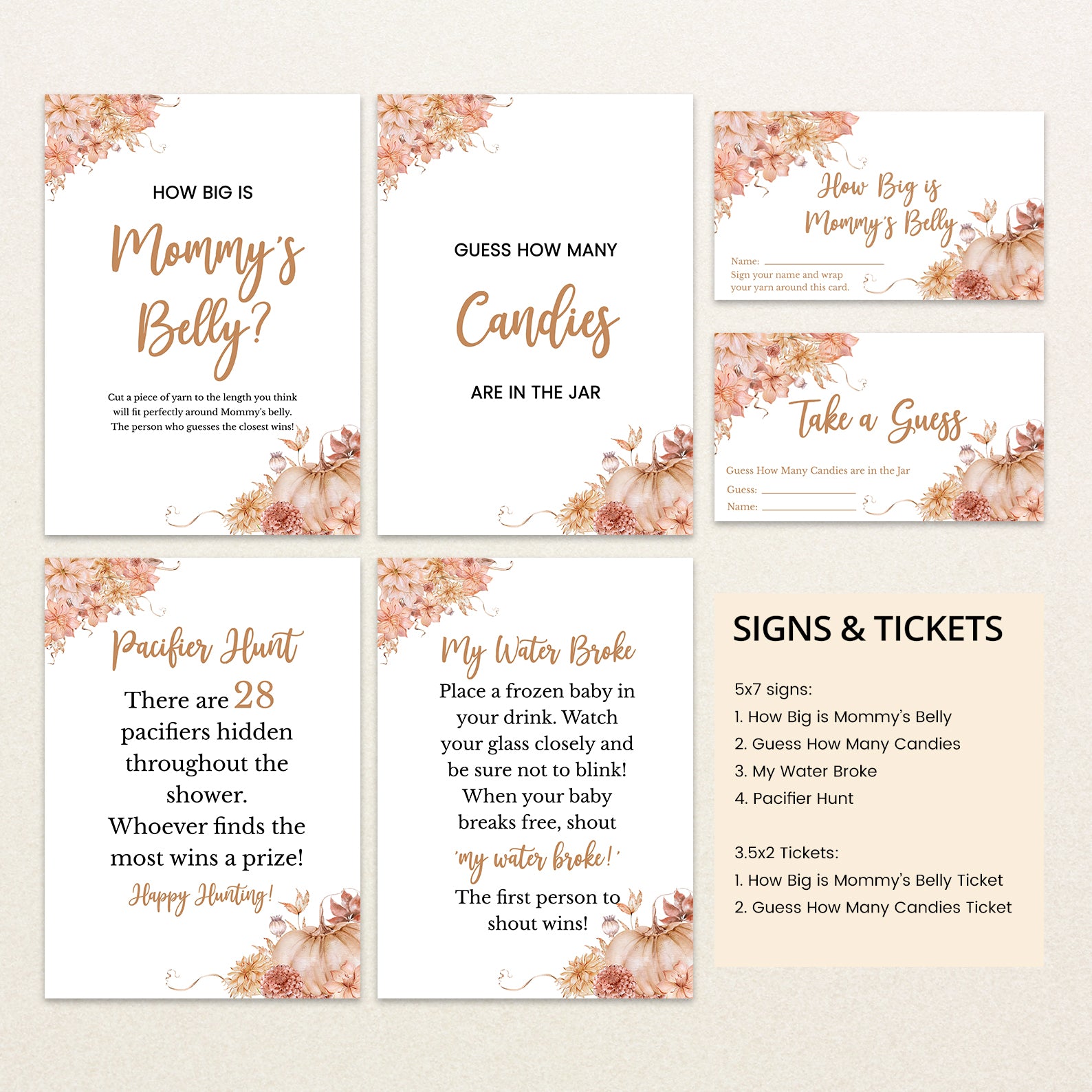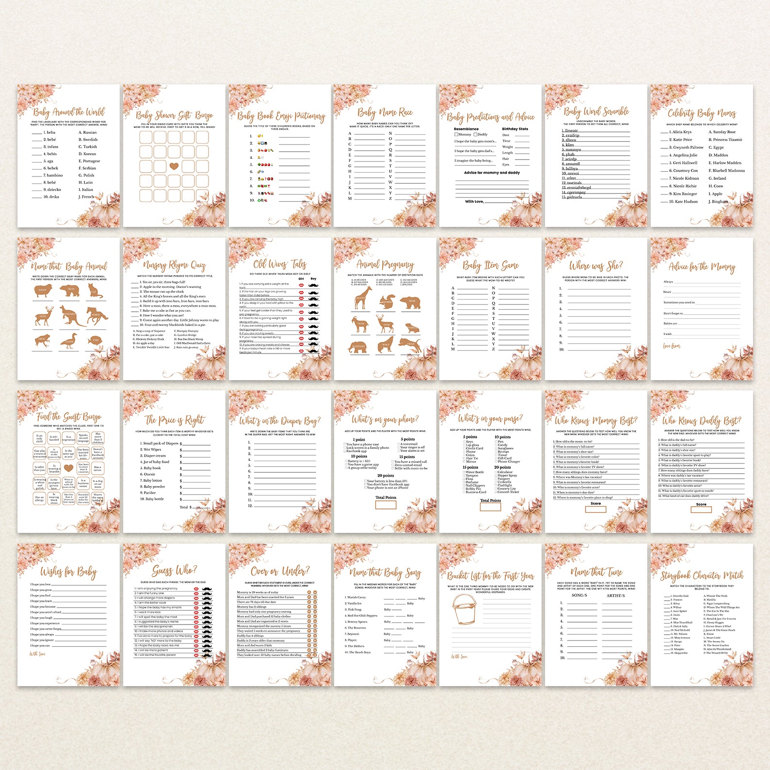 Fall Baby Shower Game Bundle: Pumpkin with Floral Border Design