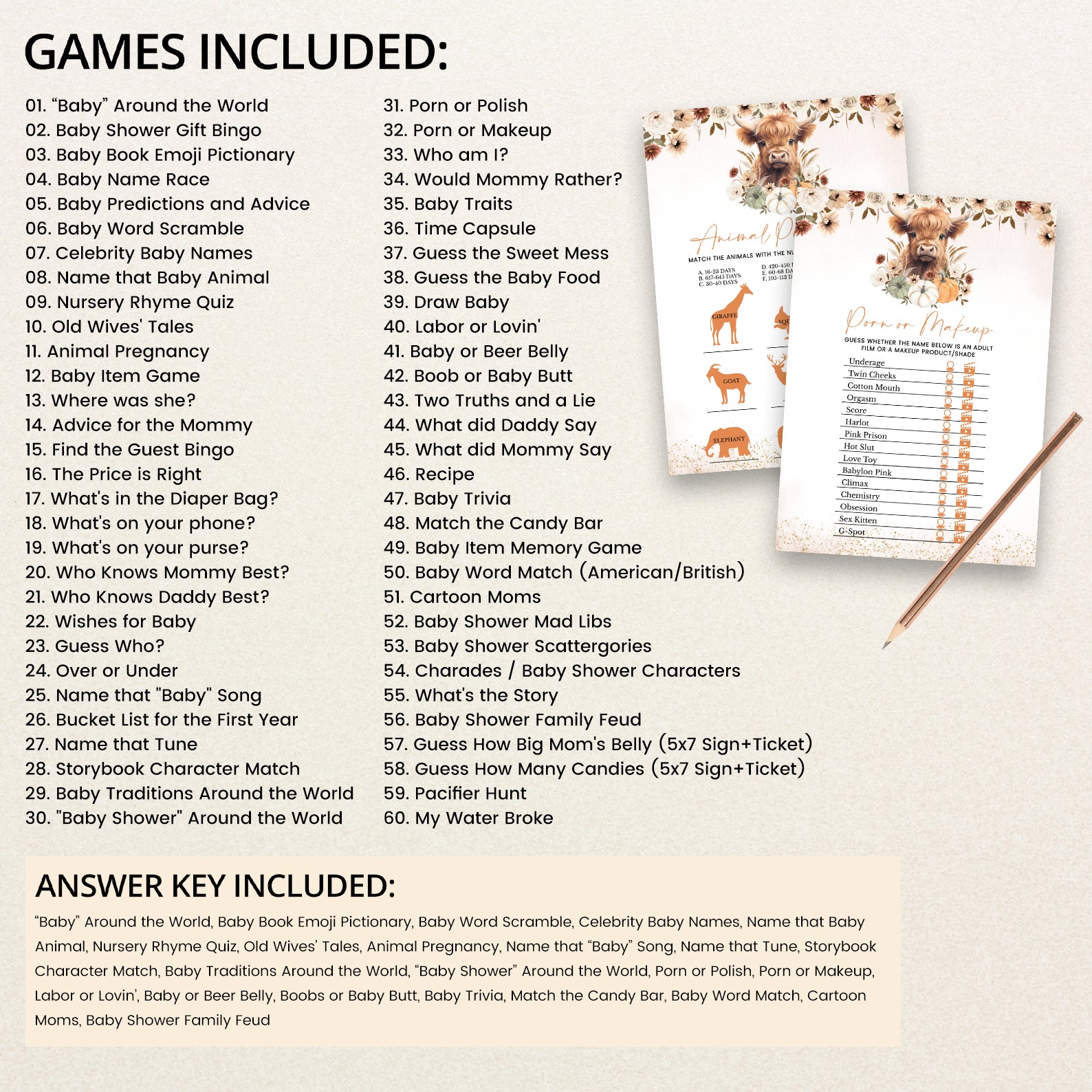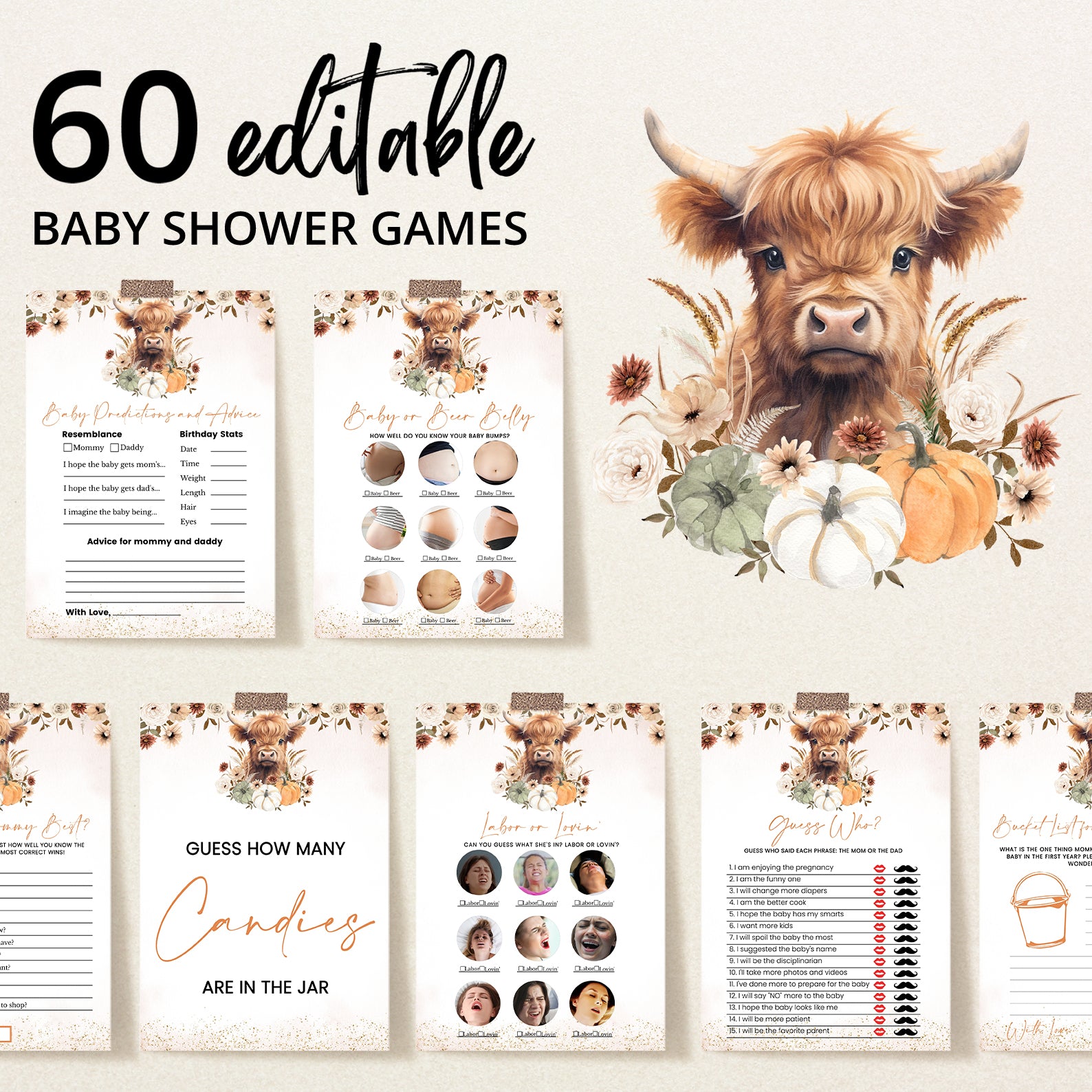 - Purchase this Fall Baby Shower Game Bundle with Highland Cow & Floral Border template