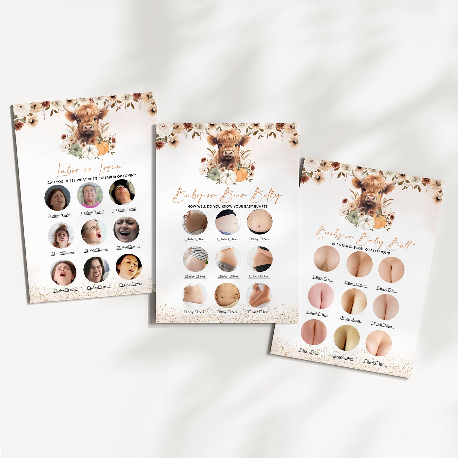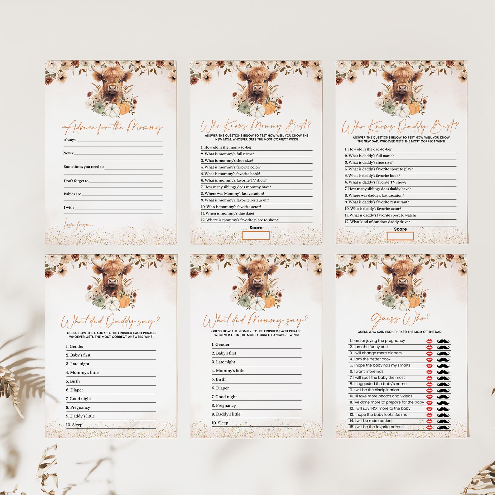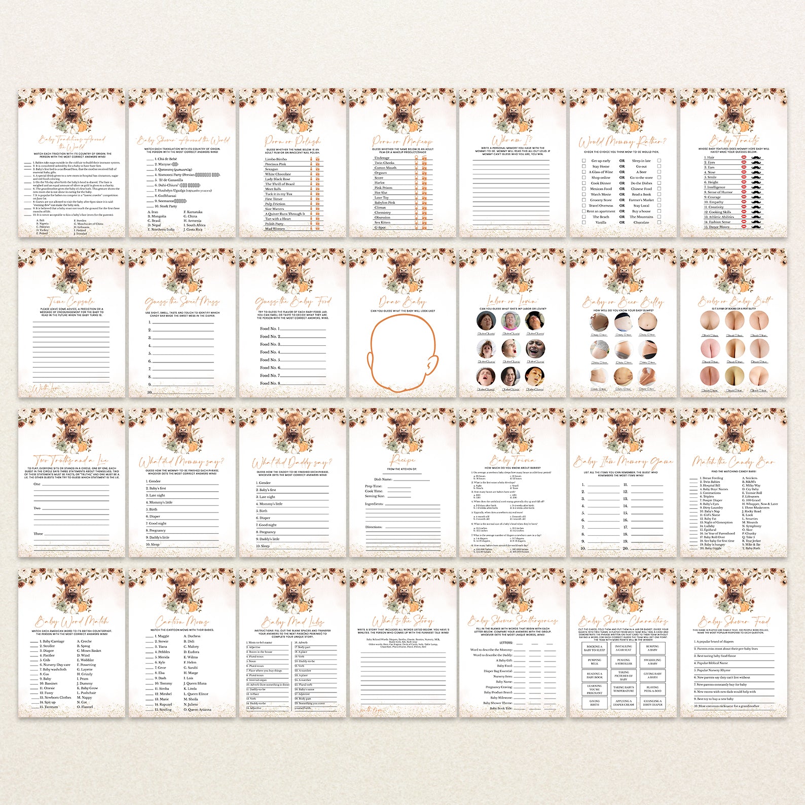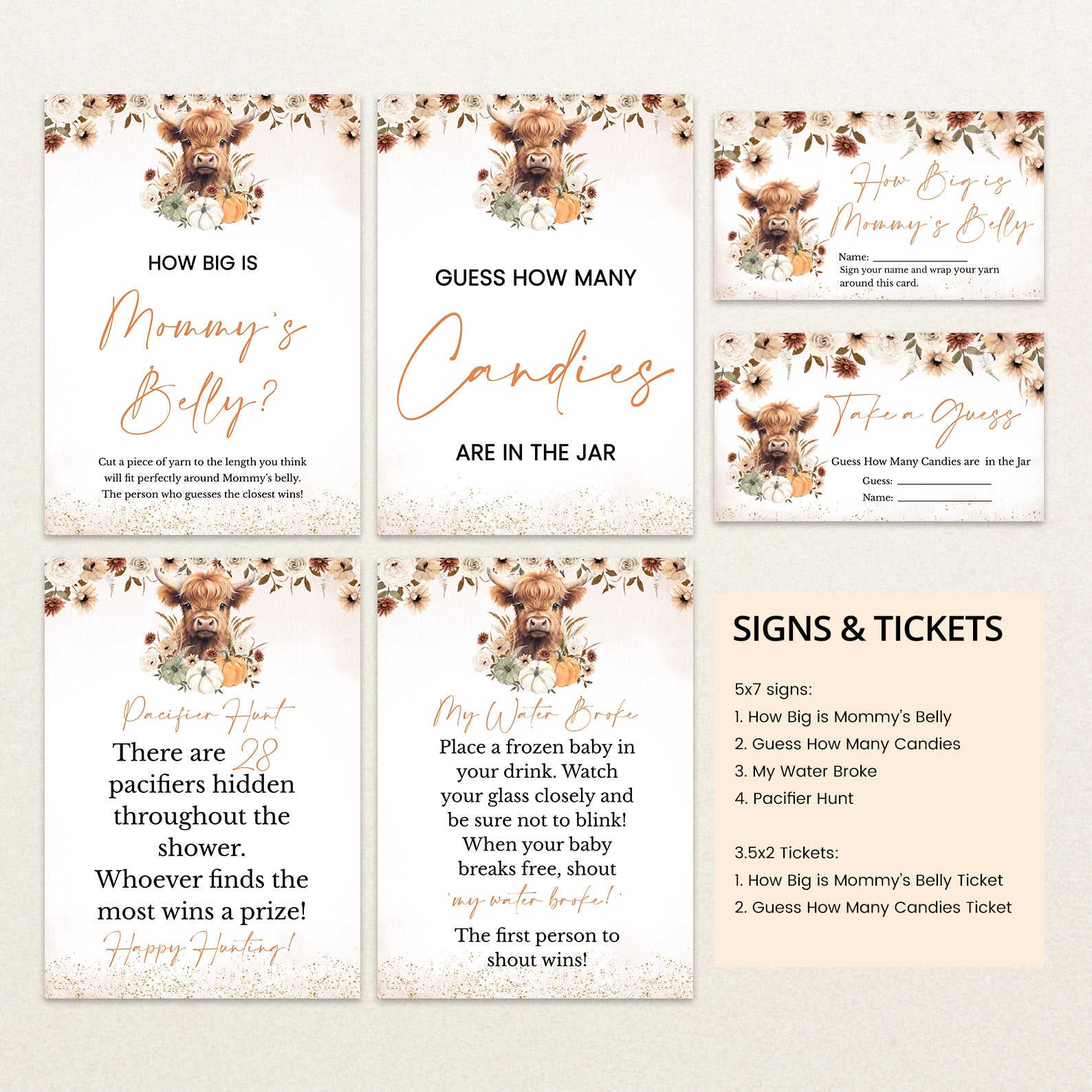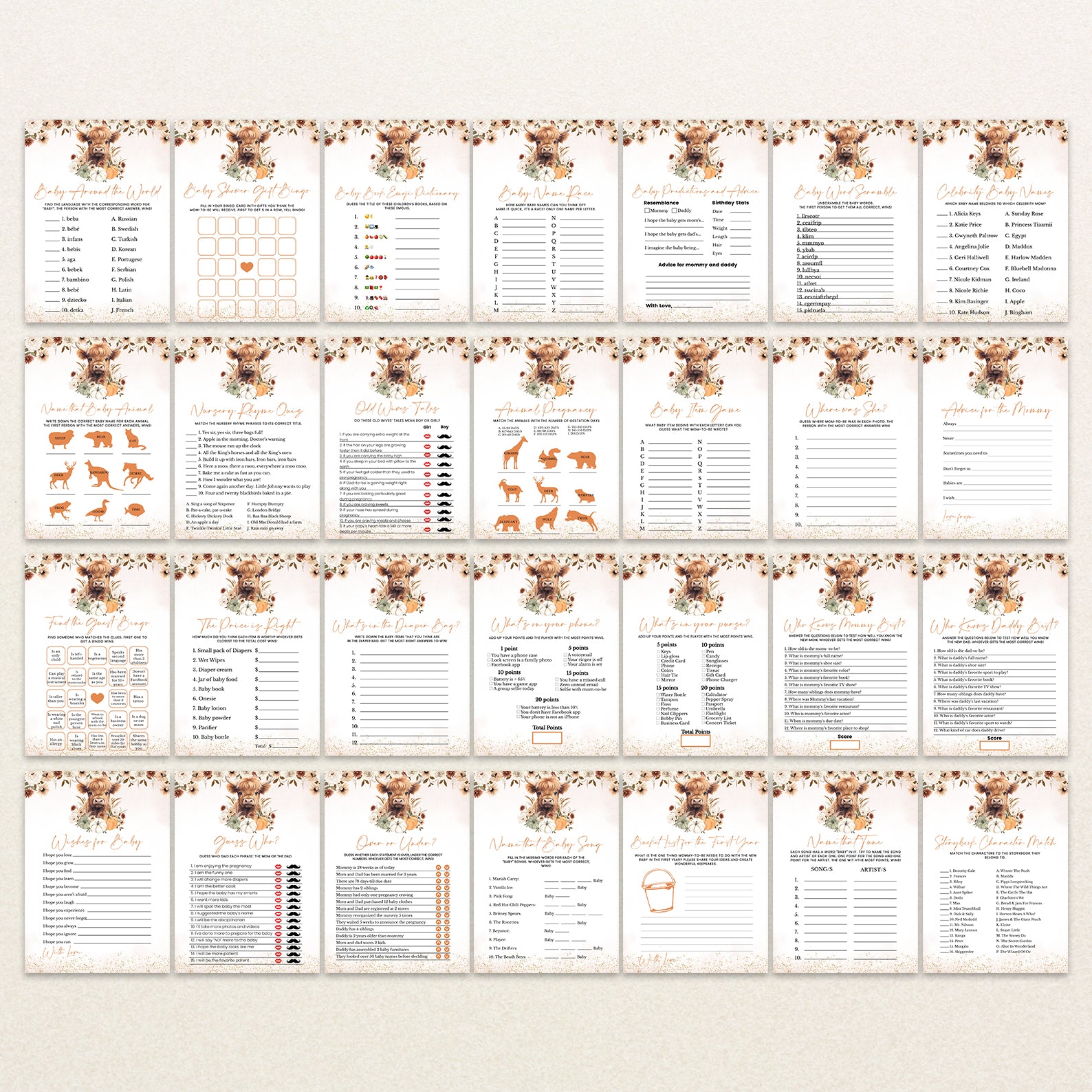 Fall Baby Shower Game Bundle with Highland Cow & Floral Border