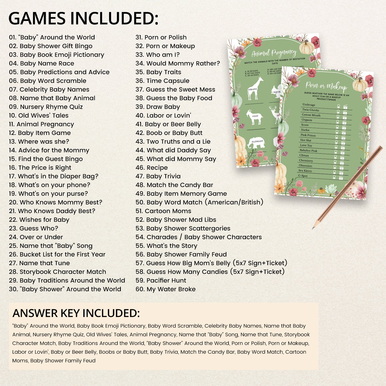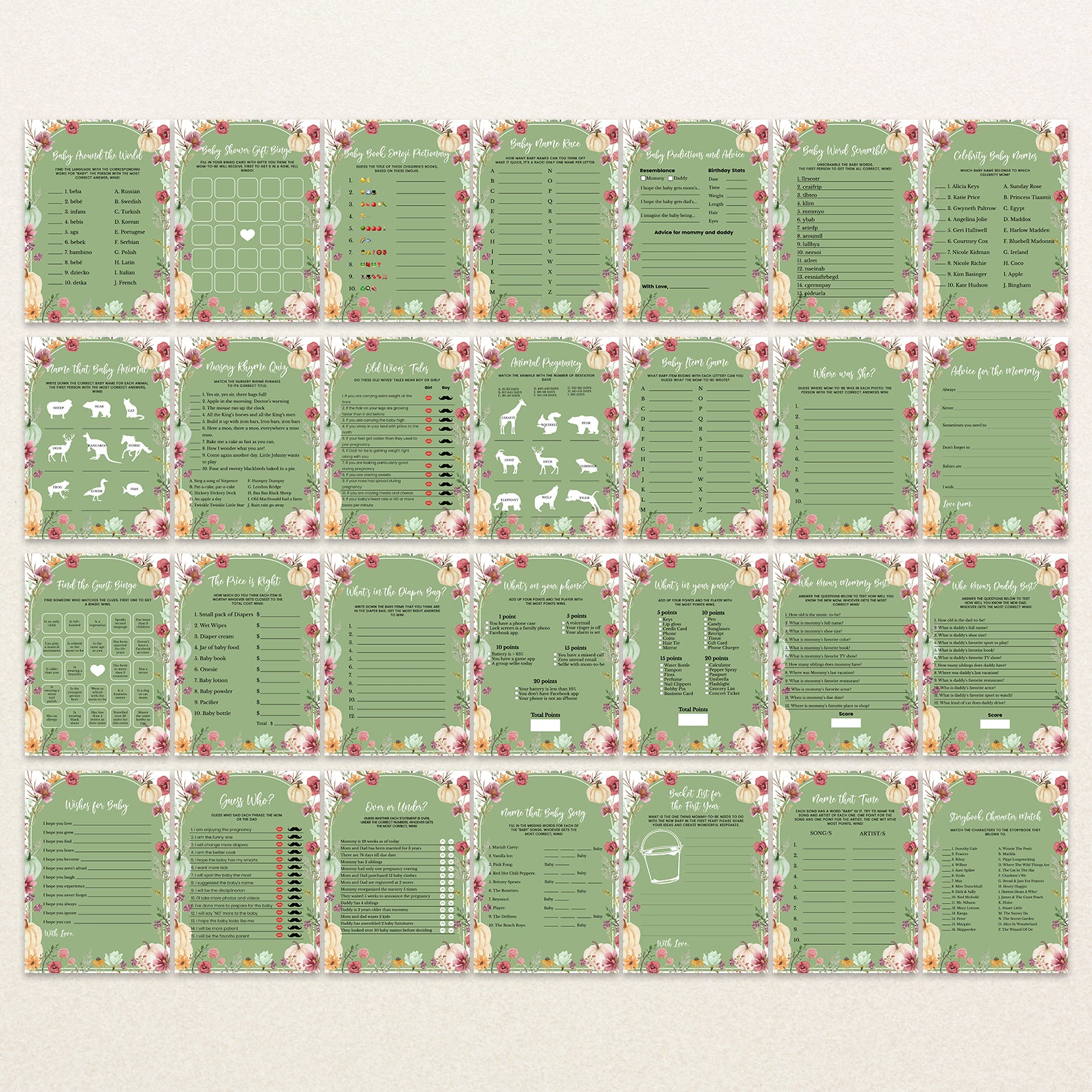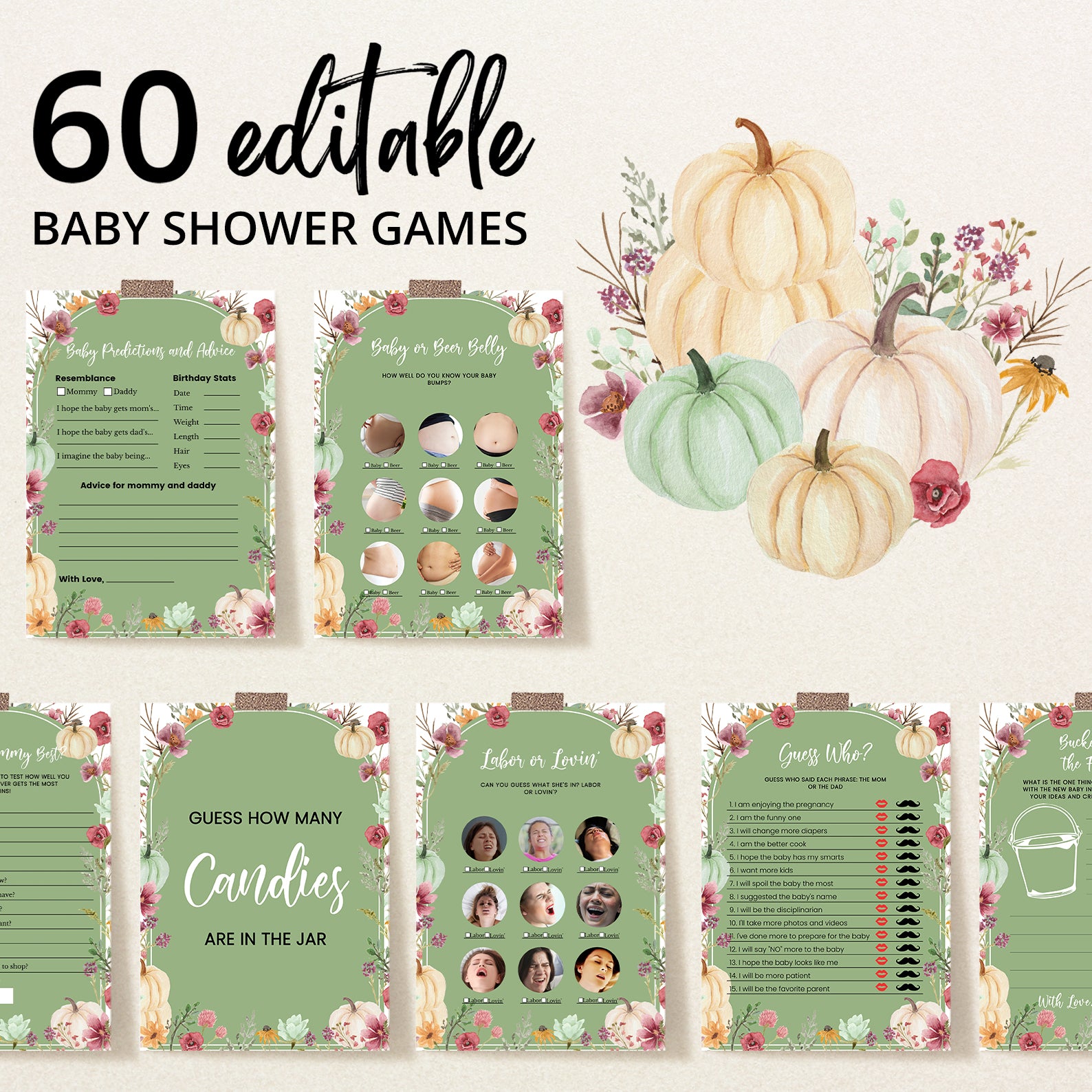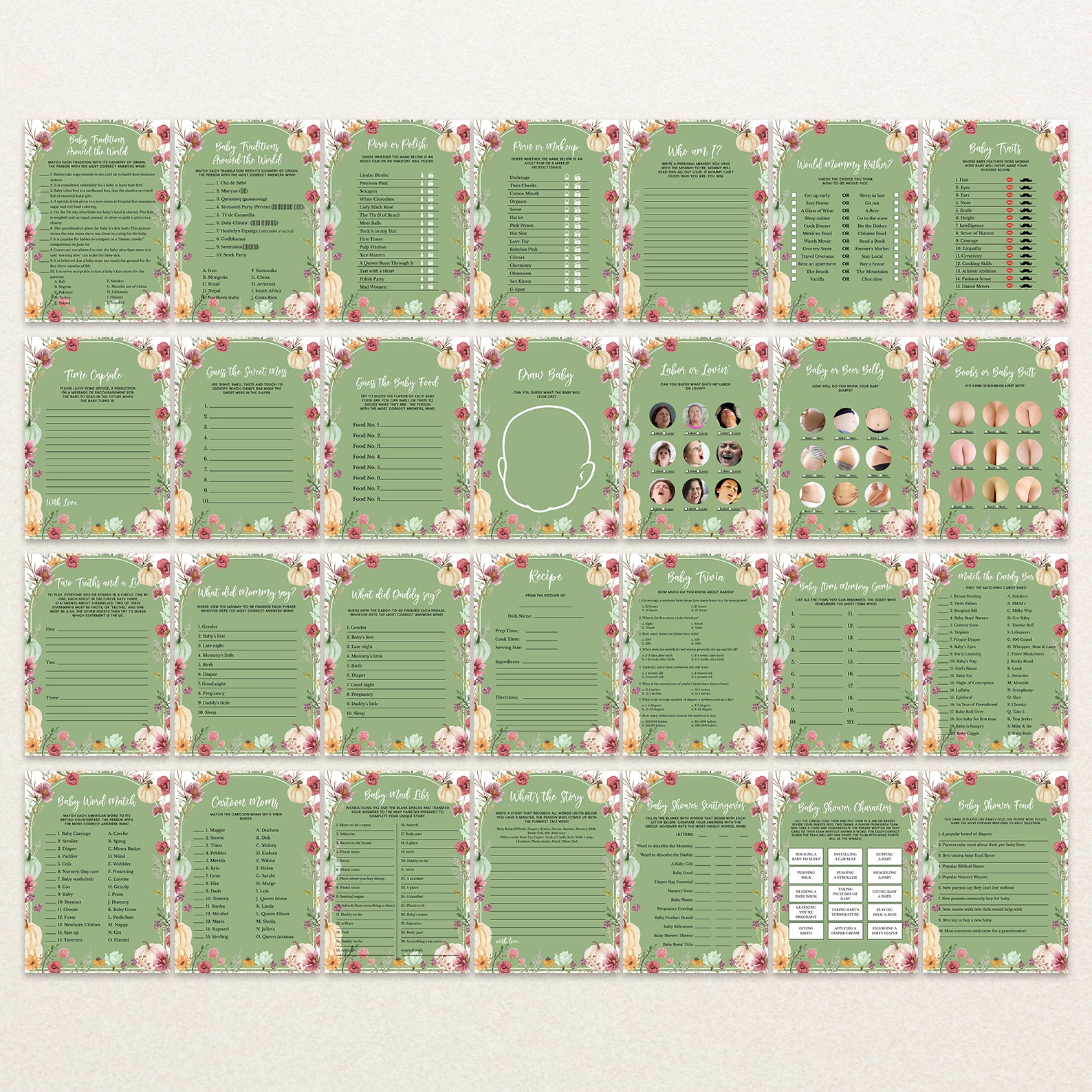 Make your fall baby shower unforgettable with this 60-game editable baby shower bundle, designed to match your cozy seasonal celebration. Each game features charming watercolor pumpkins, floral accents, and soft arches in green, orange, blue, or pink. From classics like Baby Bingo and Who Knows Mommy Best to fun icebreakers and guessing games, this bundle is perfect for entertaining guests and creating lasting memories. Easy to customize and print!