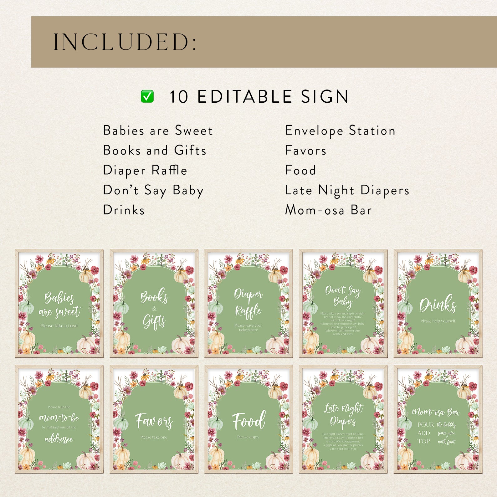 Add a festive touch to your fall baby shower with this beautifully coordinated set of ten editable table signs. Each sign features a soft arched frame in seasonal hues: green, orange, blue, or pink accented with watercolor pumpkins, wildflowers, and autumn leaves. Designed to guide guests through your celebration, signs include: Babies Are Sweet, Books and Gifts, Diaper Raffle, Don’t Say Baby, Drinks, Envelope Station, Favors, Food, Late Night Diapers, and Mom-osa Bar.