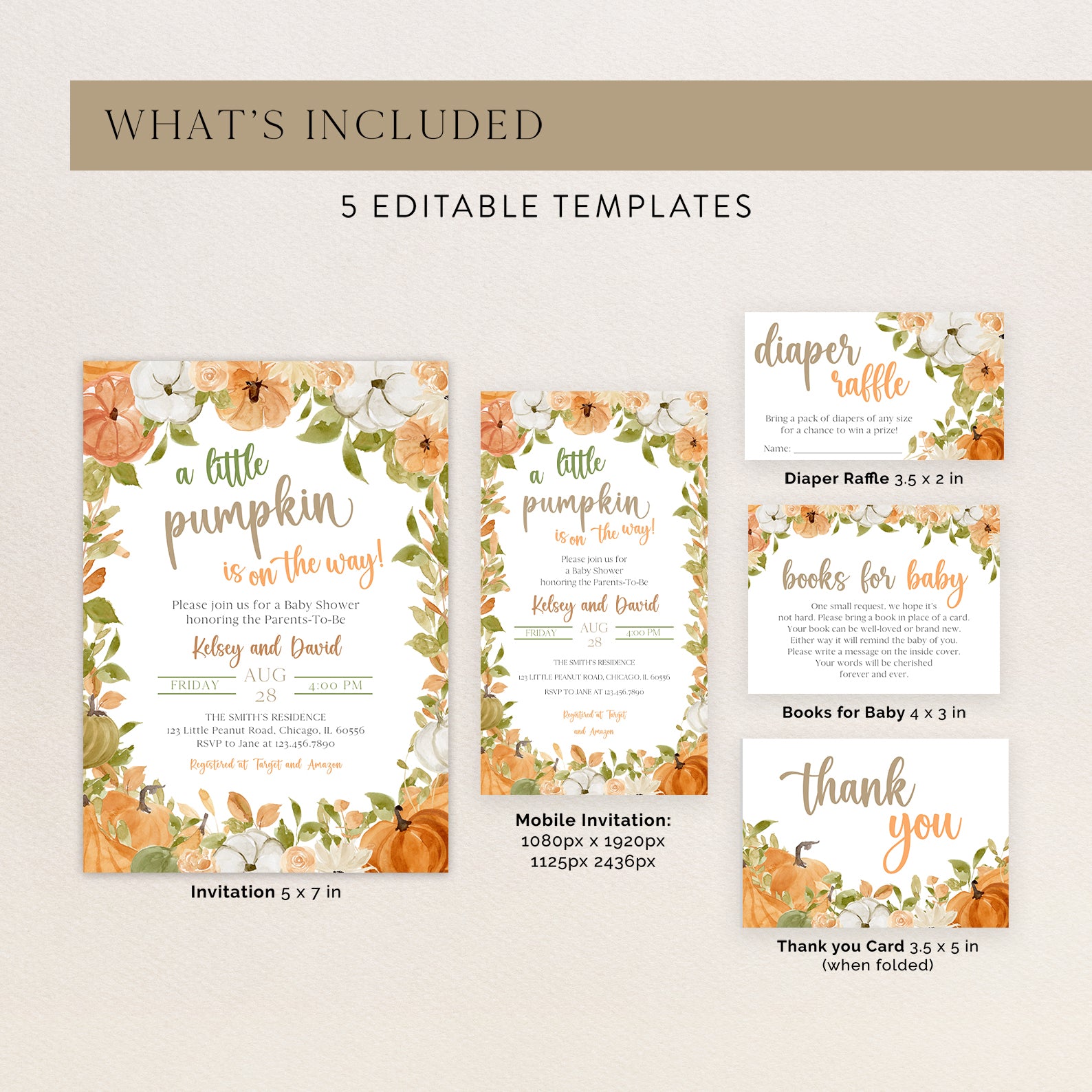 Welcome your little pumpkin with our fall baby shower invitation bundle. This set includes a digital invitation, mobile invite, diaper raffle, books for baby card, and thank you card, all adorned with vibrant orange and white pumpkins and green leaves. Perfect for a cozy autumn celebration, this bundle is easy to personalize and share with loved ones.
