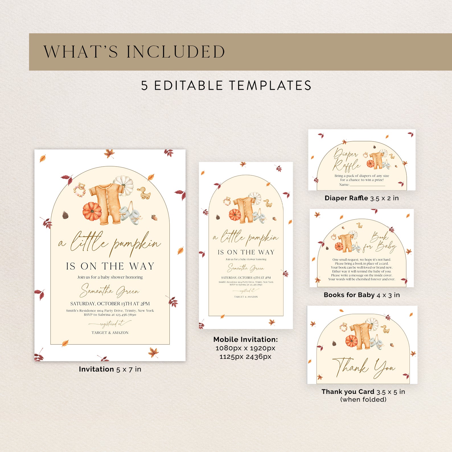 - Purchase this Fall Baby Shower Invite Bundle: Orange Baby Suit & Pumpkins template