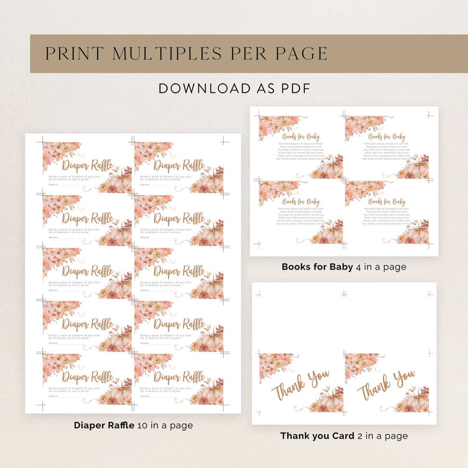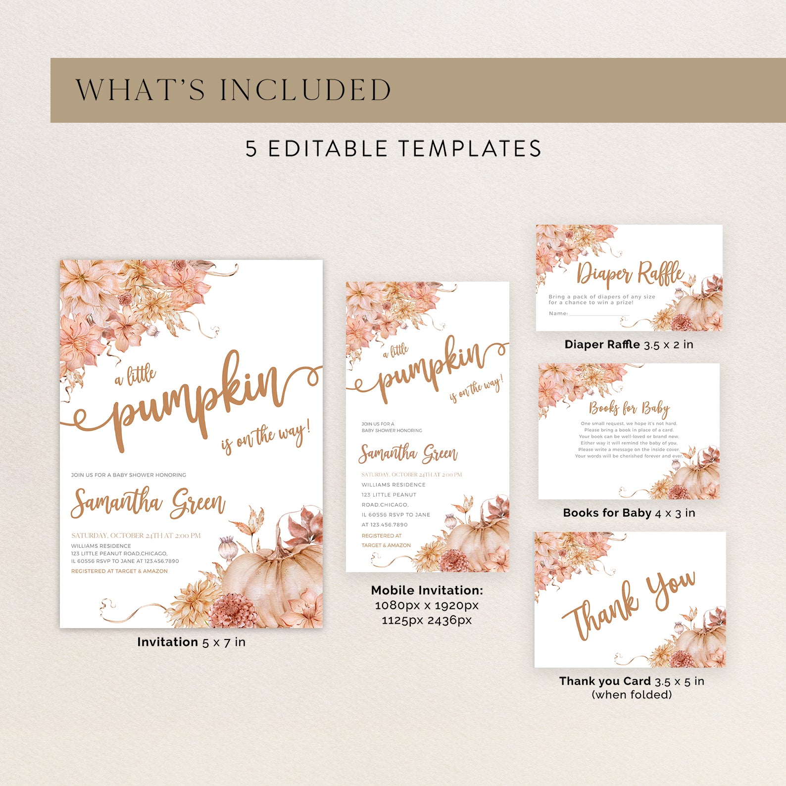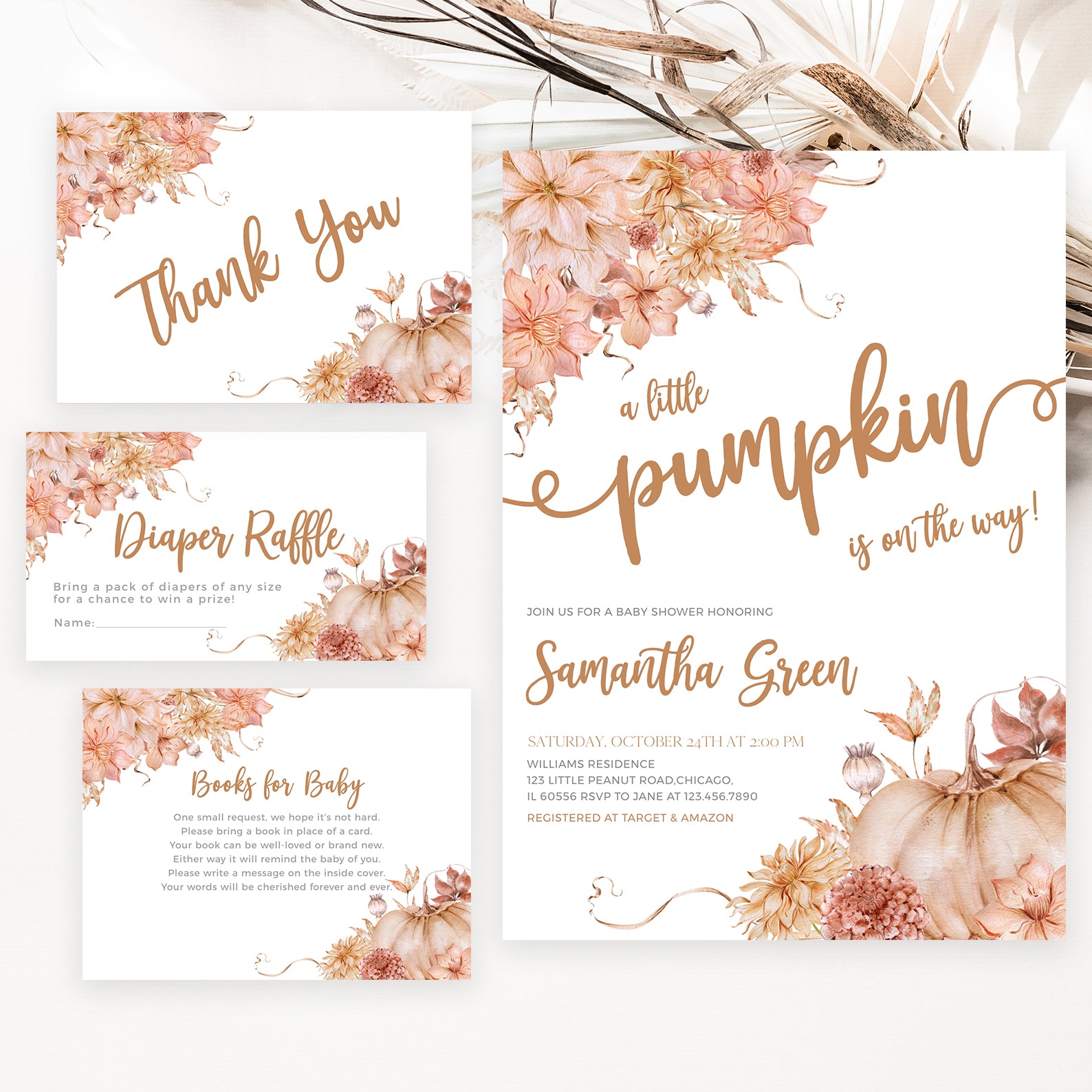 Welcome your little one with our fall baby shower invitation bundle. This set includes a digital invitation, mobile invite, diaper raffle, books for baby card, and thank you card, all featuring a charming pumpkin design with a floral border. Perfect for adding elegance and seasonal warmth to your autumn celebration.
