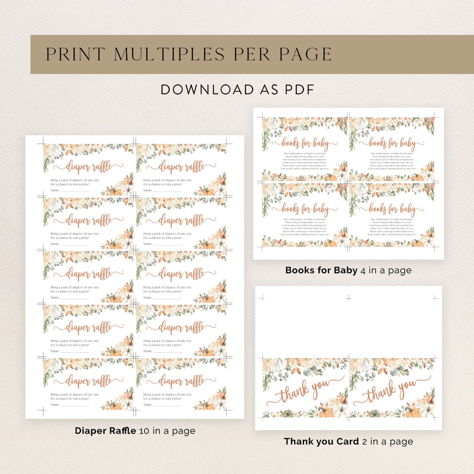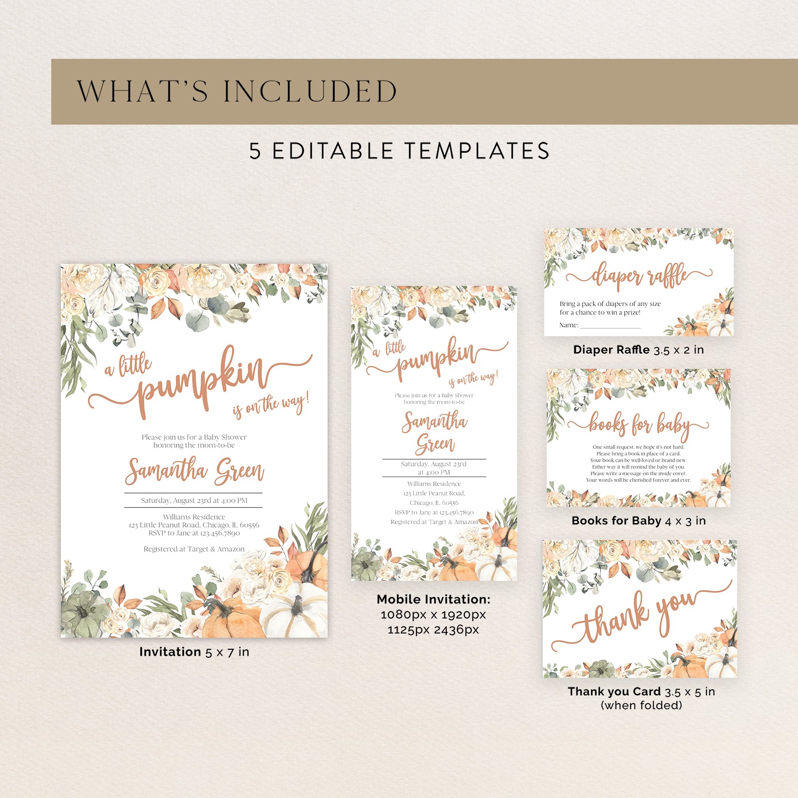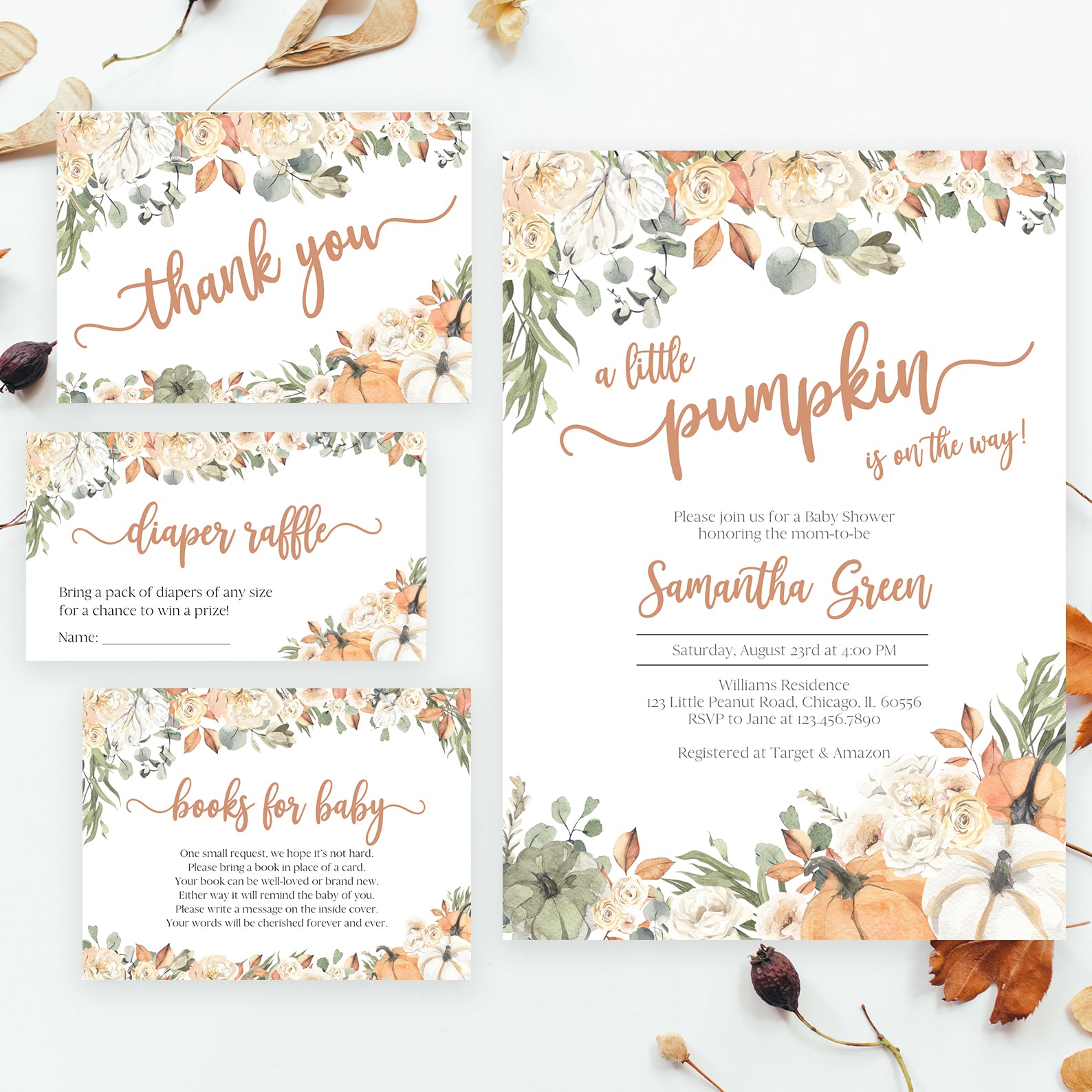 Welcome your little one with our fall baby shower invitation bundle. This set includes a digital invitation, mobile invite, diaper raffle, books for baby card, and thank you card, all featuring a charming pumpkin design bordered by roses and green leaves. Ideal for creating a warm, autumn-inspired celebration that your guests will remember.