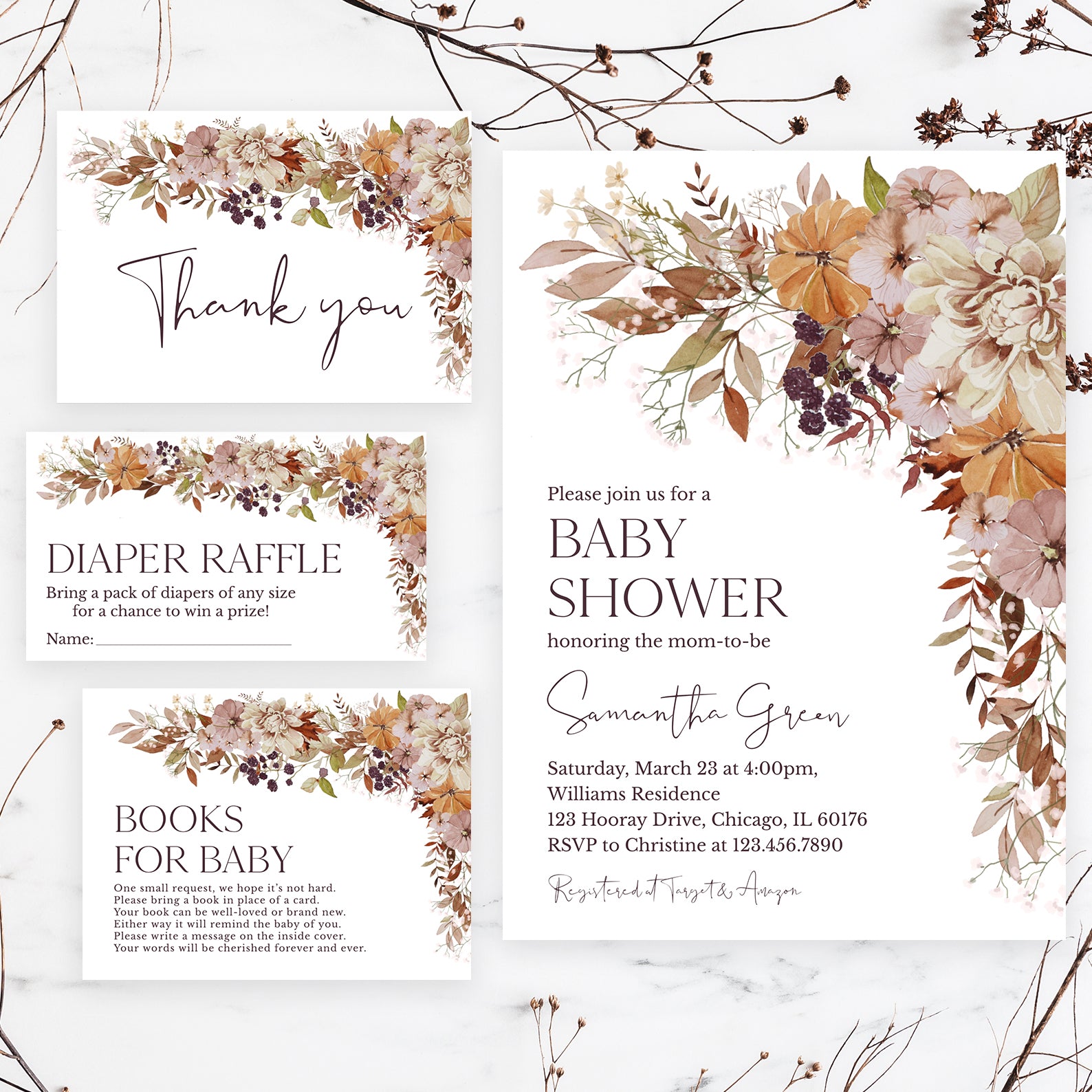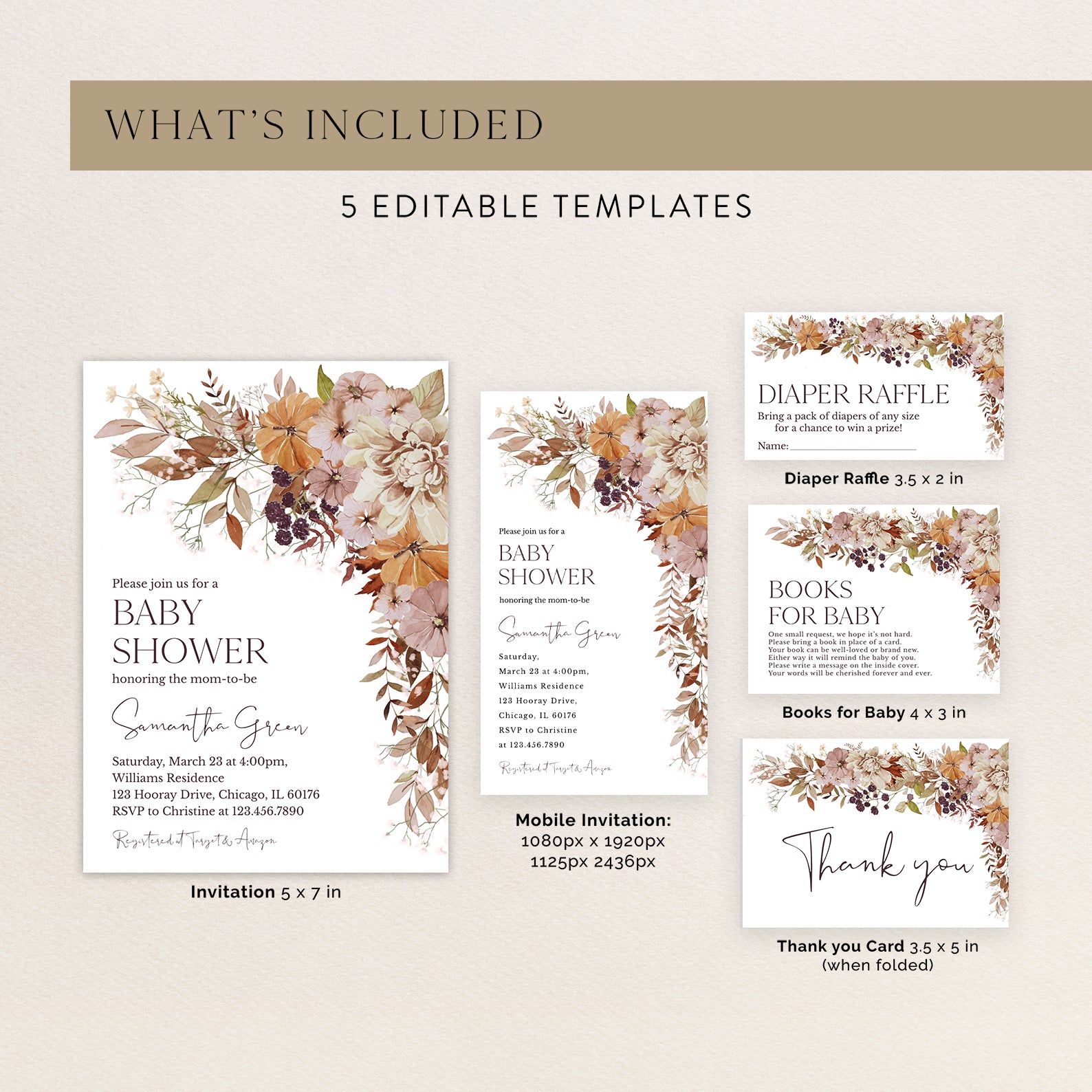 - Purchase this Fall Baby Shower Invite Bundle with Dried Leaves, Flowers & Pumpkins template