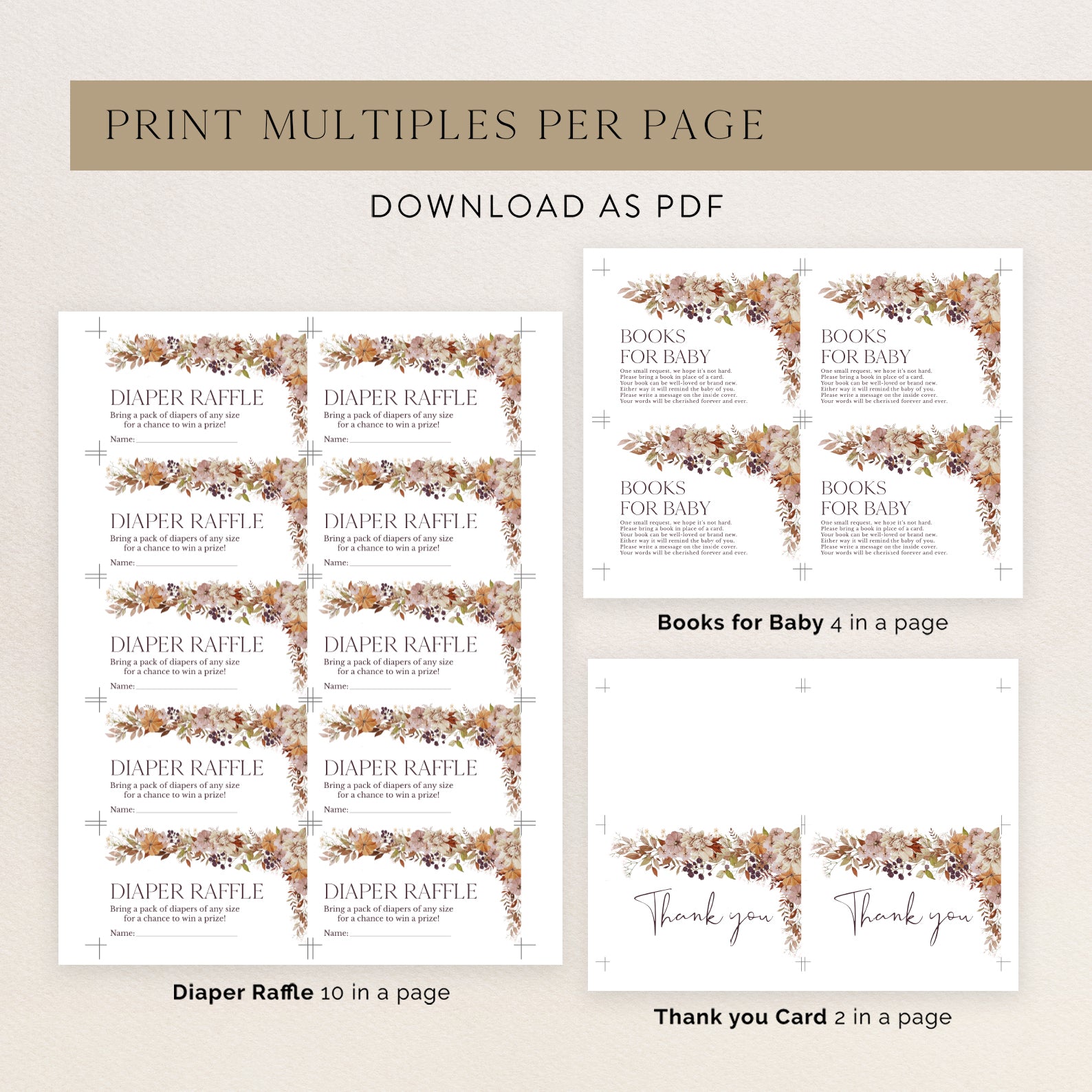 Welcome the season with our Fall Baby Shower Bundle. This set includes a digital invitation, mobile invite, diaper raffle, books for baby, and thank you card, all featuring autumn dried leaves, vibrant flowers, and pumpkins. Perfect for adding a cozy, festive touch to your celebration.