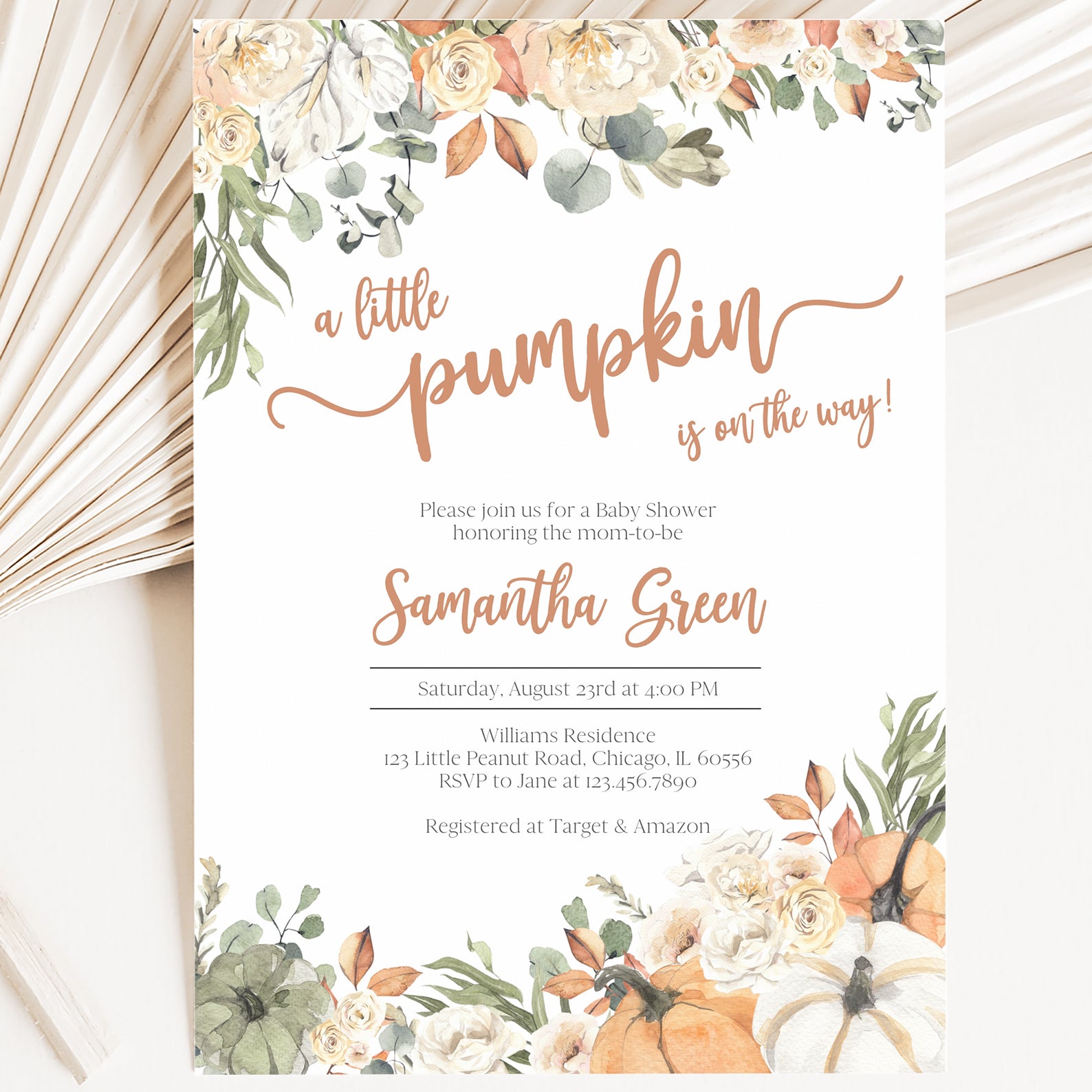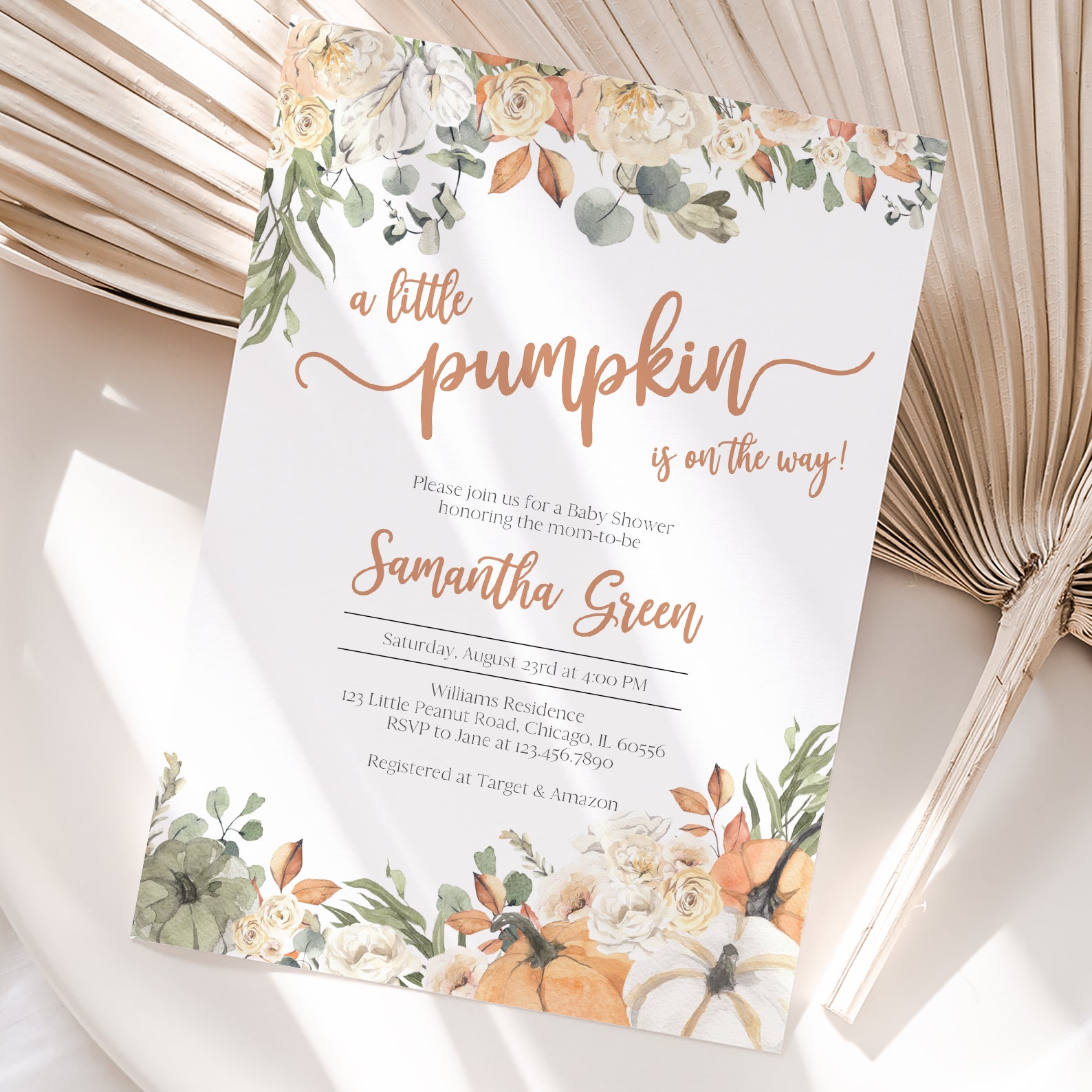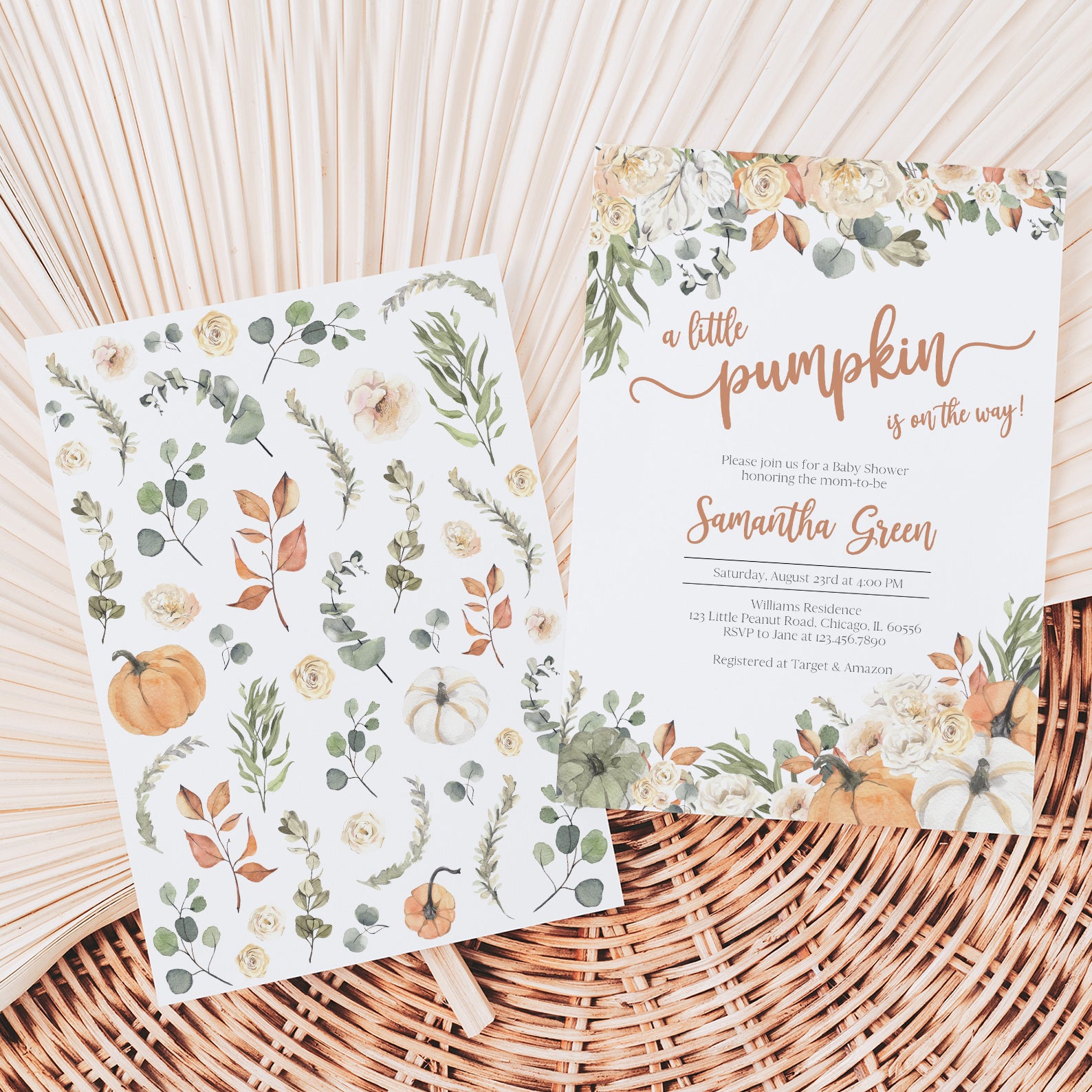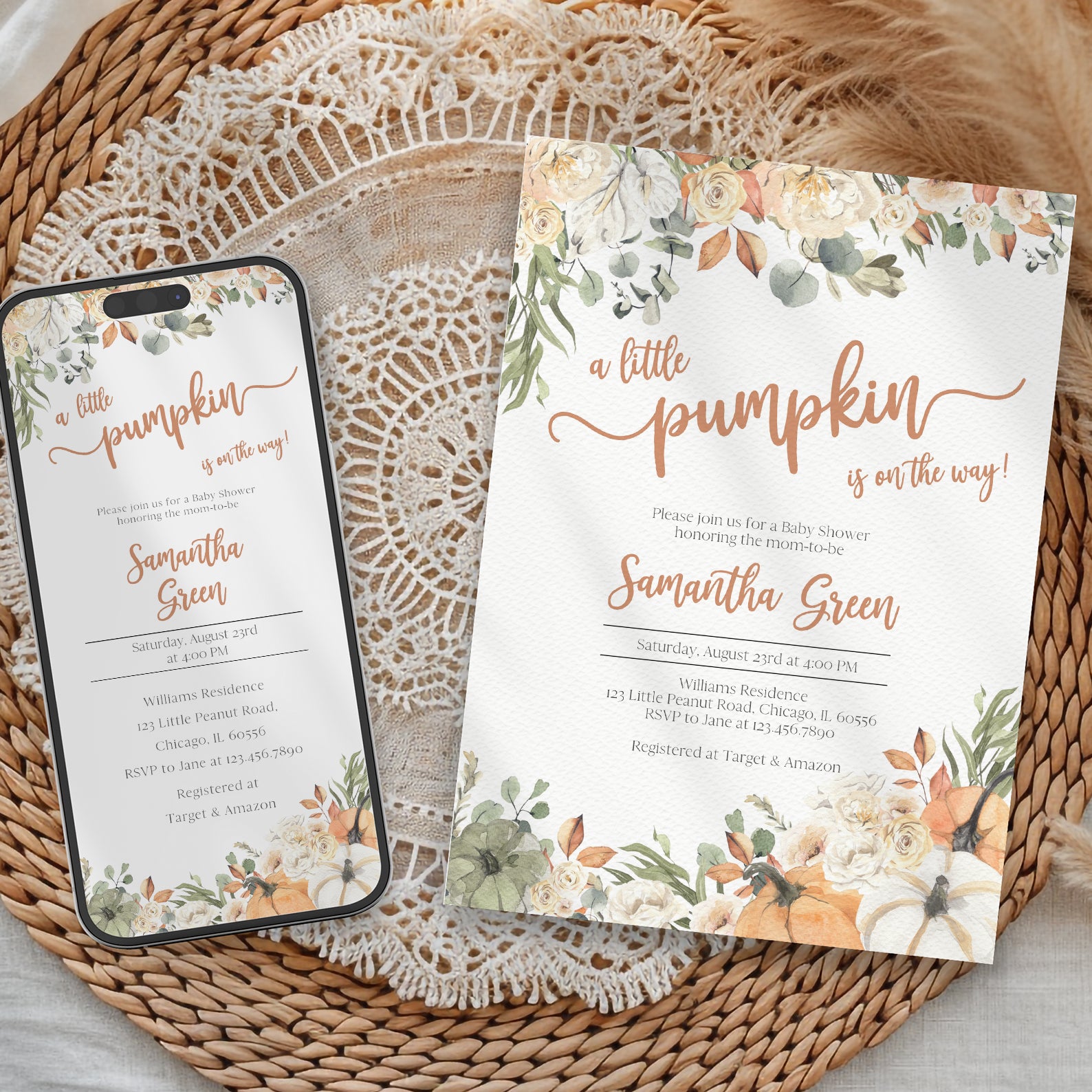 Celebrate your little one's arrival with our fall baby shower digital invitation! Featuring a charming little pumpkin surrounded by a border of roses and lush green leaves, this design captures autumn's essence. The bottom showcases vibrant green, orange, and white pumpkins with more green leaves, creating a warm and inviting atmosphere. Perfect for setting the tone of a cozy, memorable celebration!