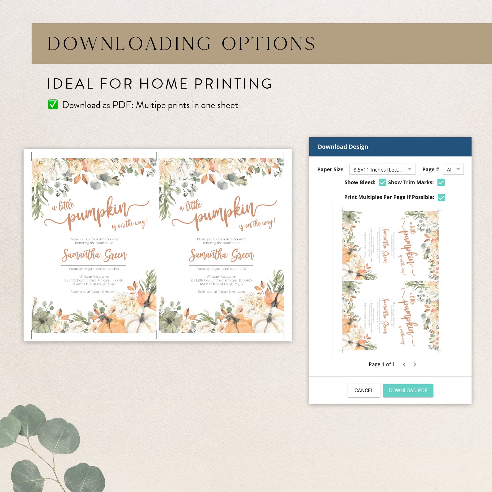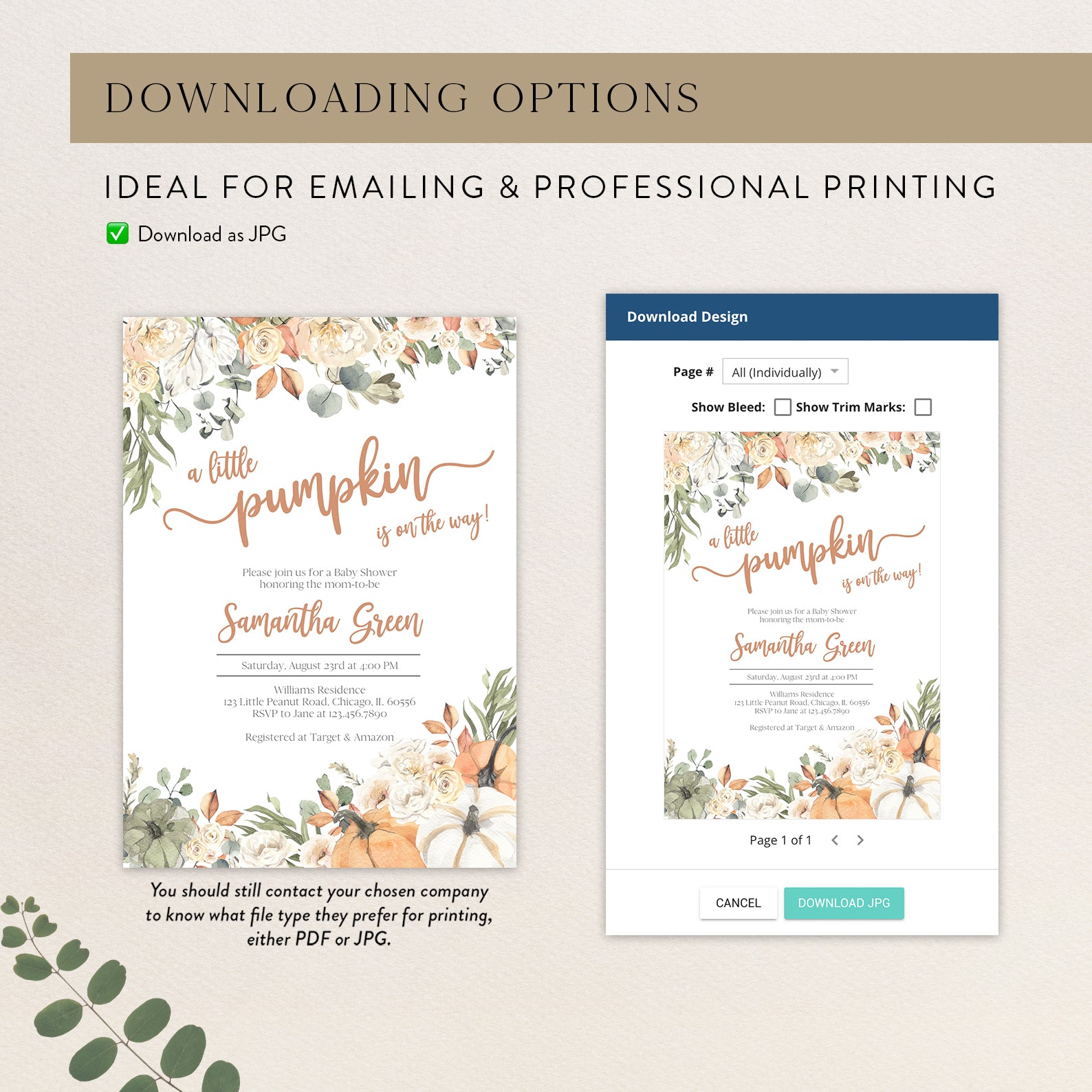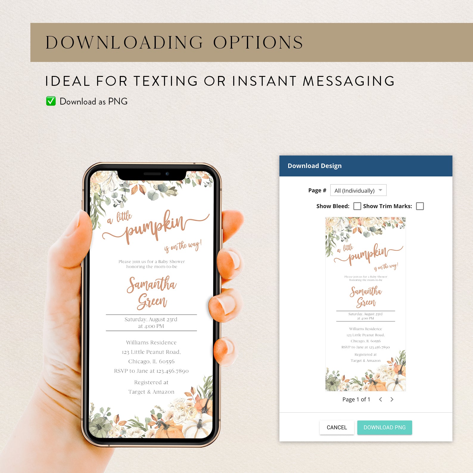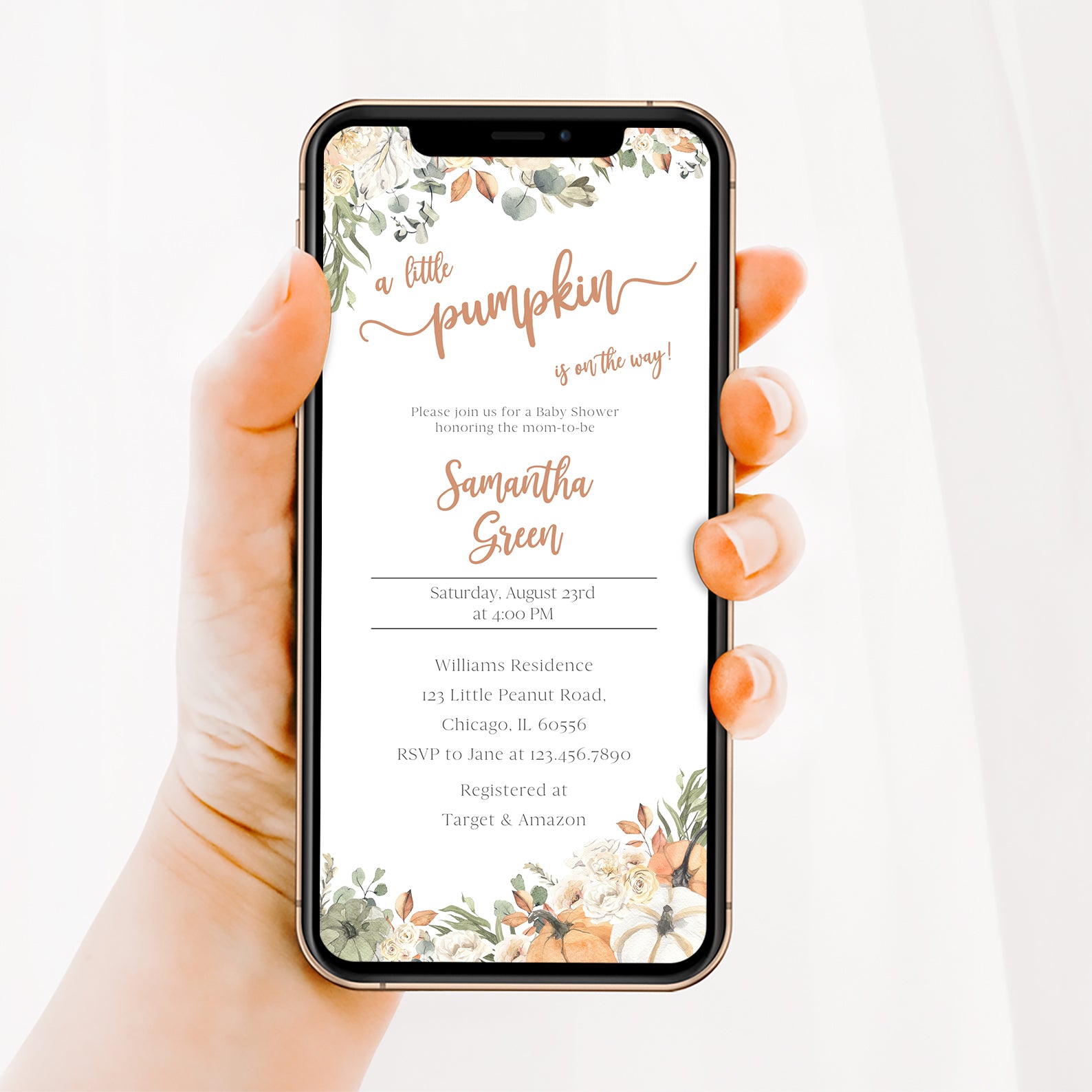 Celebrate your little one's arrival with our fall baby shower digital invitation! Featuring a charming little pumpkin surrounded by a border of roses and lush green leaves, this design captures autumn's essence. The bottom showcases vibrant green, orange, and white pumpkins with more green leaves, creating a warm and inviting atmosphere. Perfect for setting the tone of a cozy, memorable celebration!