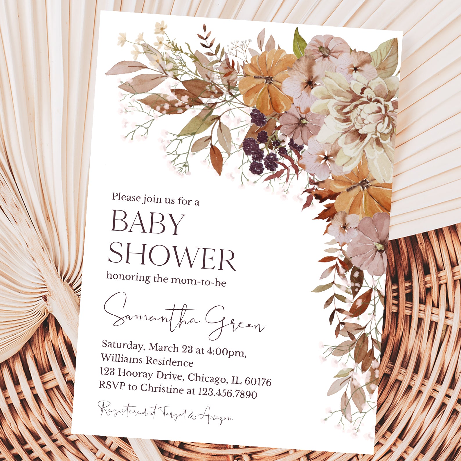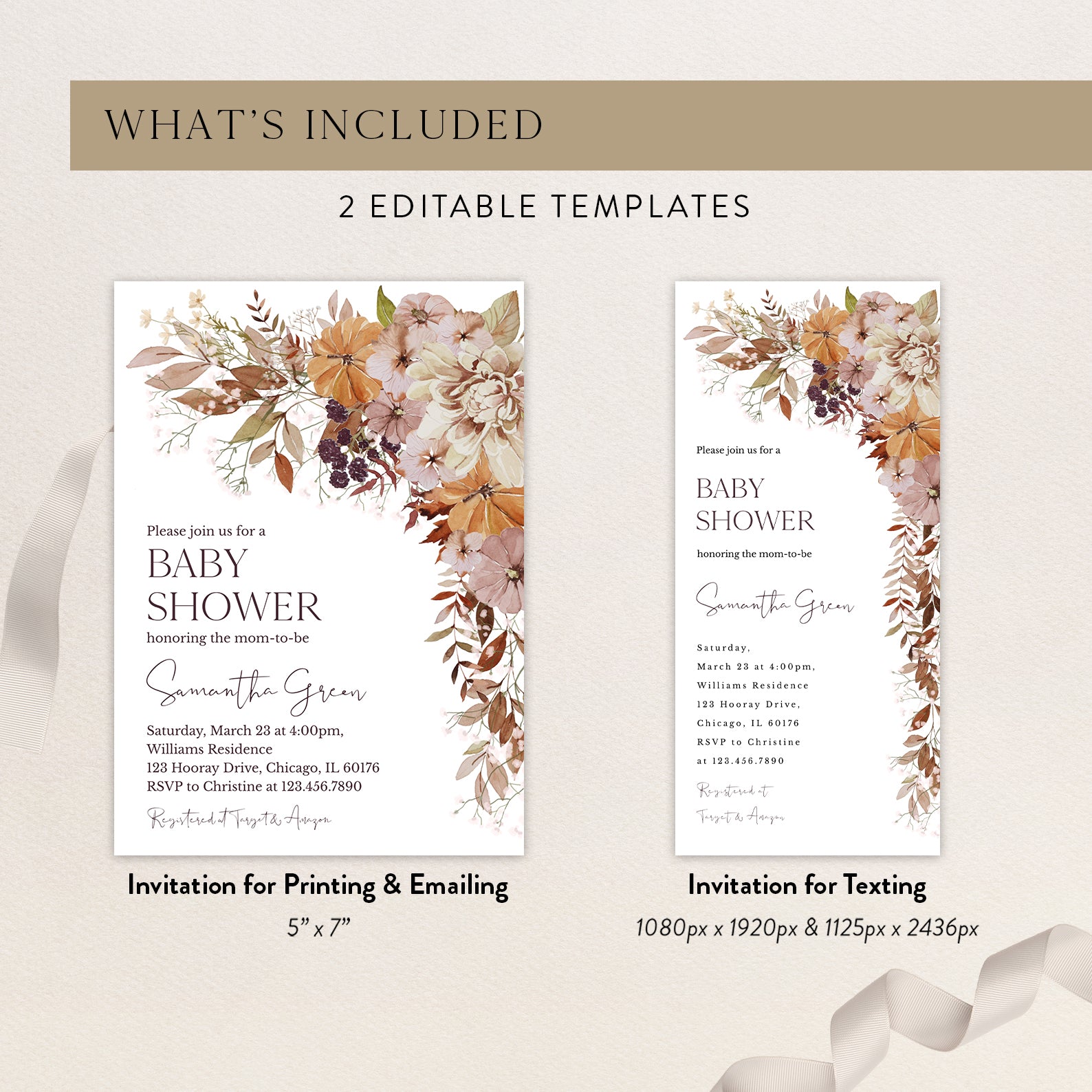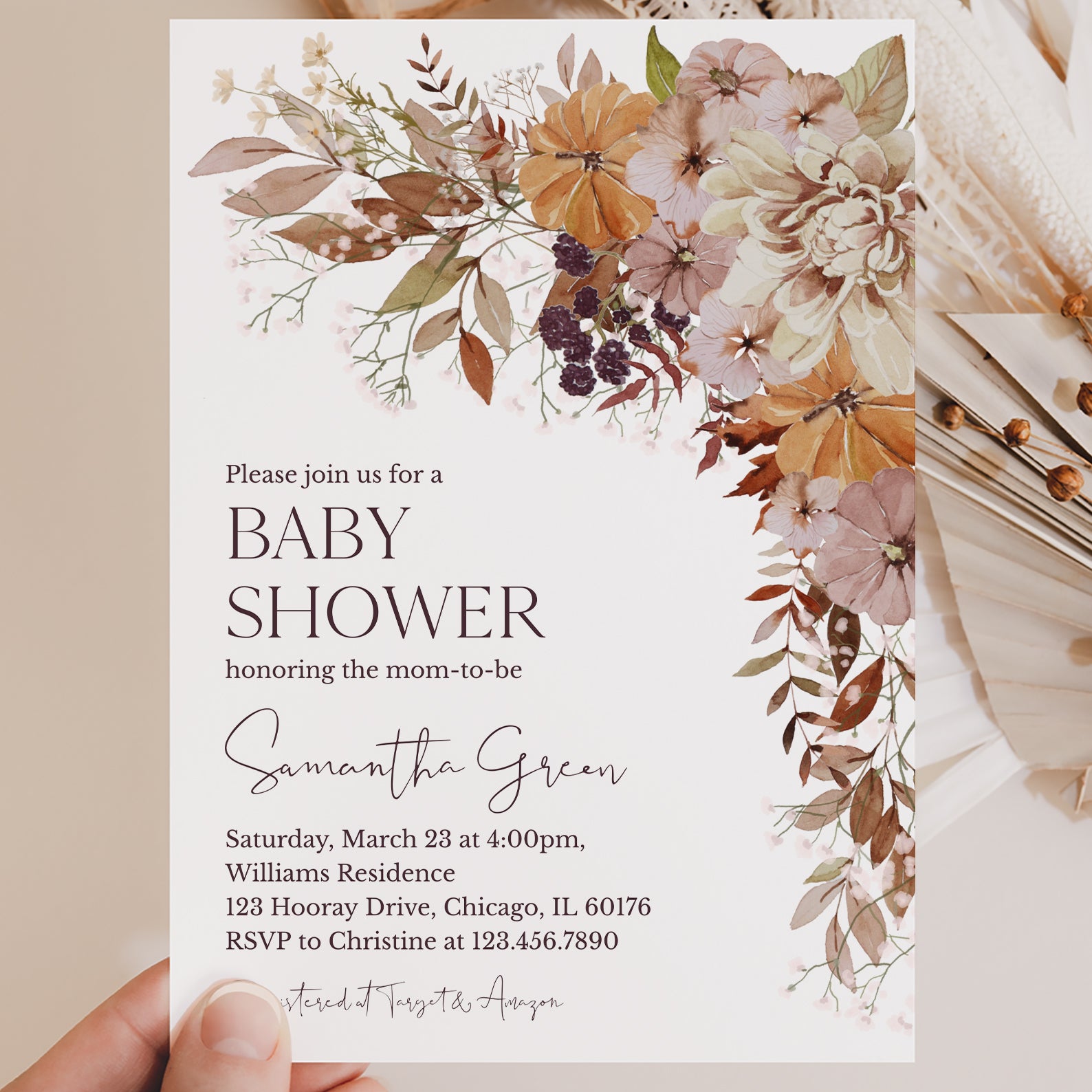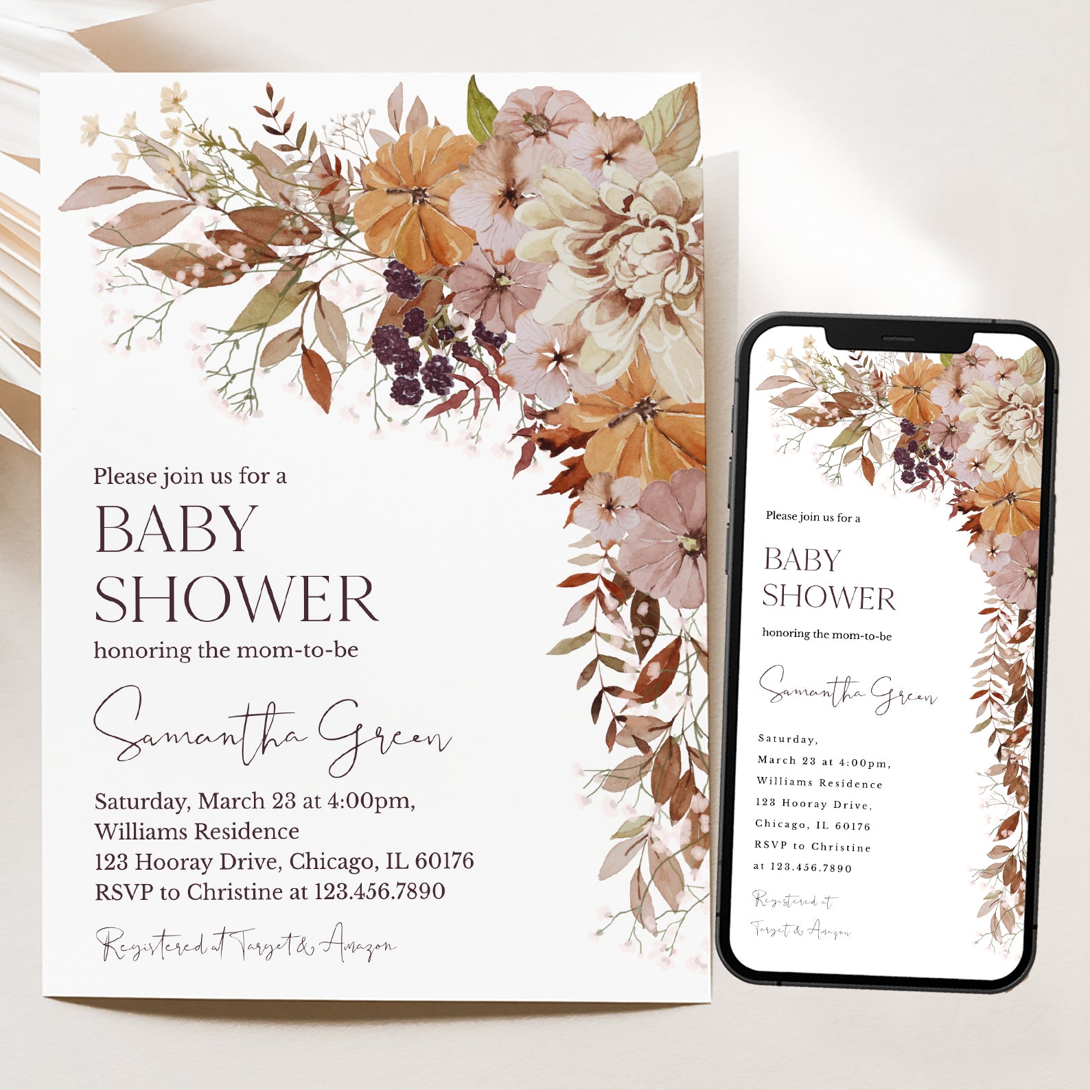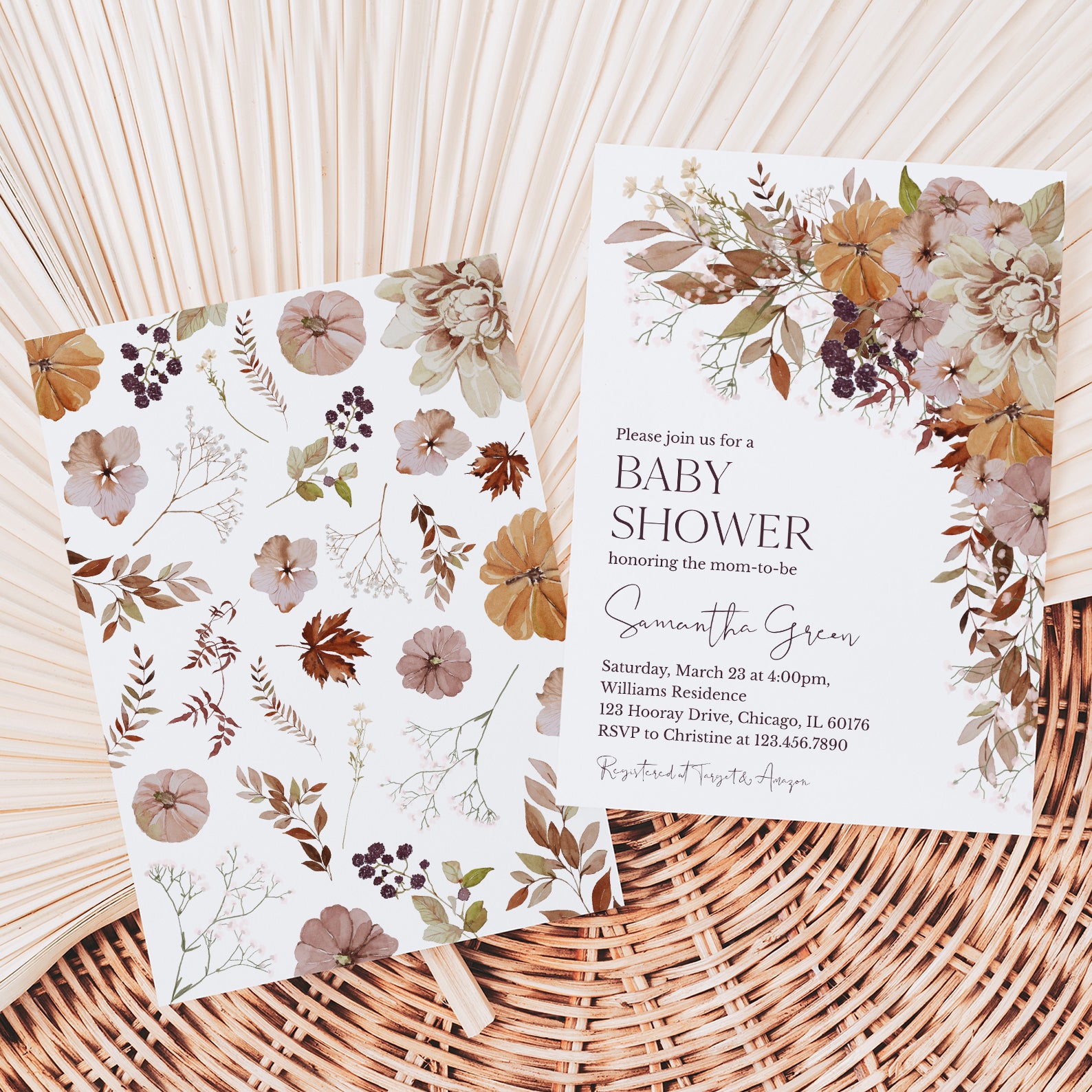 - Purchase this Fall Baby Shower Invite with Dried Leaves, Flowers & Pumpkins template