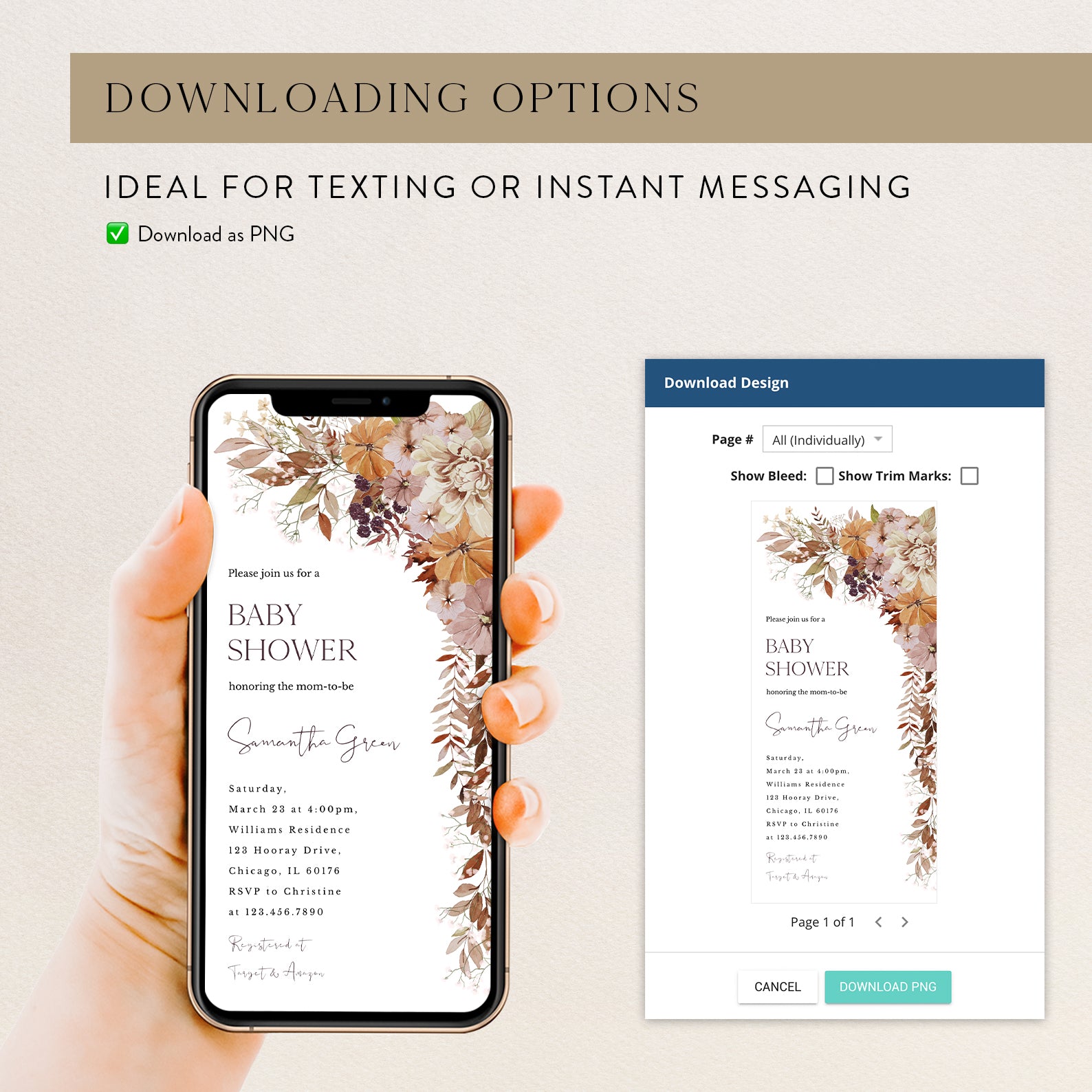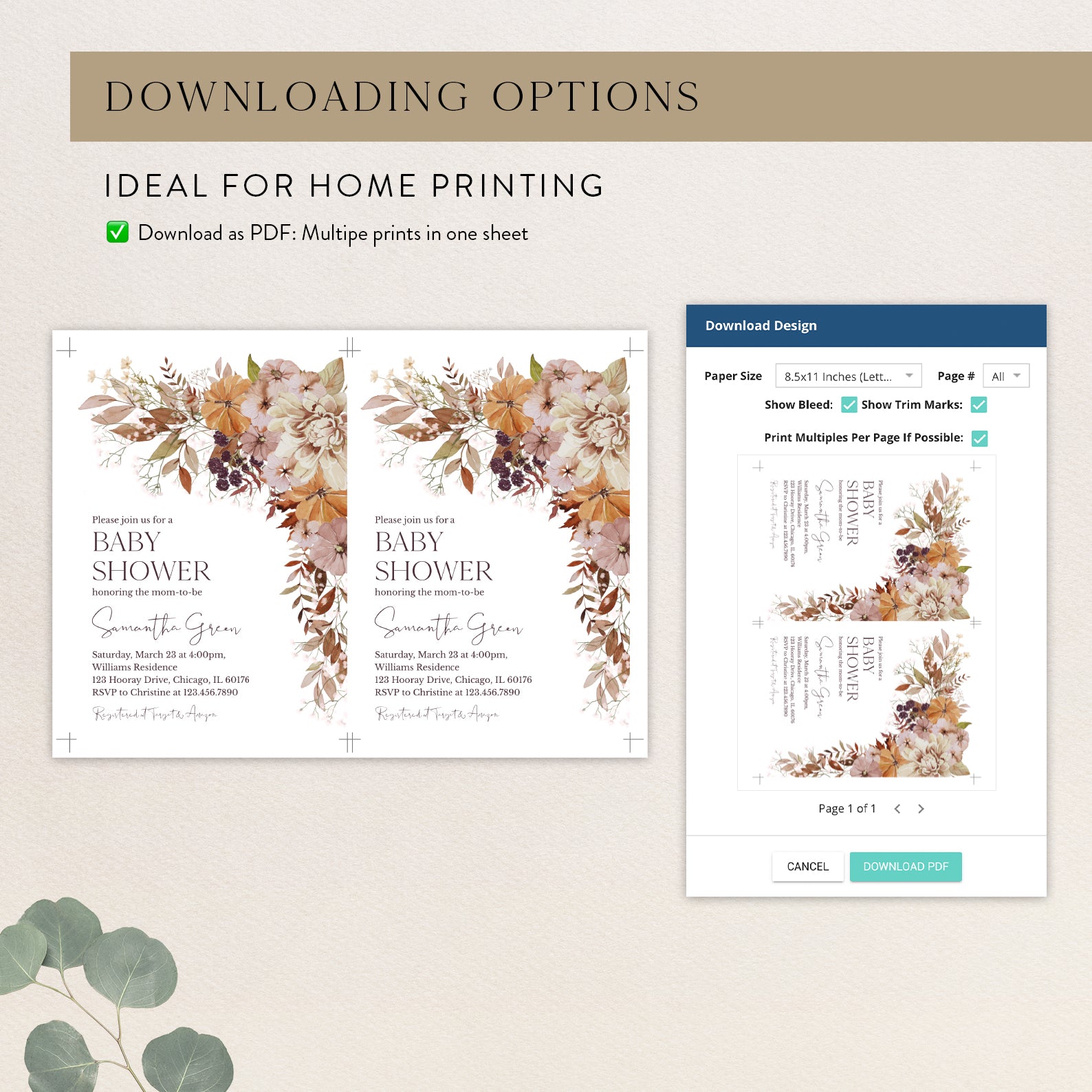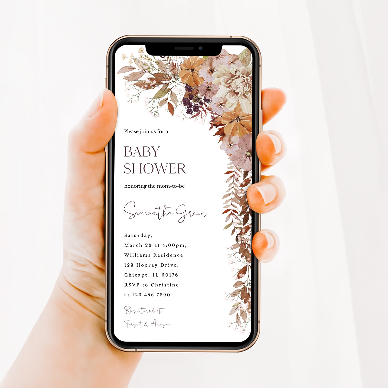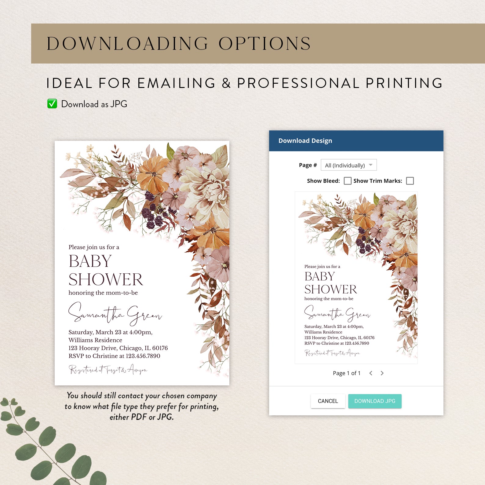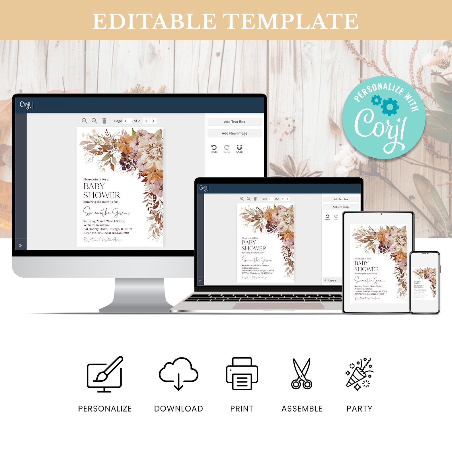 - Purchase this Fall Baby Shower Invite with Dried Leaves, Flowers & Pumpkins template