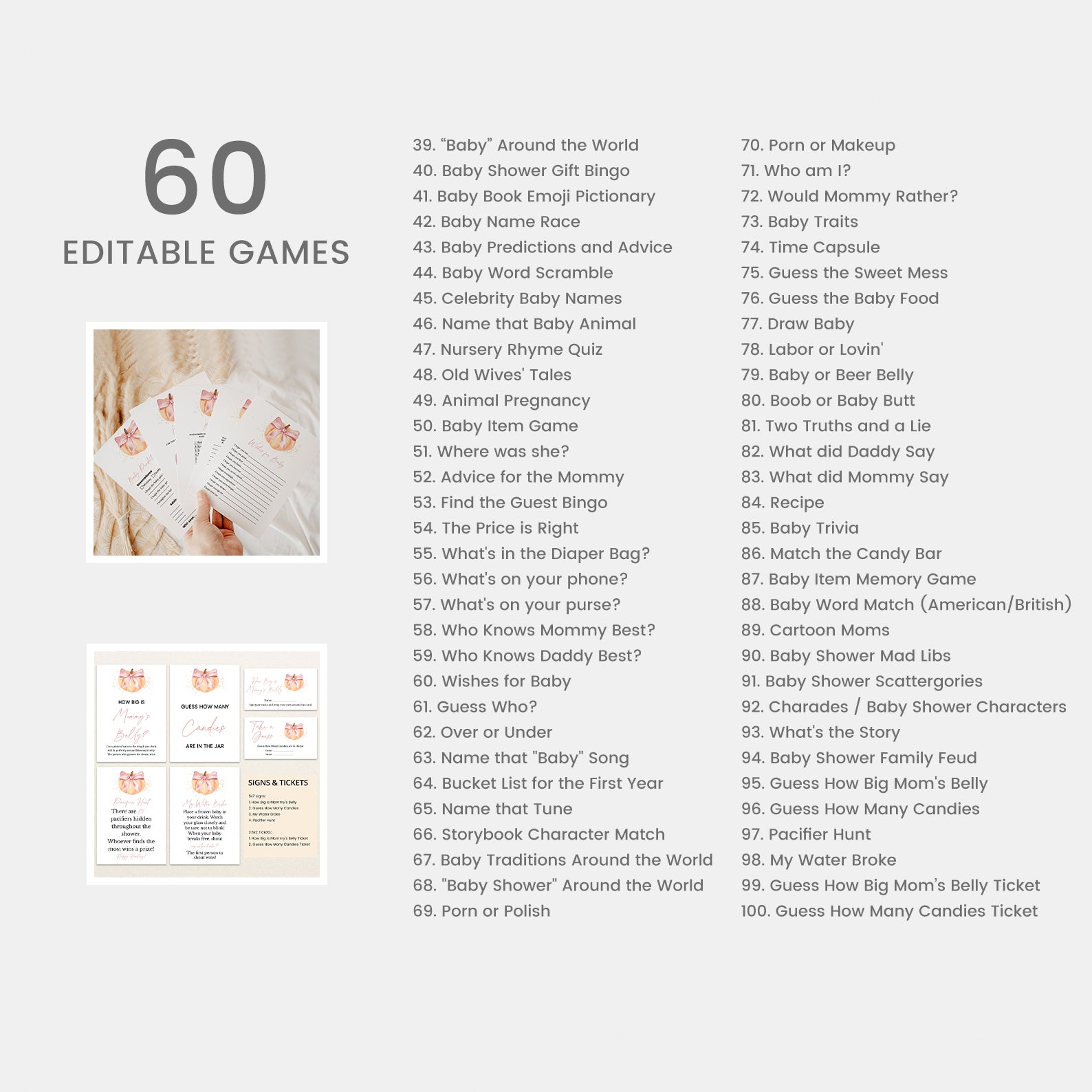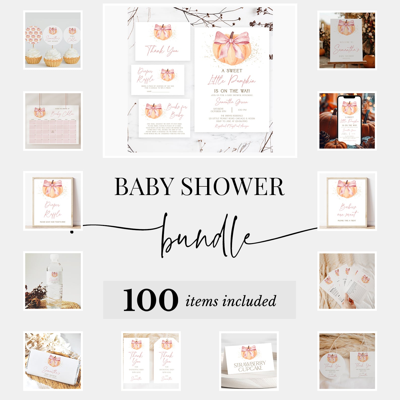 Celebrate your little pumpkin’s arrival with this all-in-one Fall Baby Shower Mega Bundle! Featuring 100 editable items, this set includes everything from invitations and thank you cards to welcome signs, favor tags, labels, cupcake toppers, chocolate wrappers, and 60 fun games. Designed with a charming orange pumpkin, soft pink ribbon, and elegant gold accents, this cohesive bundle makes hosting a stylish and joyful autumn baby shower effortless and memorable.
