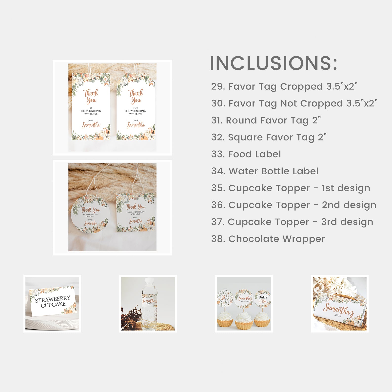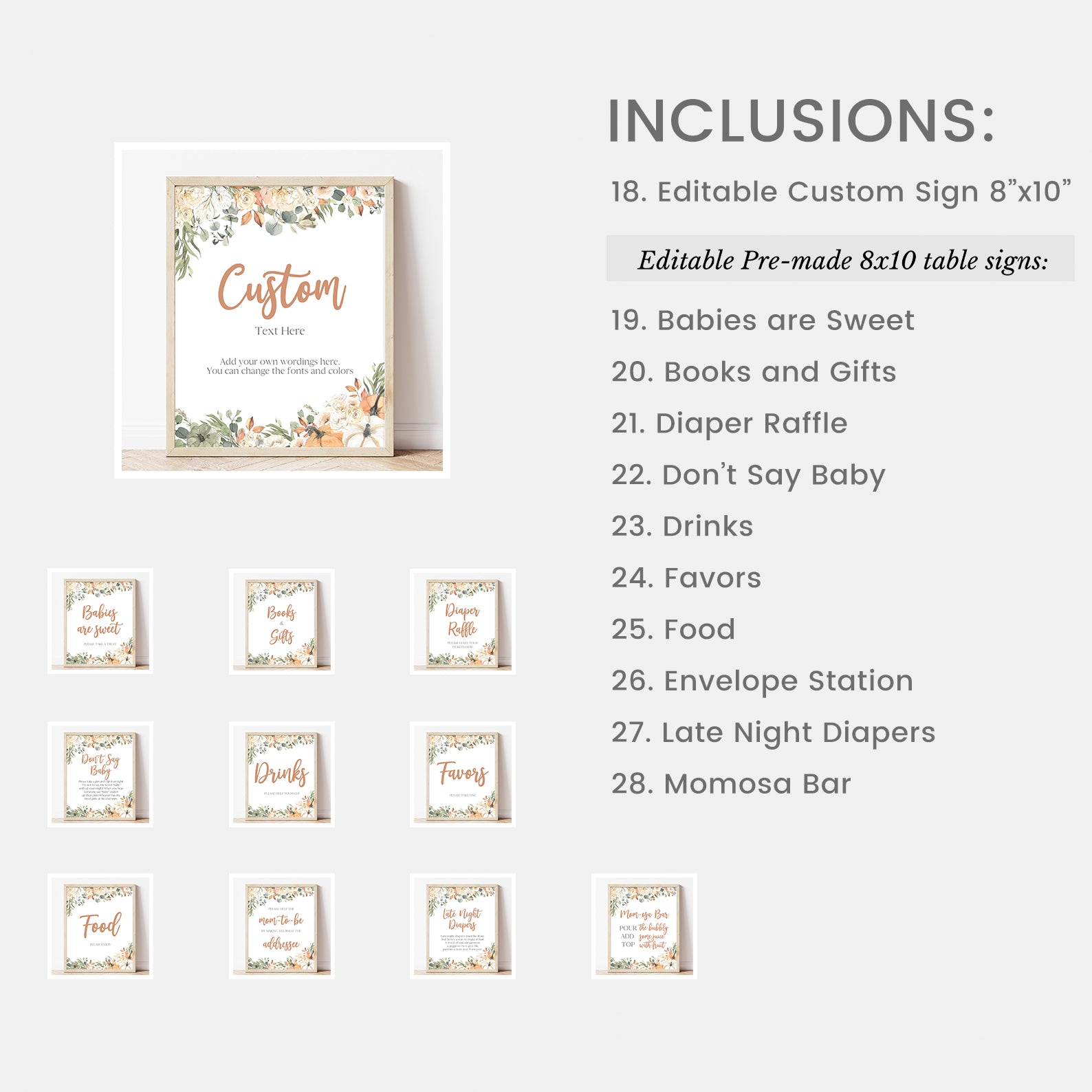 Create a picture-perfect baby shower with this 100-piece editable bundle. Featuring charming pumpkins, romantic roses, and lush green leaves, every item is beautifully themed for a fall celebration. From invitations and signs to favor tags, bottle labels, and games, this set covers every detail. Whether for a big bash or a small gathering, this bundle brings warmth, style, and seasonal magic to your special day.