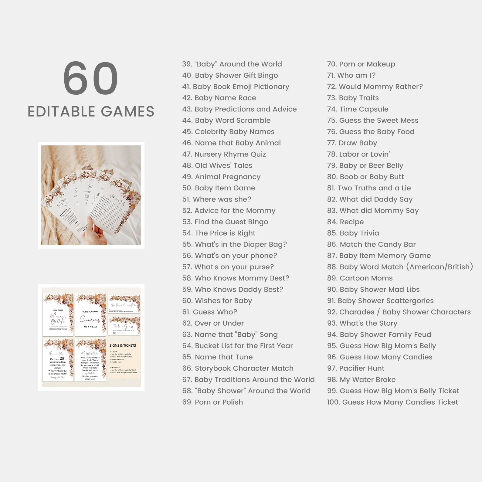Host a beautifully coordinated fall baby shower with this 100-piece editable mega bundle. Featuring soft watercolor pumpkins, warm florals, and golden foliage, this collection includes invitations, signs, tags, games, and more. From food labels to thank you cards, every item captures the magic of the season ideal for creating a heartfelt, stylish celebration from start to finish.