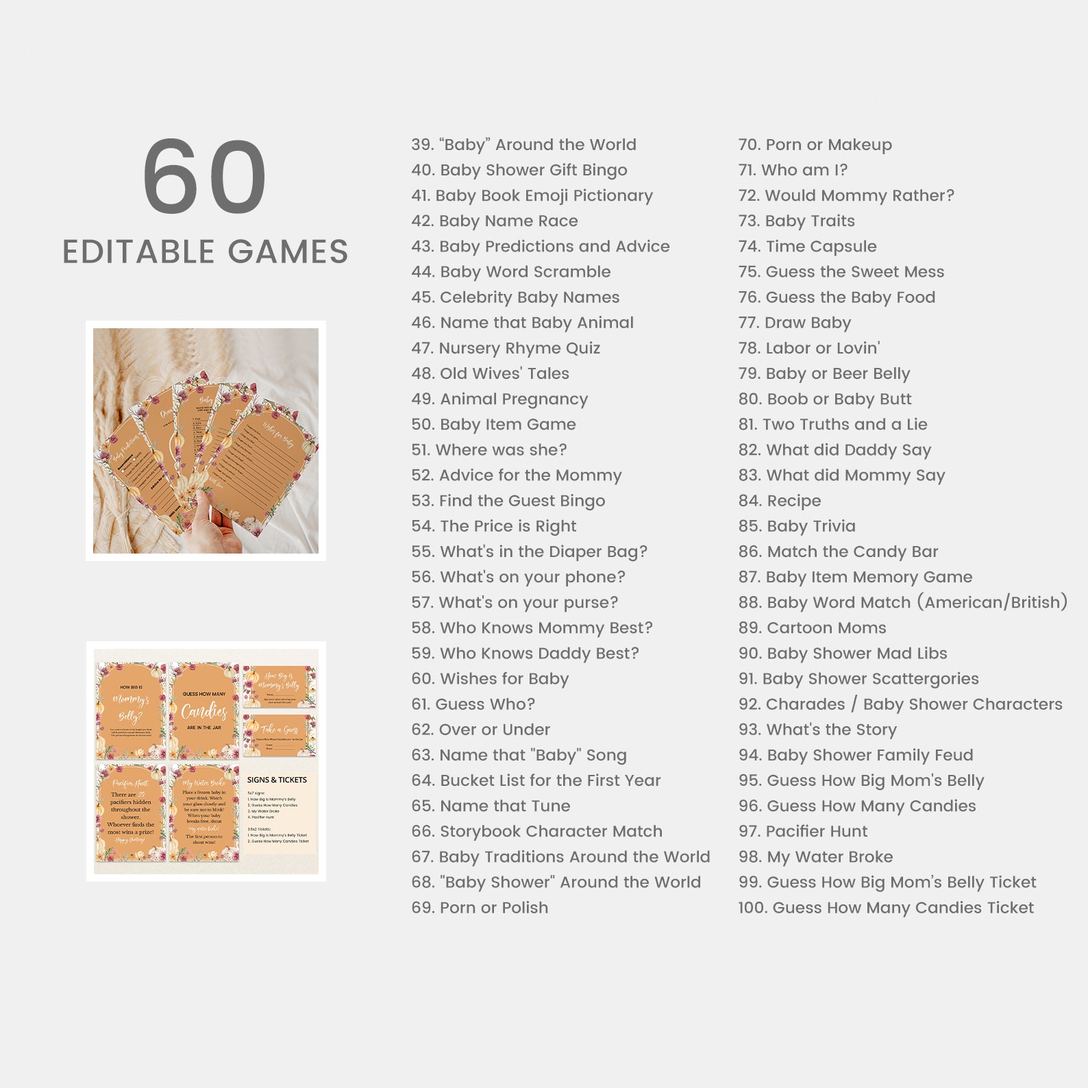 Celebrate your little pumpkin in style with this all-in-one Fall Baby Shower Mega Bundle! Packed with 100 editable items, it includes everything from invitations (plus mobile and backside versions), diaper raffle, books for baby, and thank you cards to party decor like a welcome sign, table signs, favor tags, labels, toppers, wrappers, and 60 themed games. Featuring watercolor pumpkins, florals, and soft arches in seasonal tones. This bundle is perfect for a festive and coordinated fall celebration!
