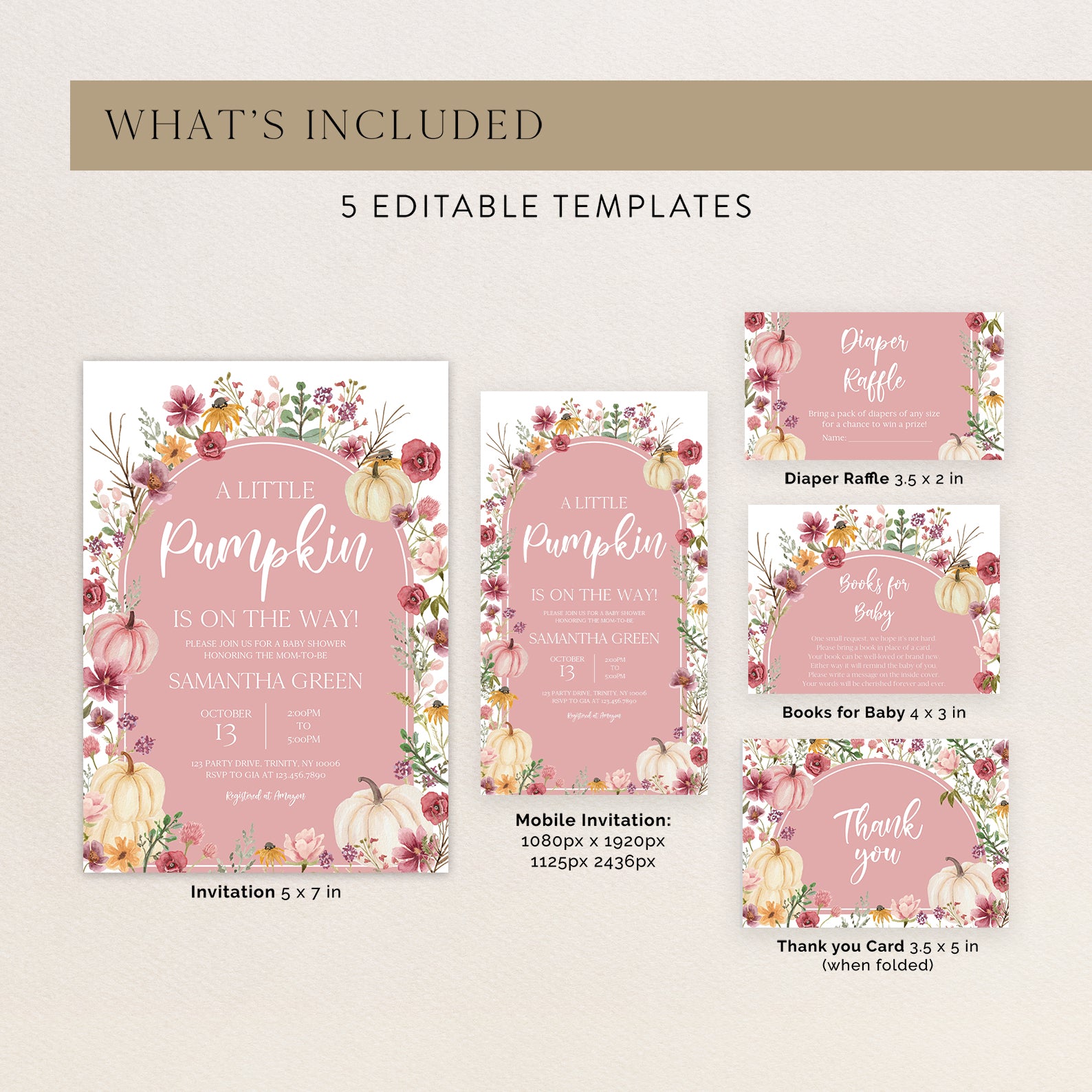 - Purchase this Fall Baby Shower Pink Invite Bundle: Pumpkin & Wildflowers Arch template