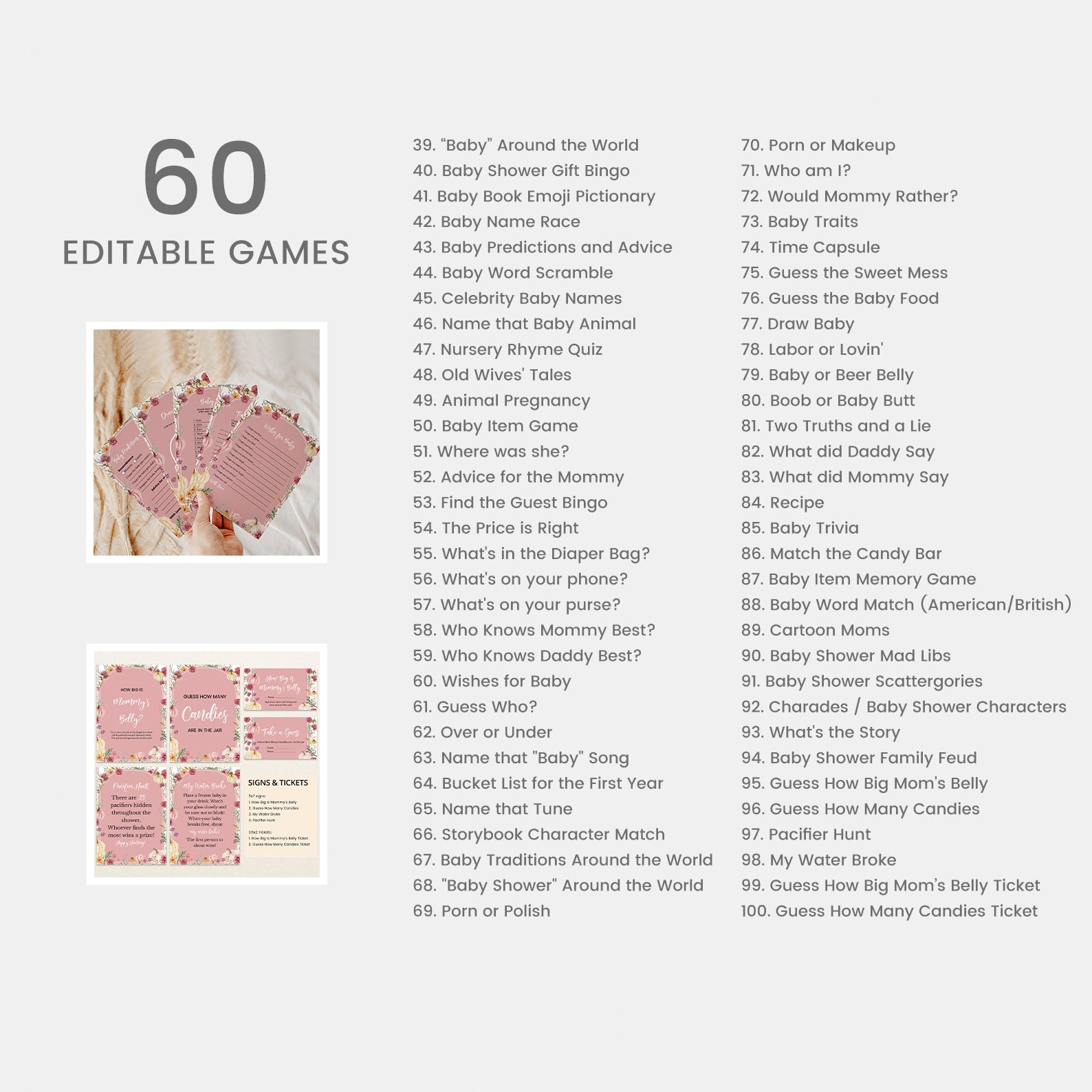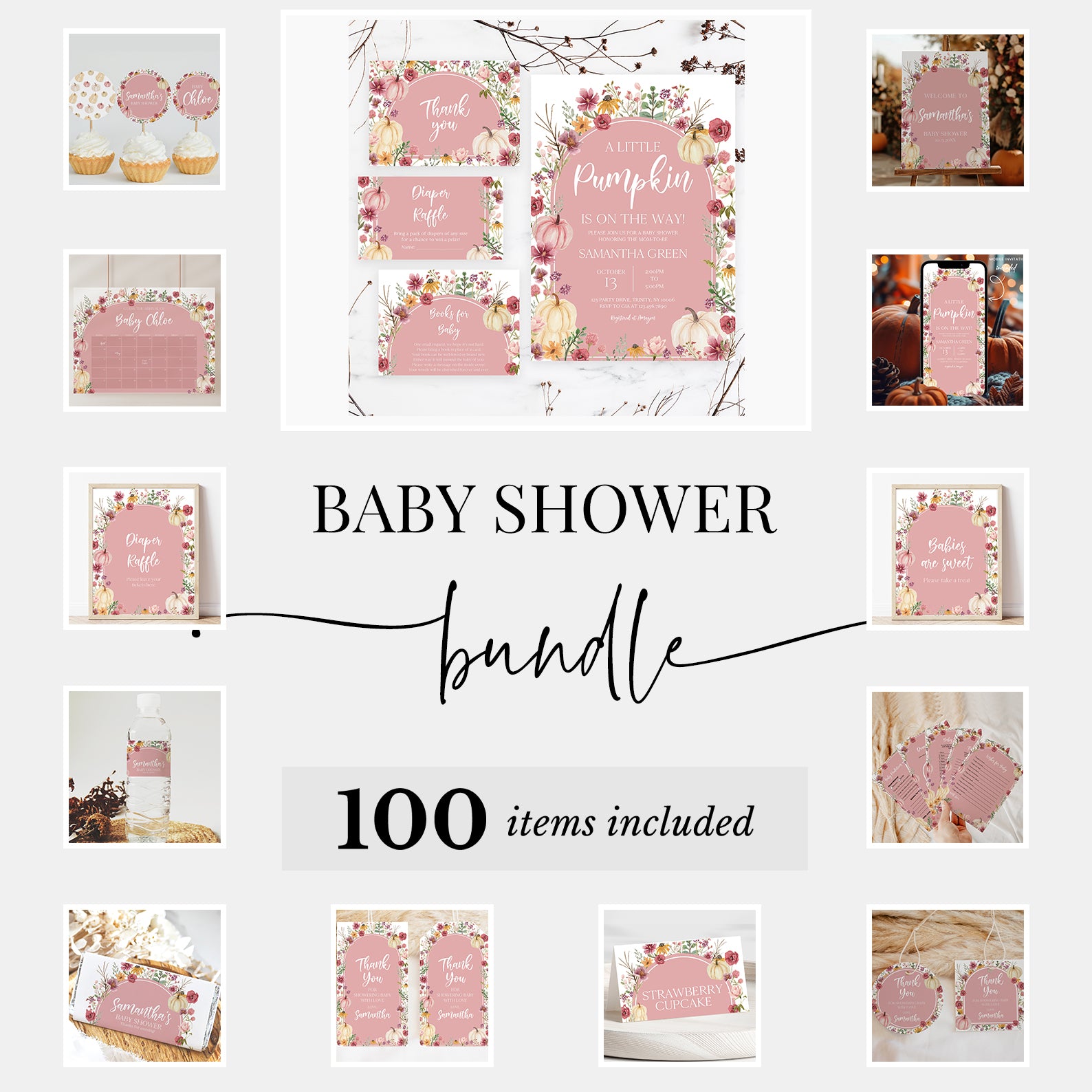 Celebrate your little pumpkin in style with this all-in-one Fall Baby Shower Mega Bundle! Packed with 100 editable items, it includes everything from invitations (plus mobile and backside versions), diaper raffle, books for baby, and thank you cards to party decor like a welcome sign, table signs, favor tags, labels, toppers, wrappers, and 60 themed games. Featuring watercolor pumpkins, florals, and soft arches in seasonal tones. This bundle is perfect for a festive and coordinated fall celebration!