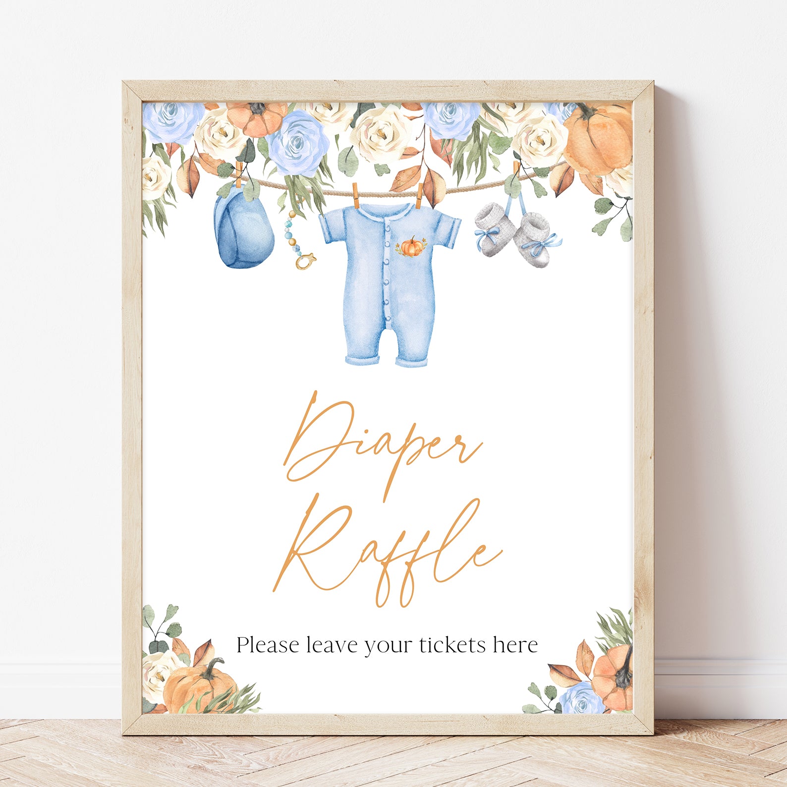 Add charm and organization to your fall baby shower with this set of ten editable table signs. Designed with soft watercolor florals, playful pumpkins, and sweet blue baby items, each sign coordinates perfectly with your cozy autumn theme. Includes signs for “Babies Are Sweet,” “Mom-osa Bar,” “Diaper Raffle,” and more. These thoughtful touches help guide guests while enhancing the warm and festive feel of your celebration.