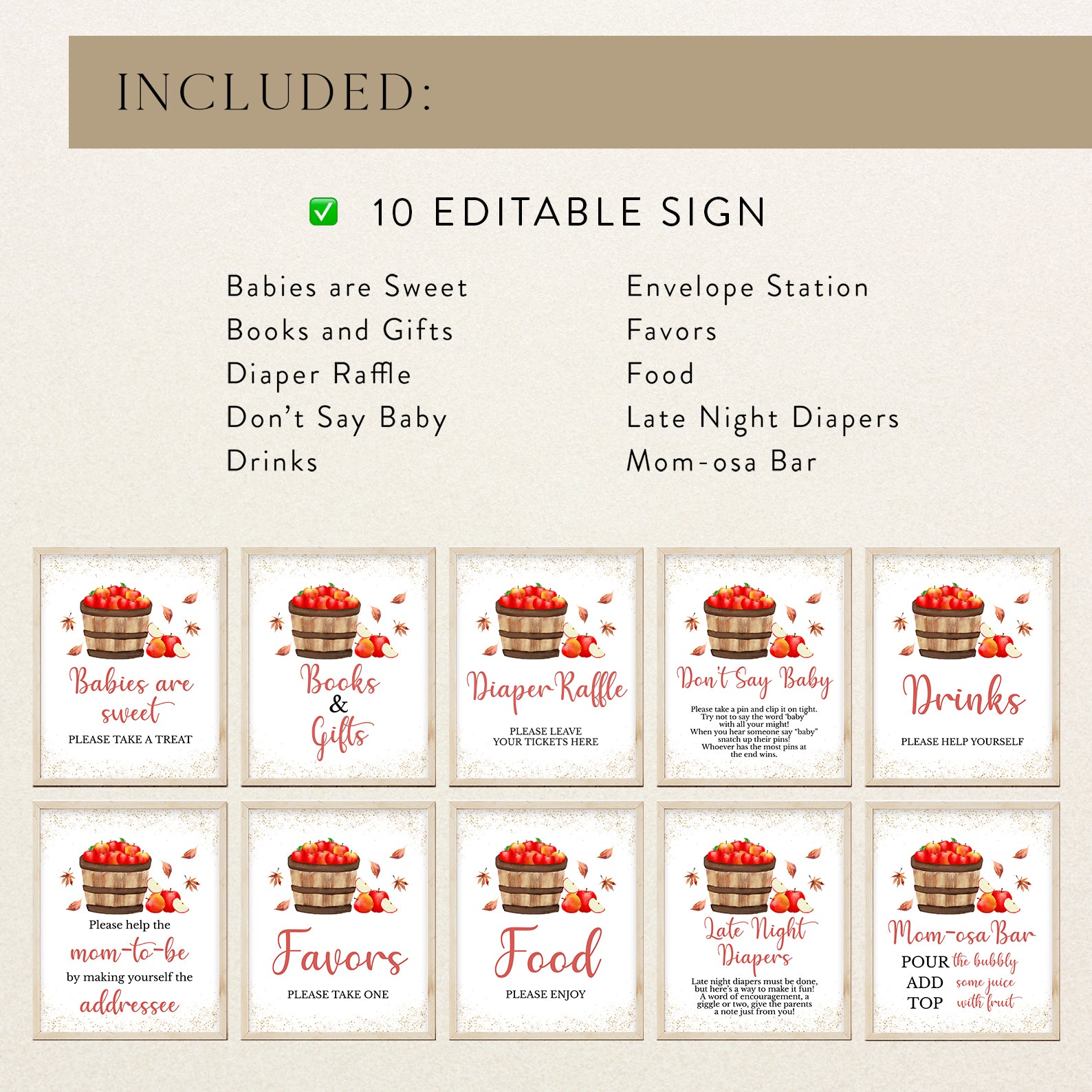 Welcome your guests with a warm, rustic charm using our editable table sign set, featuring designs like Babies Are Sweet, Books and Gifts, Diaper Raffle Sign, Don't Say Baby, Drinks Sign, Envelope Station, Favors, Food Sign, Late Night Diapers, and Mom-osa Bar. Each sign showcases sparkling gold accents paired with a rustic wood barrel overflowing with fresh apples and vibrant autumn leaves, perfectly capturing the cozy spirit of fall for your special celebration.