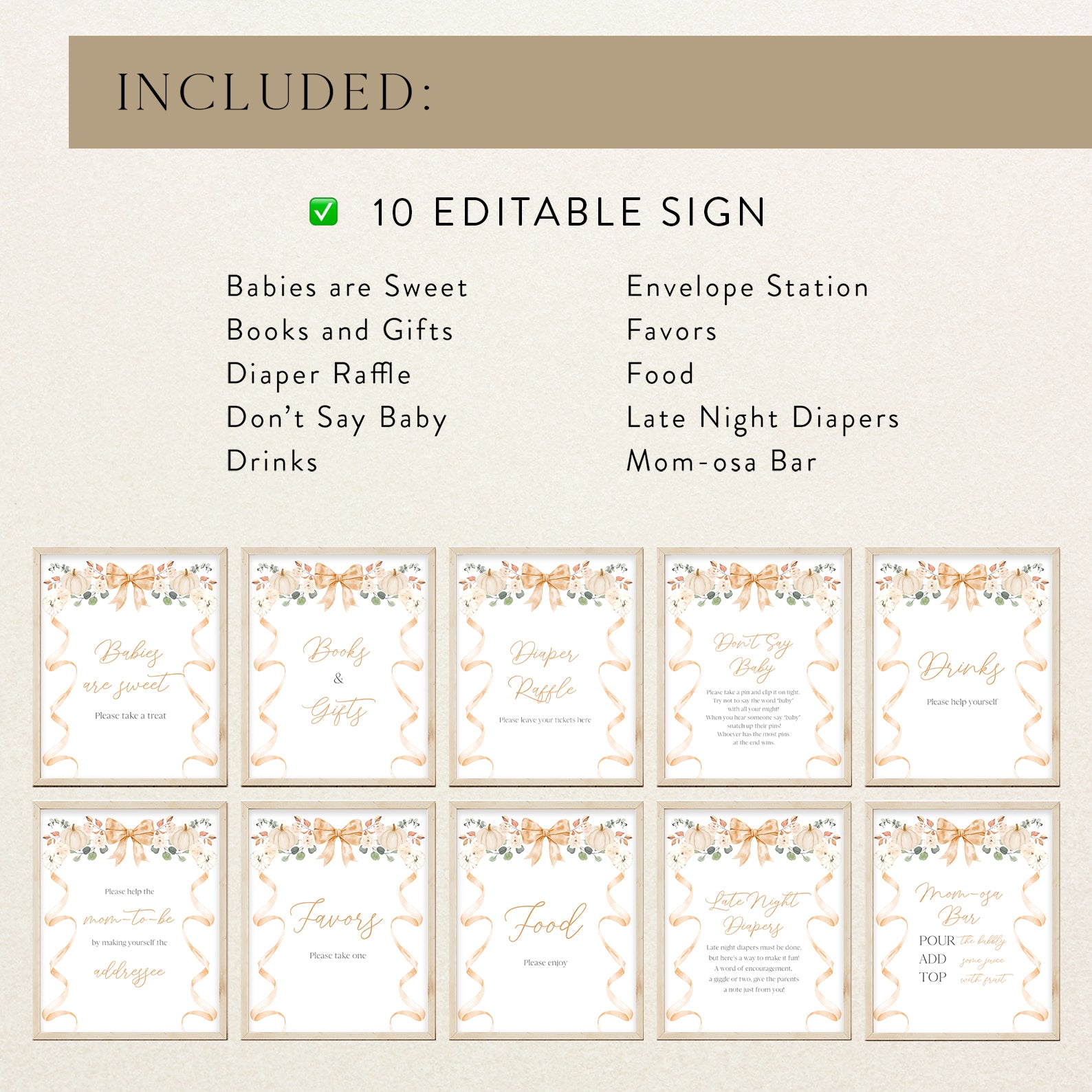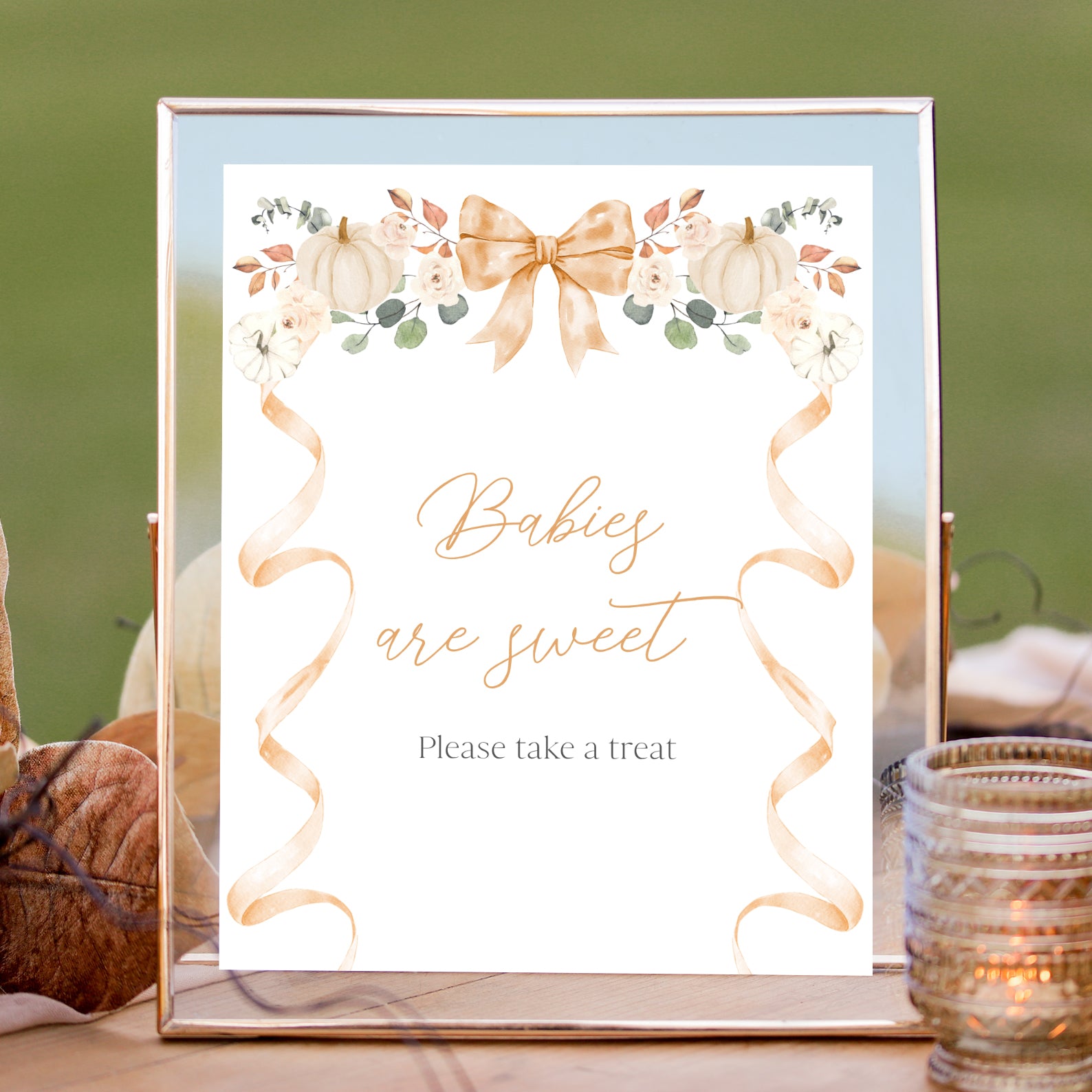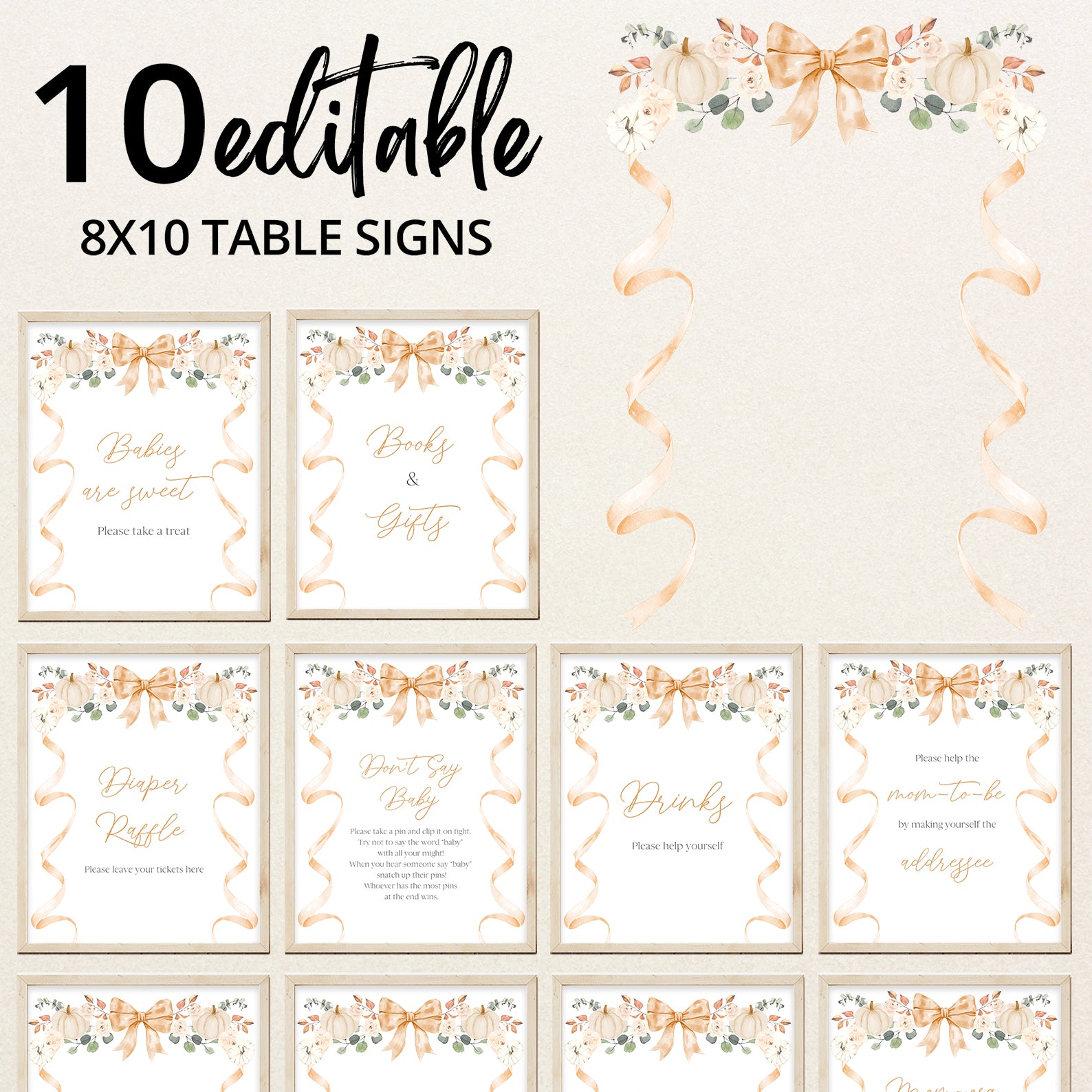 Add a festive touch to your baby shower with this editable table sign set, featuring ten essential signs for a well-organized celebration. Each design showcases a wavy ribbon border in your choice of green, orange, pink, or blue, paired with a centered pumpkin and floral motif. From “Babies Are Sweet” to “Mom-osa Bar,” these charming signs blend functionality with fall-inspired flair to beautifully guide your guests.