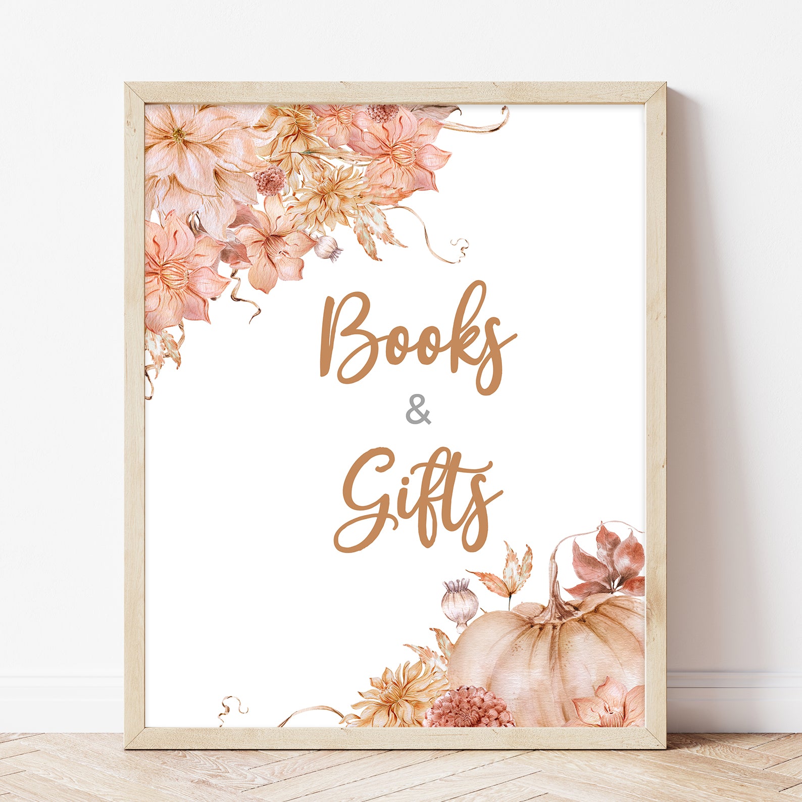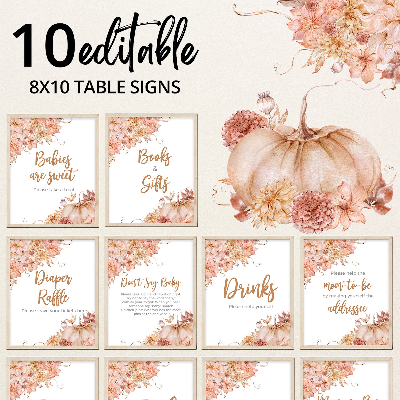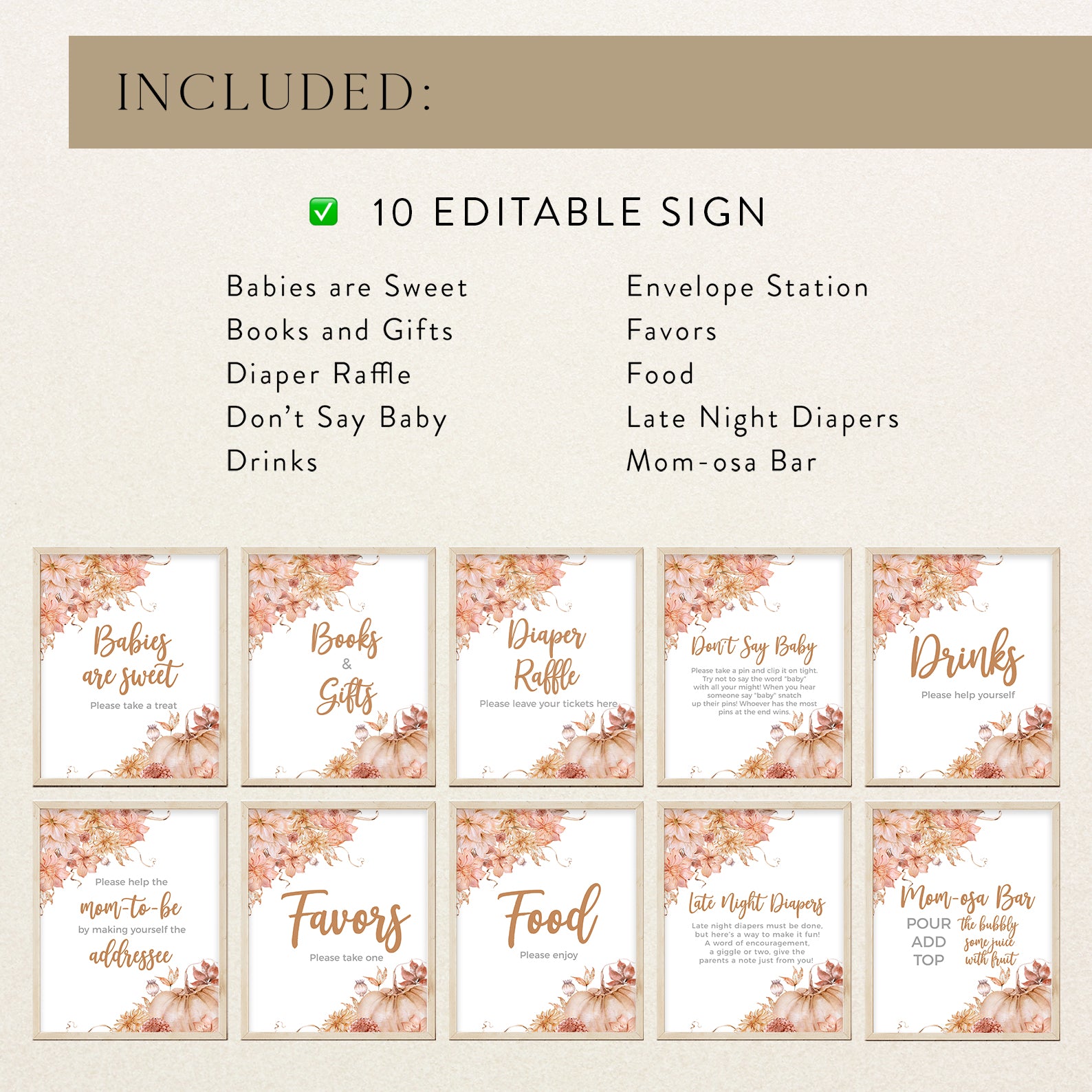 Add a cozy autumn touch to your baby shower with this set of 10 editable table signs. Featuring a soft pumpkin theme with floral borders in muted fall tones, each sign from “Books and Gifts” to “Mom-osa Bar” adds charm and clarity to your setup. The delicate design brings warmth and style, creating a beautifully coordinated event space guests will love.