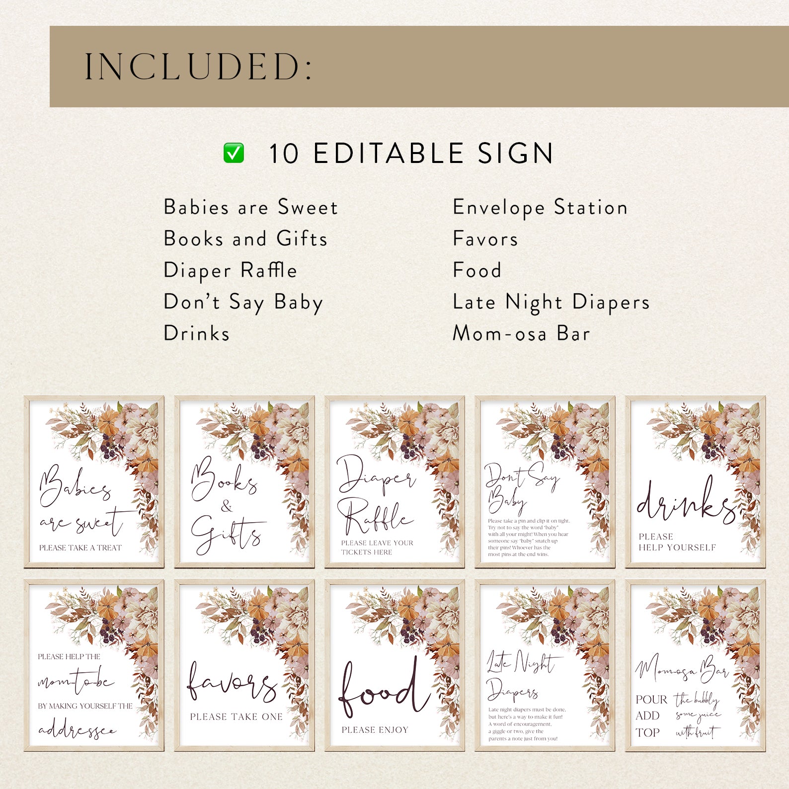 Elevate your fall baby shower with this set of 10 editable table signs, each featuring watercolor pumpkins, golden leaves, and rich seasonal florals. Designed to coordinate seamlessly, signs like “Mom-osa Bar,” “Books and Gifts,” and “Late Night Diapers” add both function and charm to your setup. With warm autumn tones and soft textures, these signs bring thoughtful, festive detail to every table.