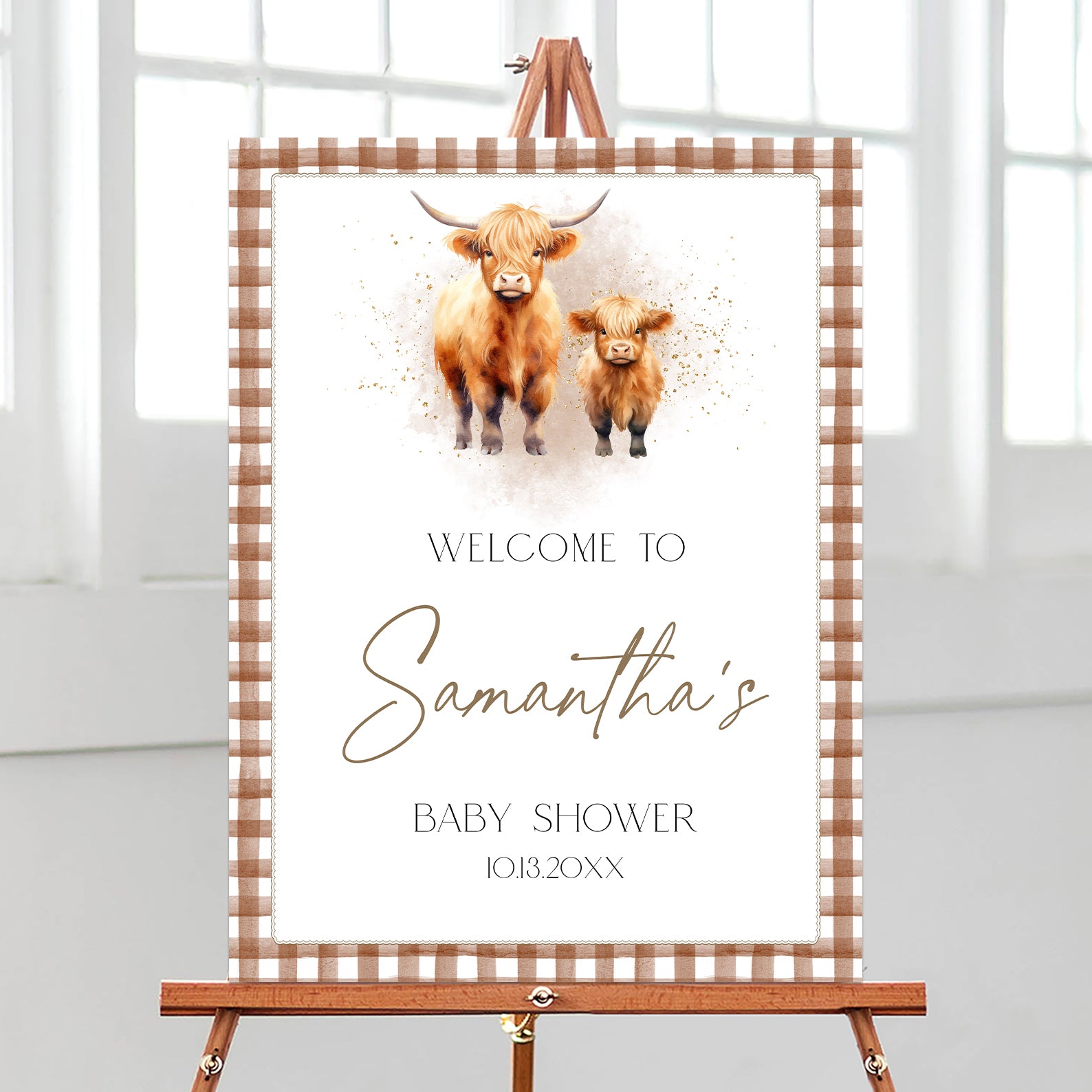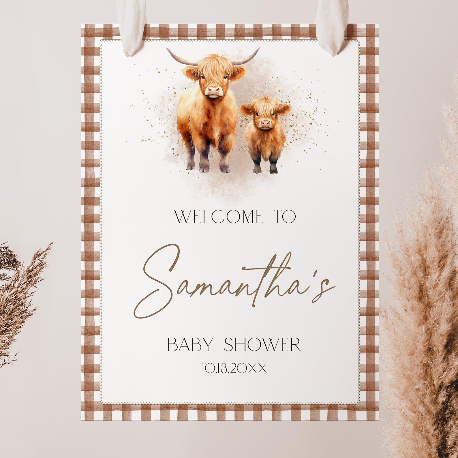 - Purchase this Fall Baby Shower Welcome Sign: Highland Cows & Brown Plaid template