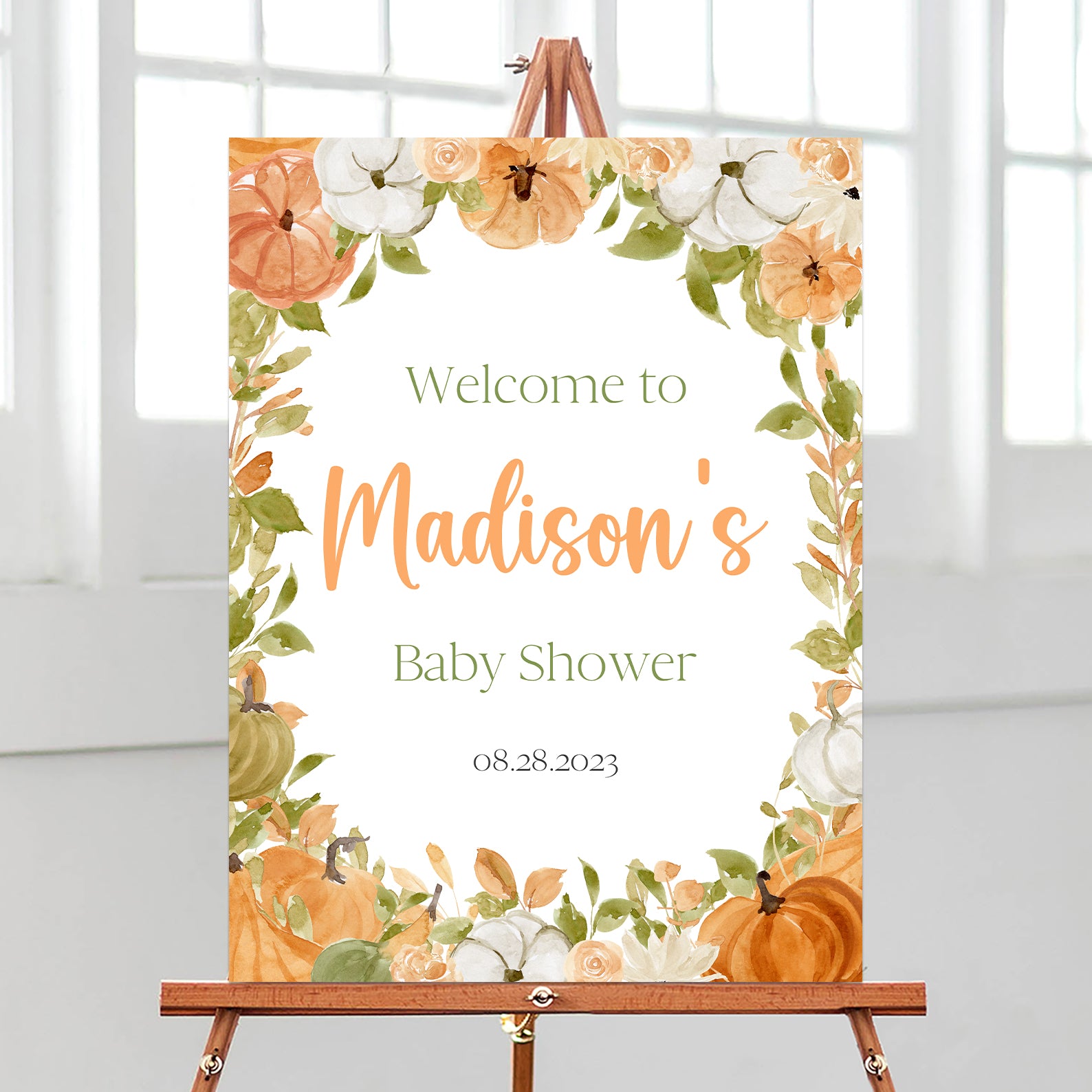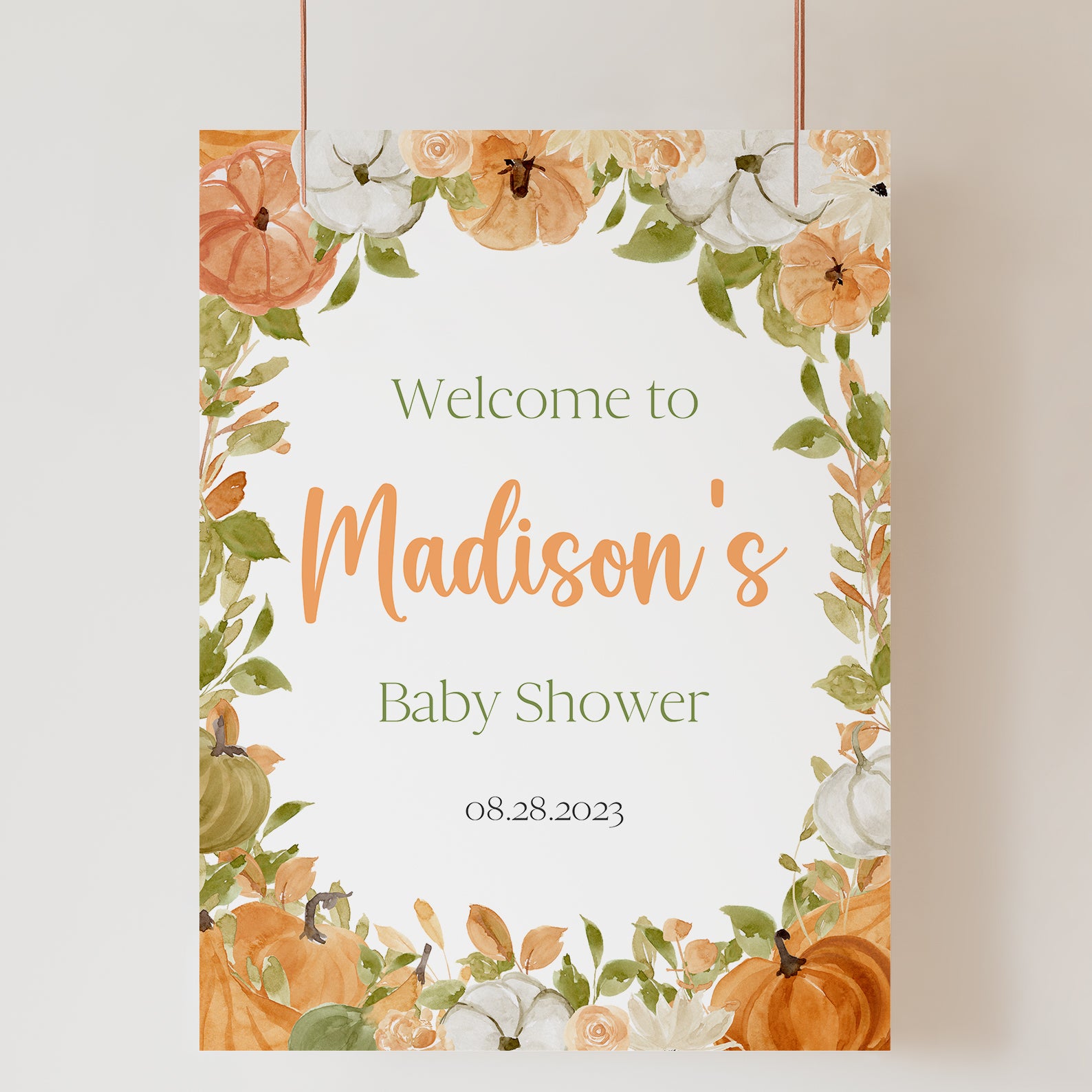 - Purchase this Fall Baby Shower Welcome Sign: Little Pumpkin with Pumpkin Border template