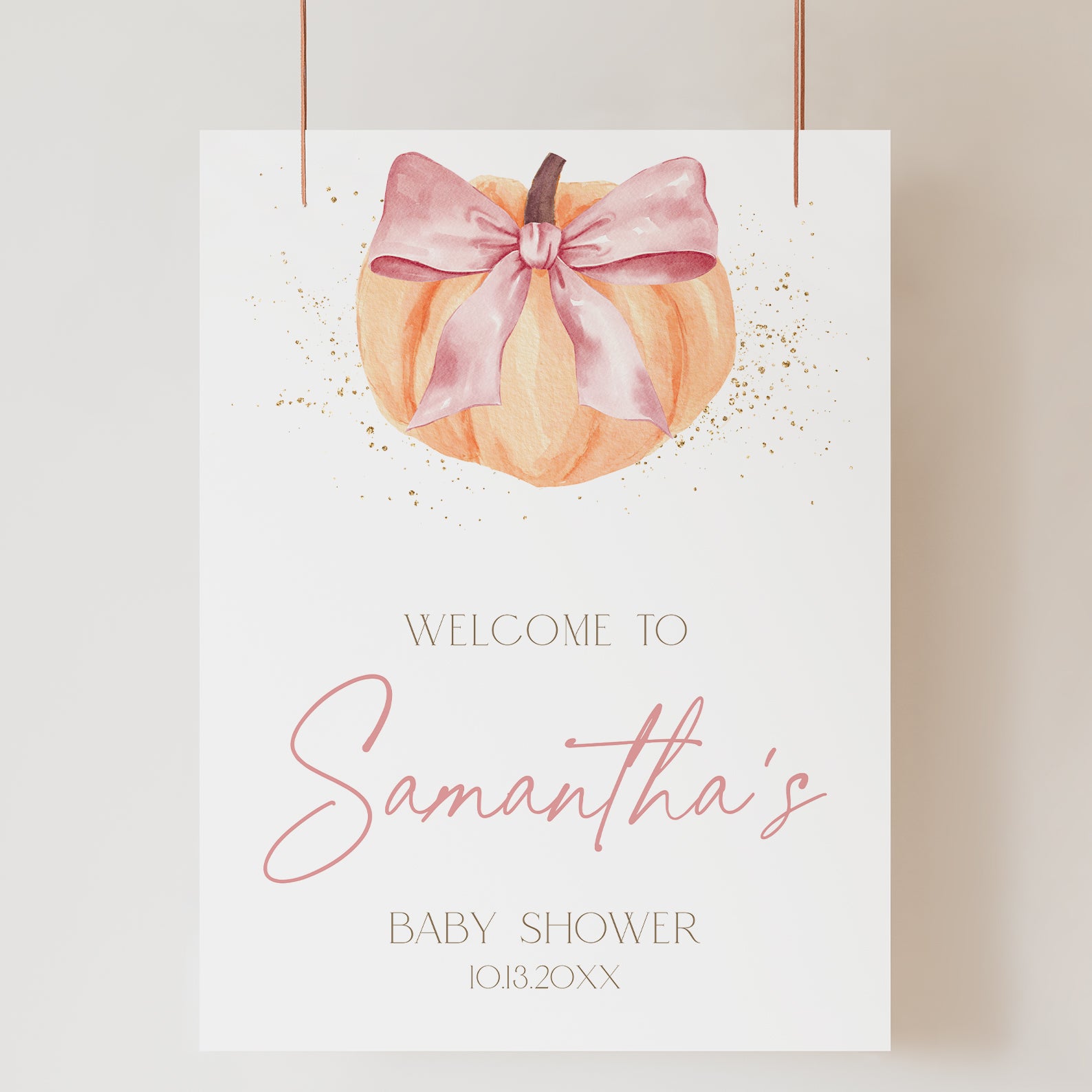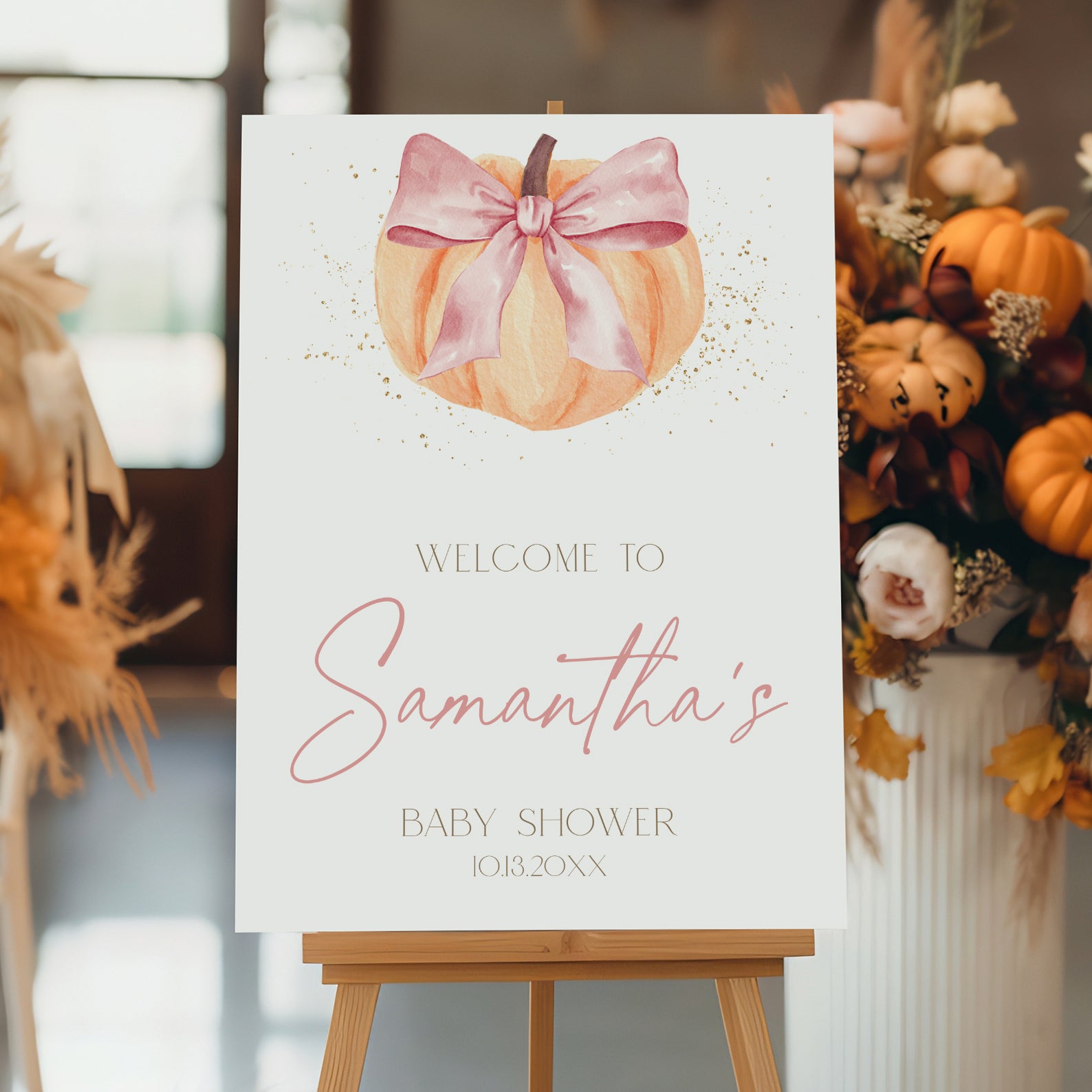 - Purchase this Fall Baby Shower Welcome Sign: Orange Pumpkin & Pink Ribbon template