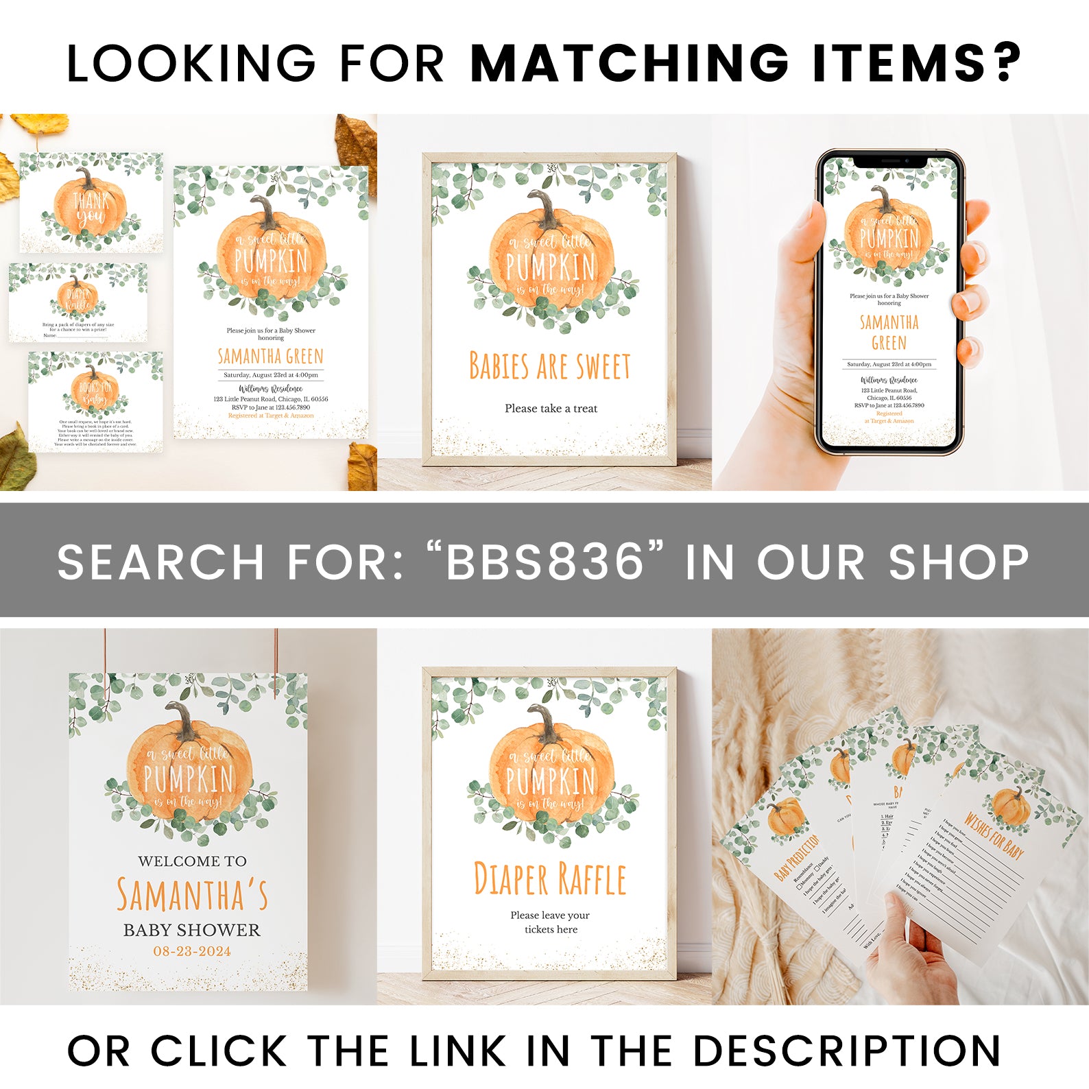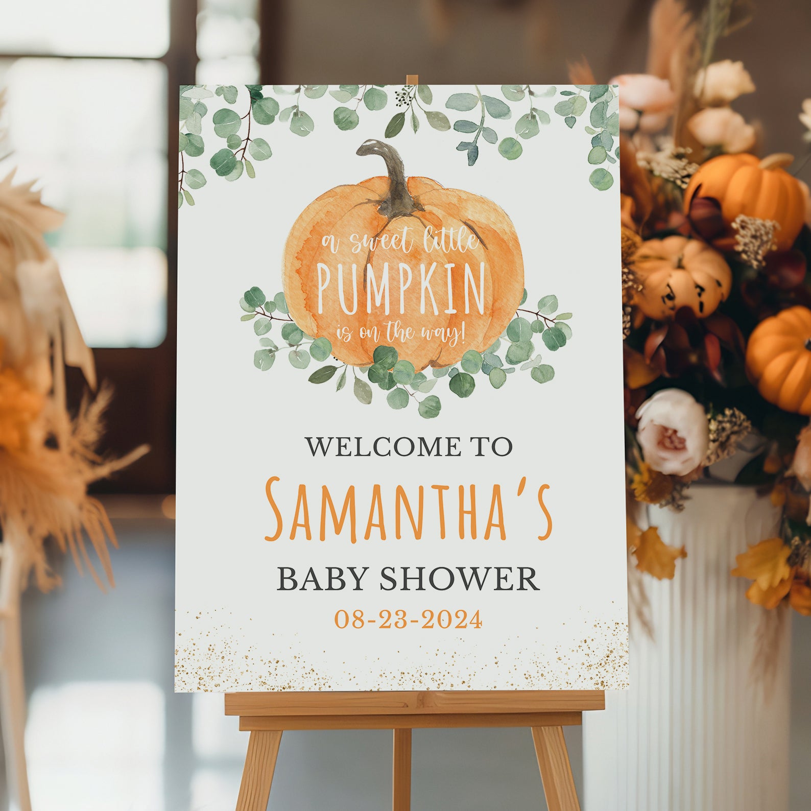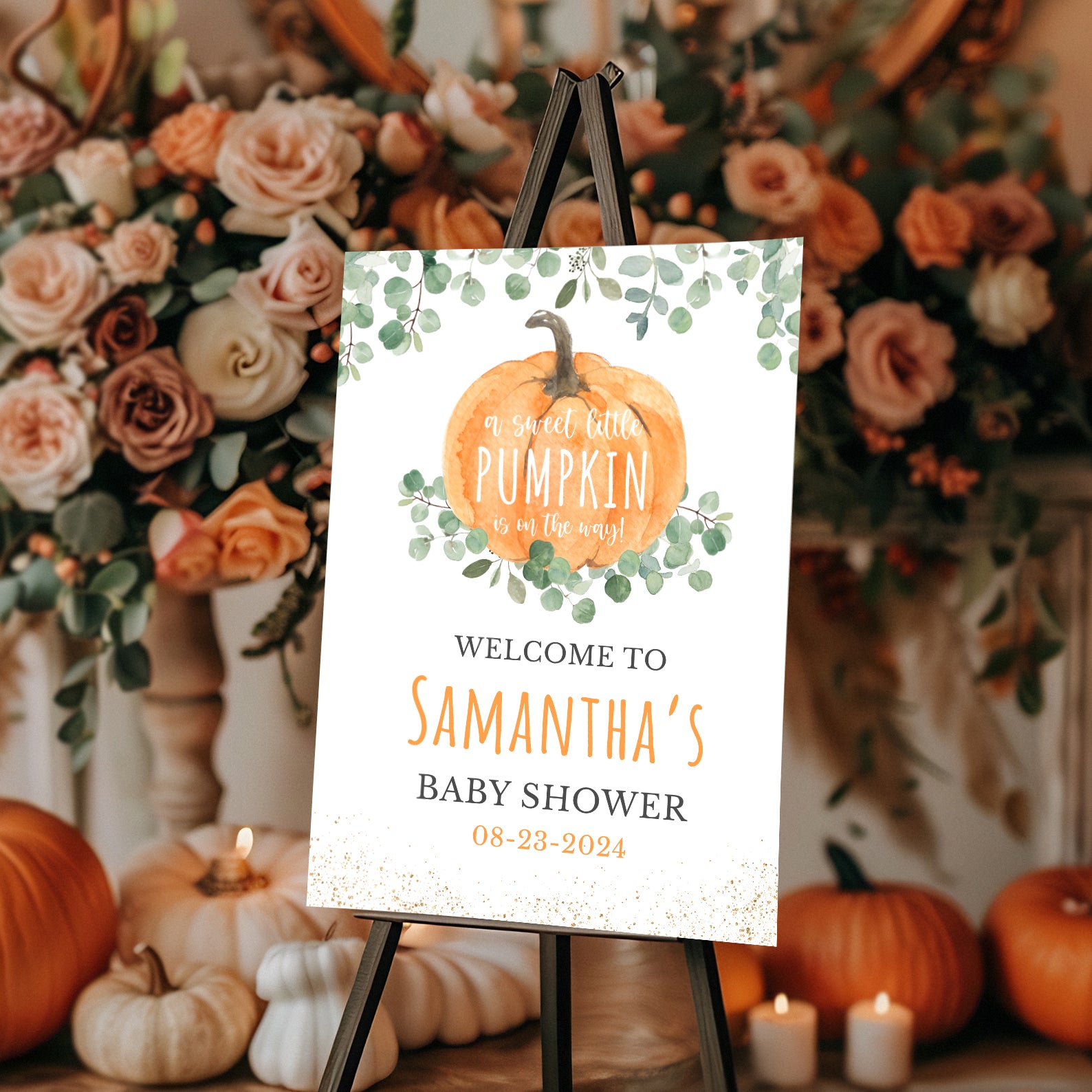 - Purchase this Fall Baby Shower Welcome Sign with Pumpkin, Green Leaves & Gold template