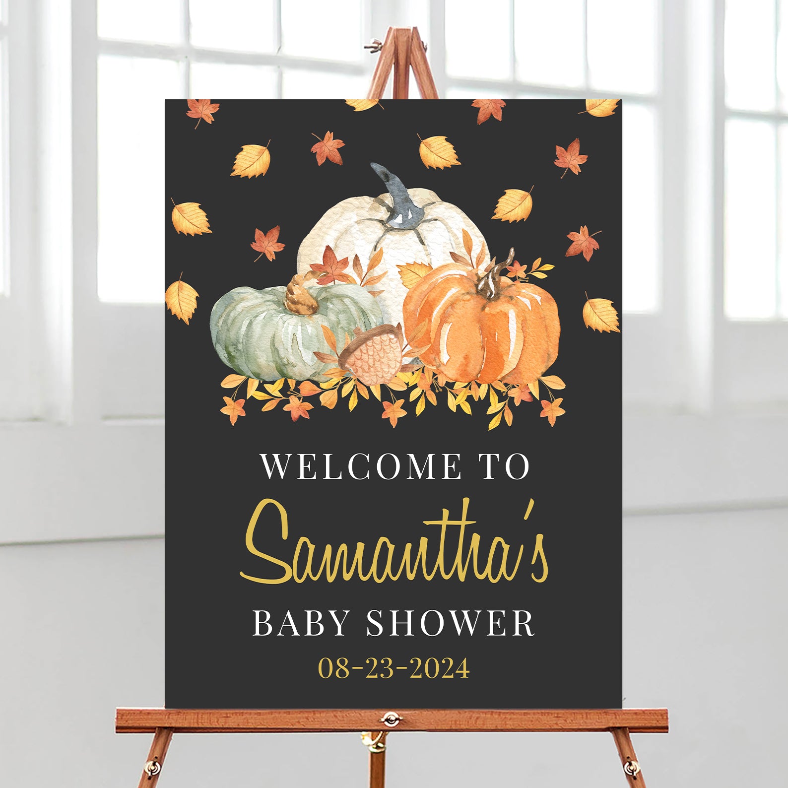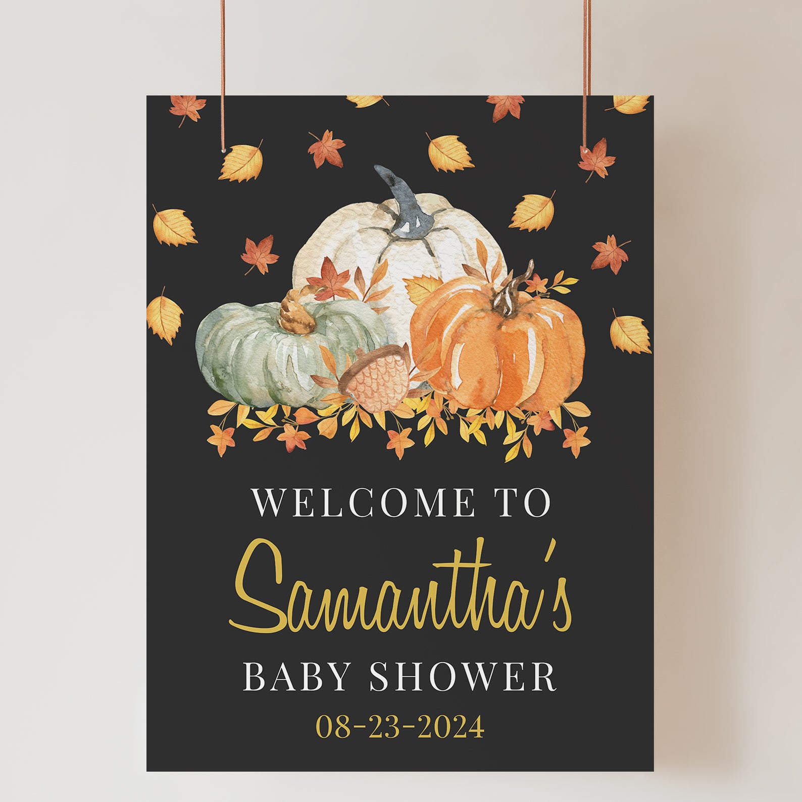 - Purchase this Fall in Love Baby Shower Welcome Sign: Pumpkins and Falling Leaves template