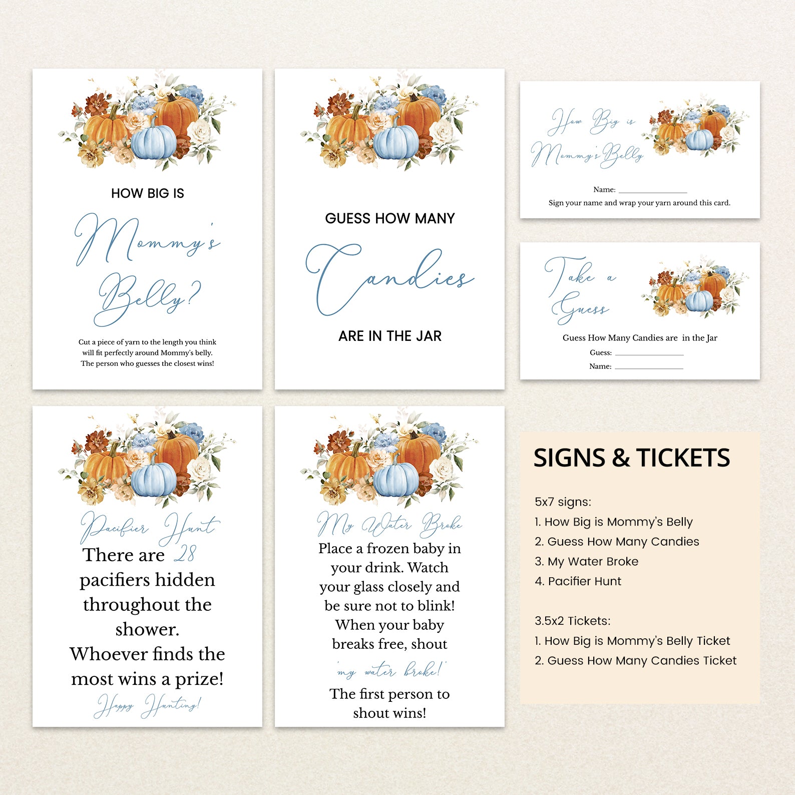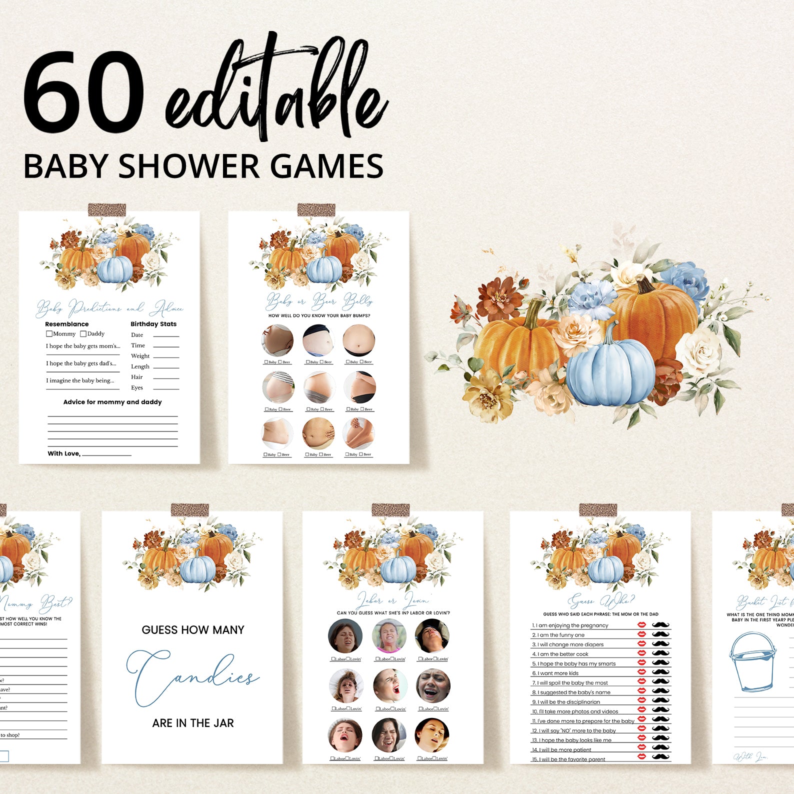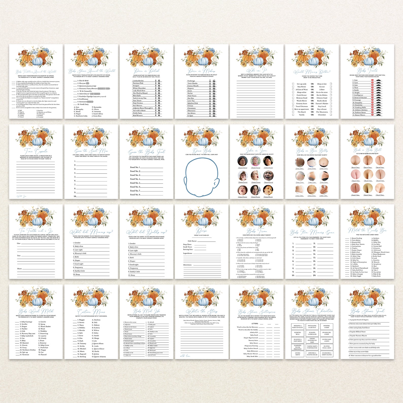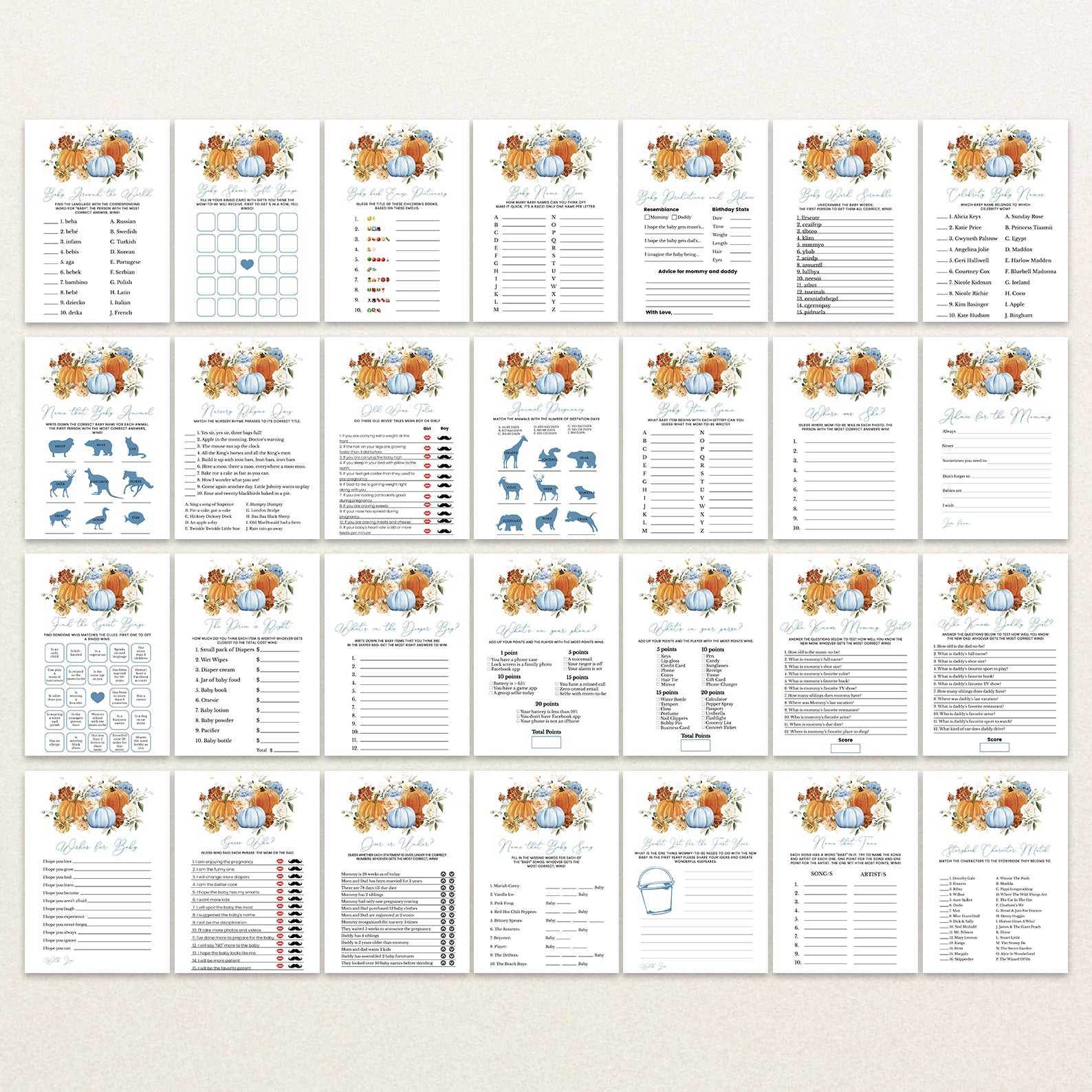 Make your fall baby shower unforgettable with our beautifully designed bundle of 60 editable baby shower games! Featuring a cozy autumn theme with vibrant orange and blue pumpkins, soft florals, and seasonal charm, this collection offers a wide variety of fun and engaging activities for your guests. From classics like Bingo and Word Scramble to unique games like Guess the Baby Food, each printable is easy to customize and perfect for celebrating your little pumpkin’s arrival!